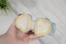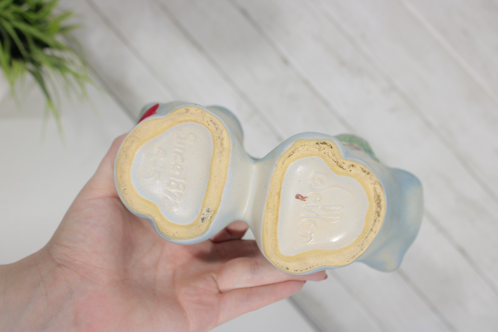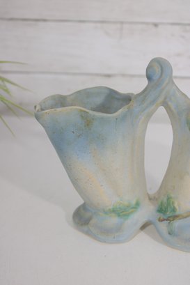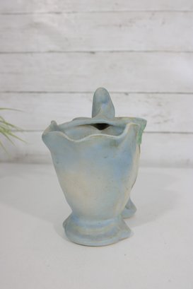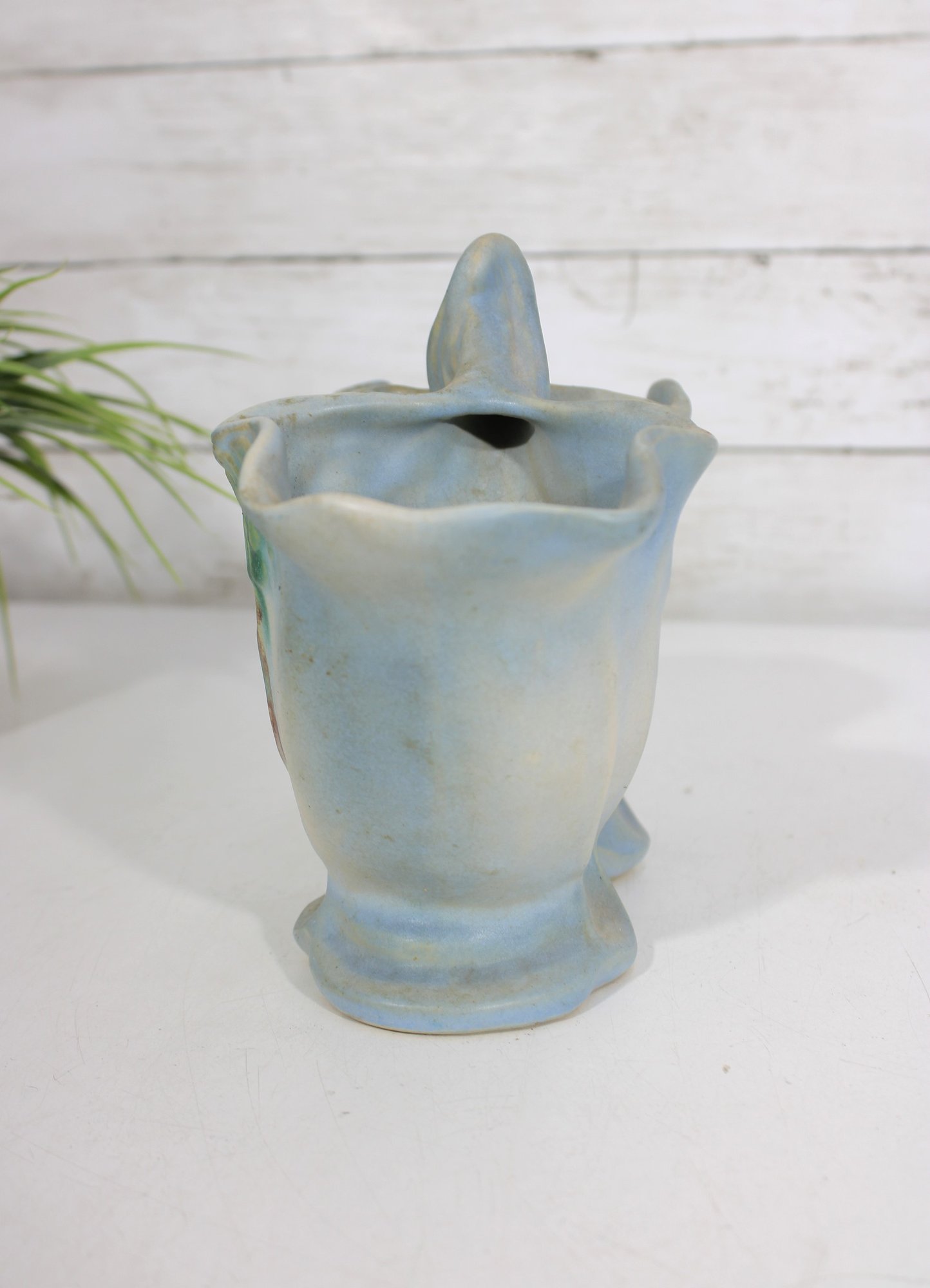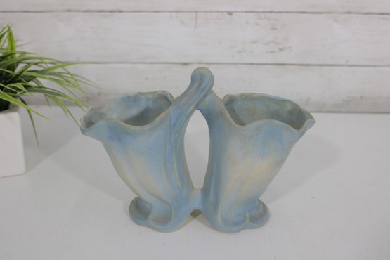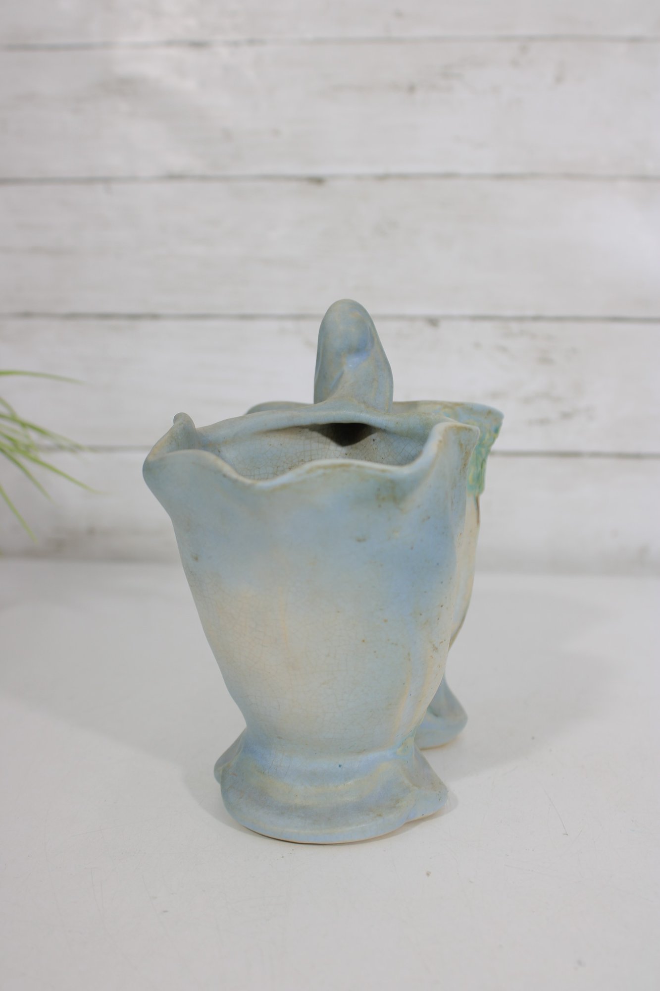 Beautiful vintage Weller pottery double bud vase featuring an elegant Art Nouveau-inspired design. The twin vase form is joined by a central handle, with softly scalloped rims and flowing lines that create a graceful, sculptural silhouette.