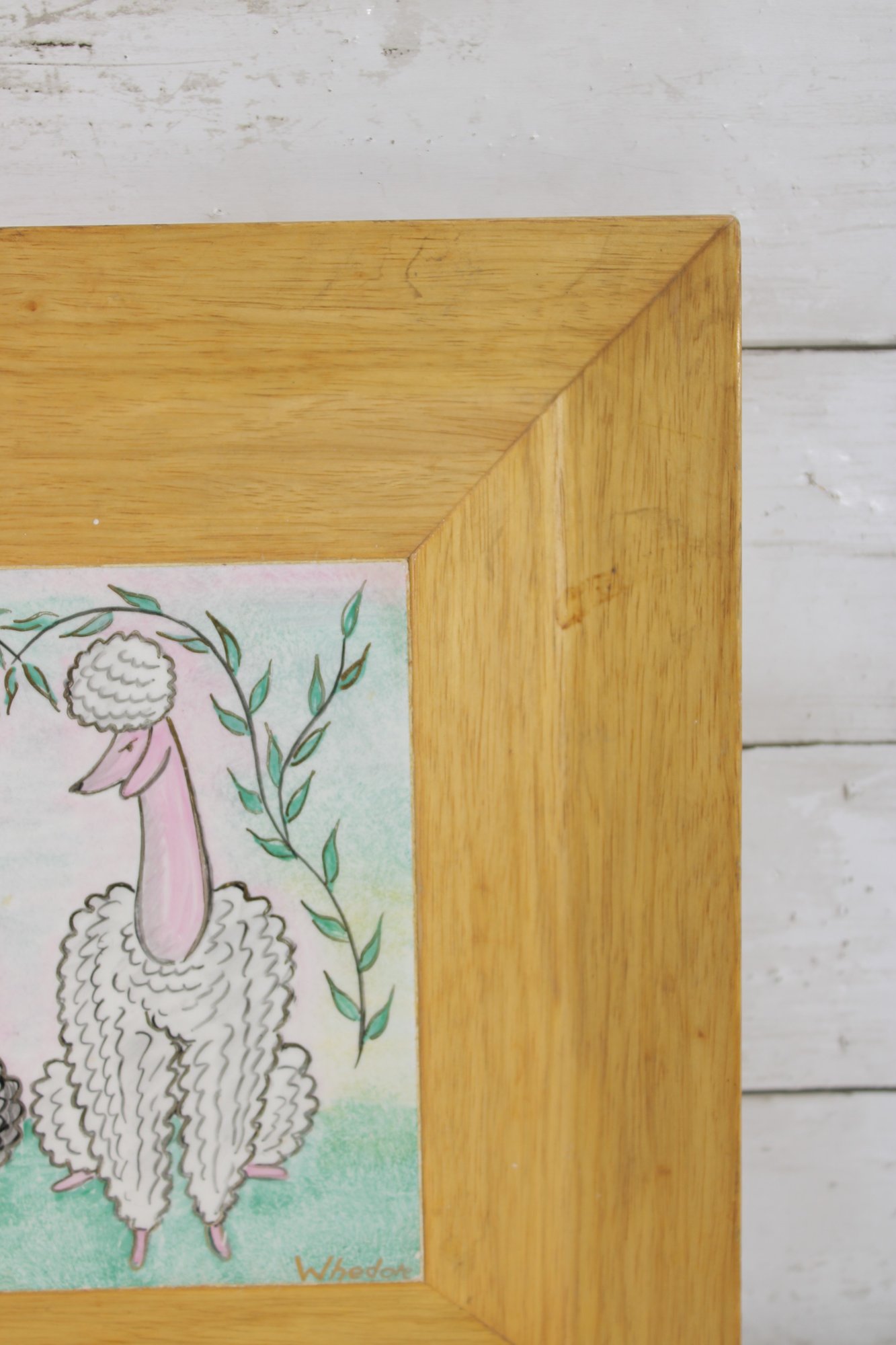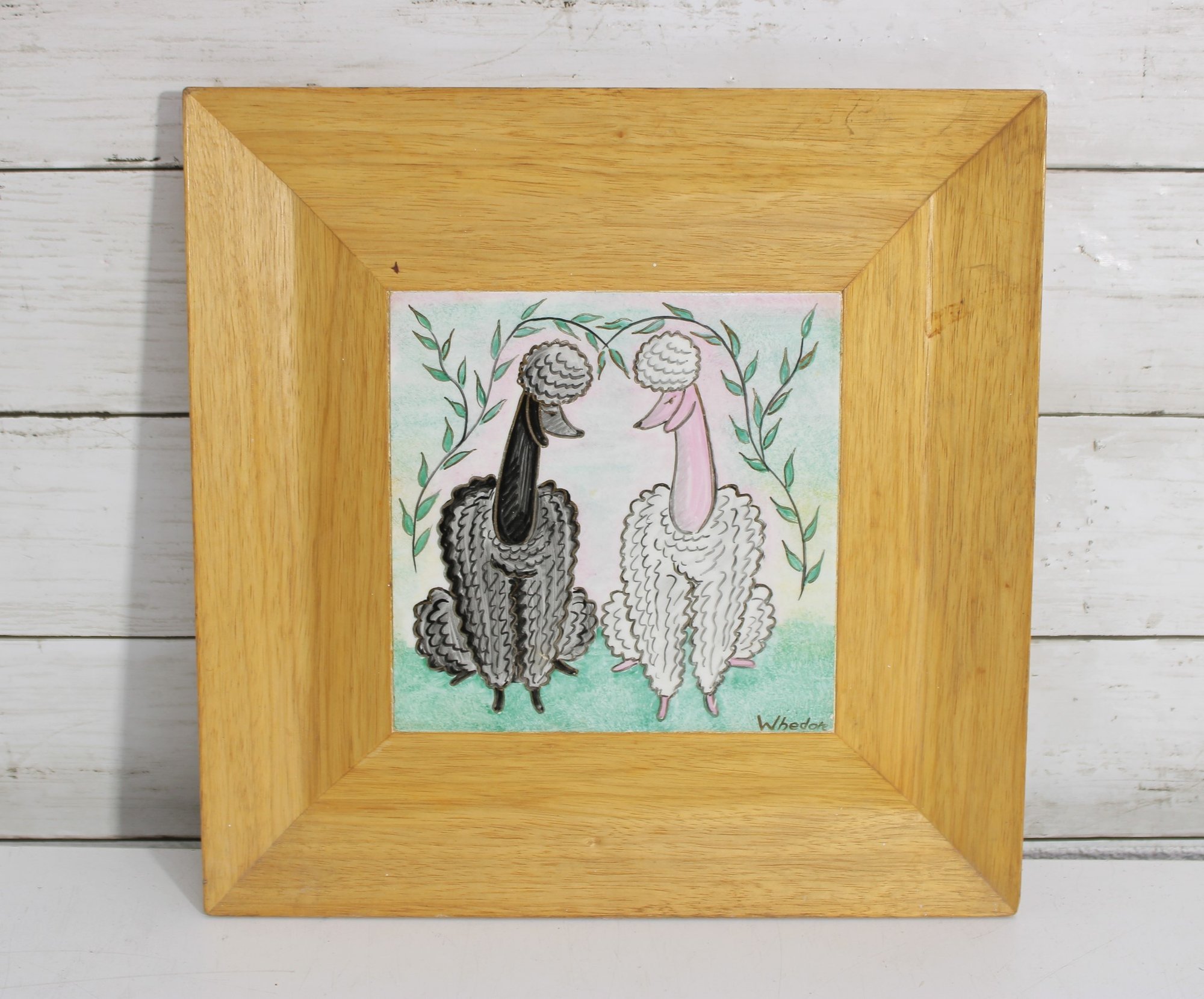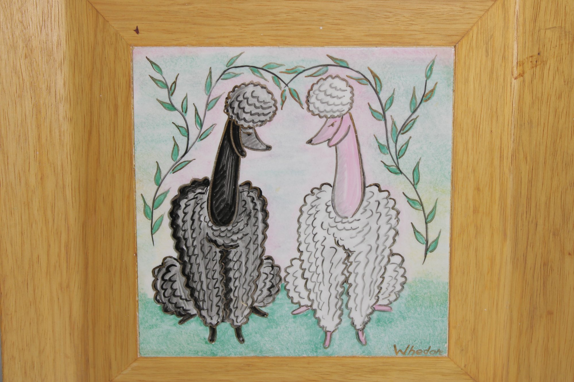 ceramic tile artwork signed “Whedore,” featuring two whimsical sheep rendered in a playful folk-art style. One sheep is depicted in dark tones and the other in soft white, both with textured, curly coats and stylized faces, standing together beneath leafy branches.