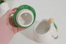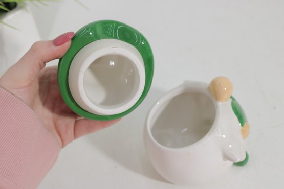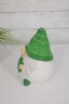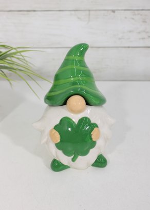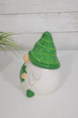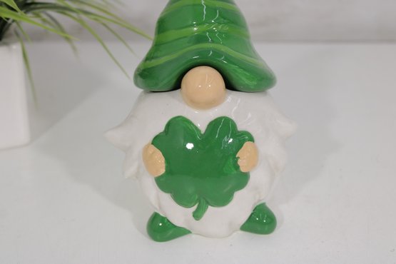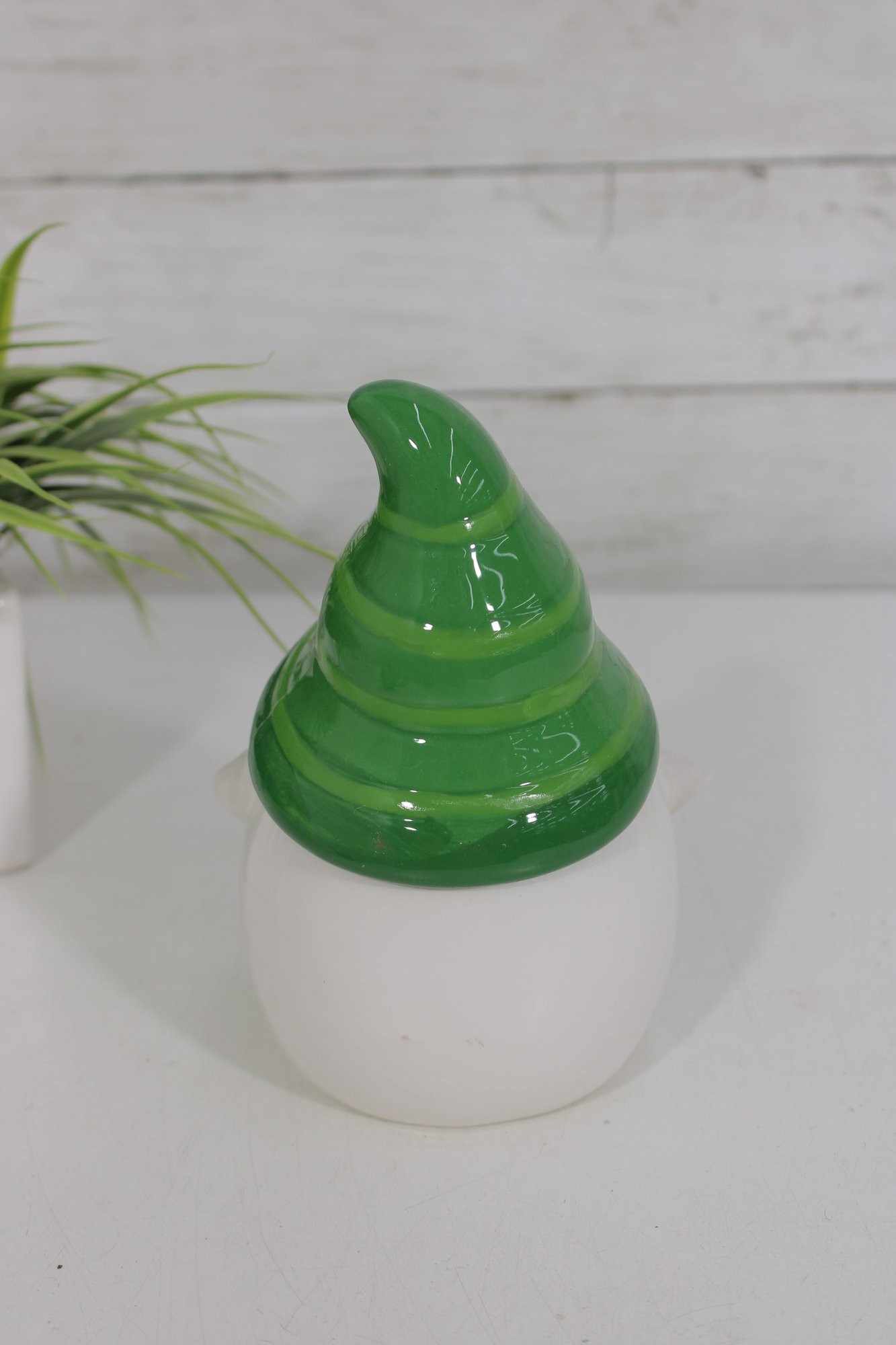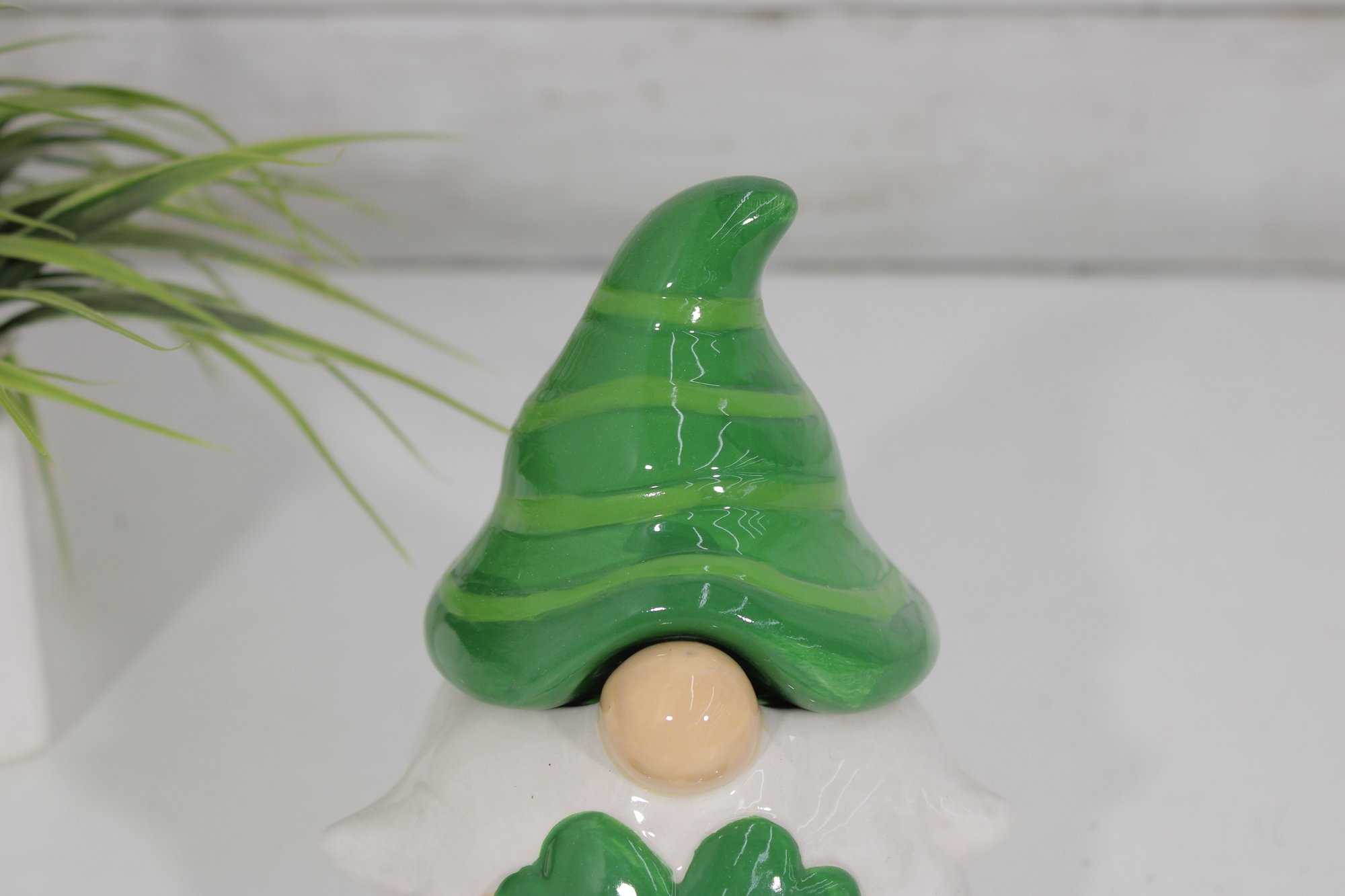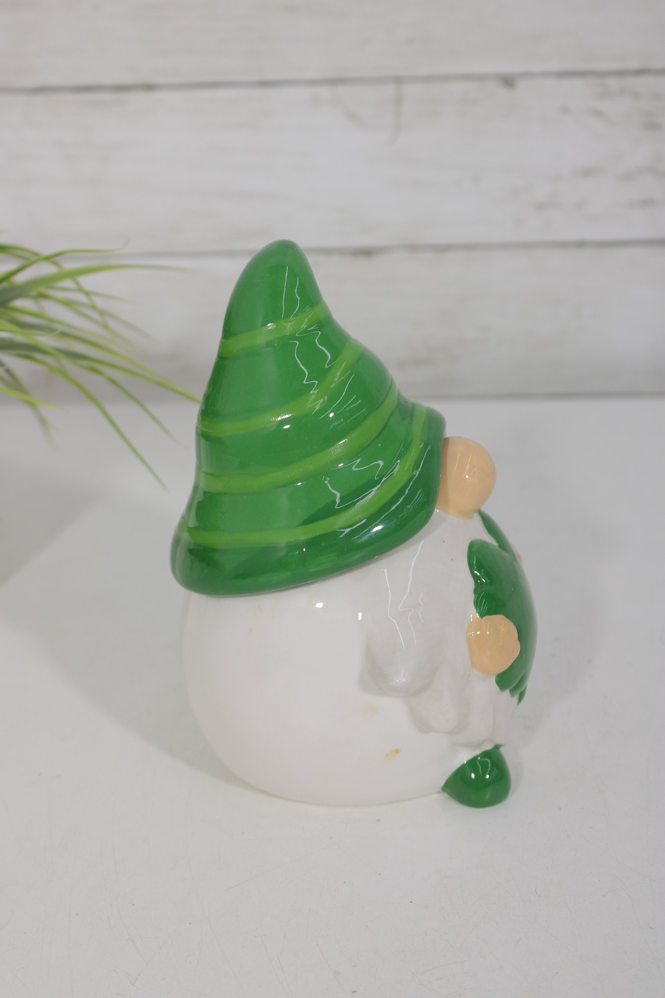 Charming ceramic trinket box by Whimsical Cupboard Company, featuring an adorable gnome holding a bright green clover. This playful design showcases a rounded gnome figure with a glossy finish, complete with a tall green hat that lifts off to reveal a hidden storage compartment inside.