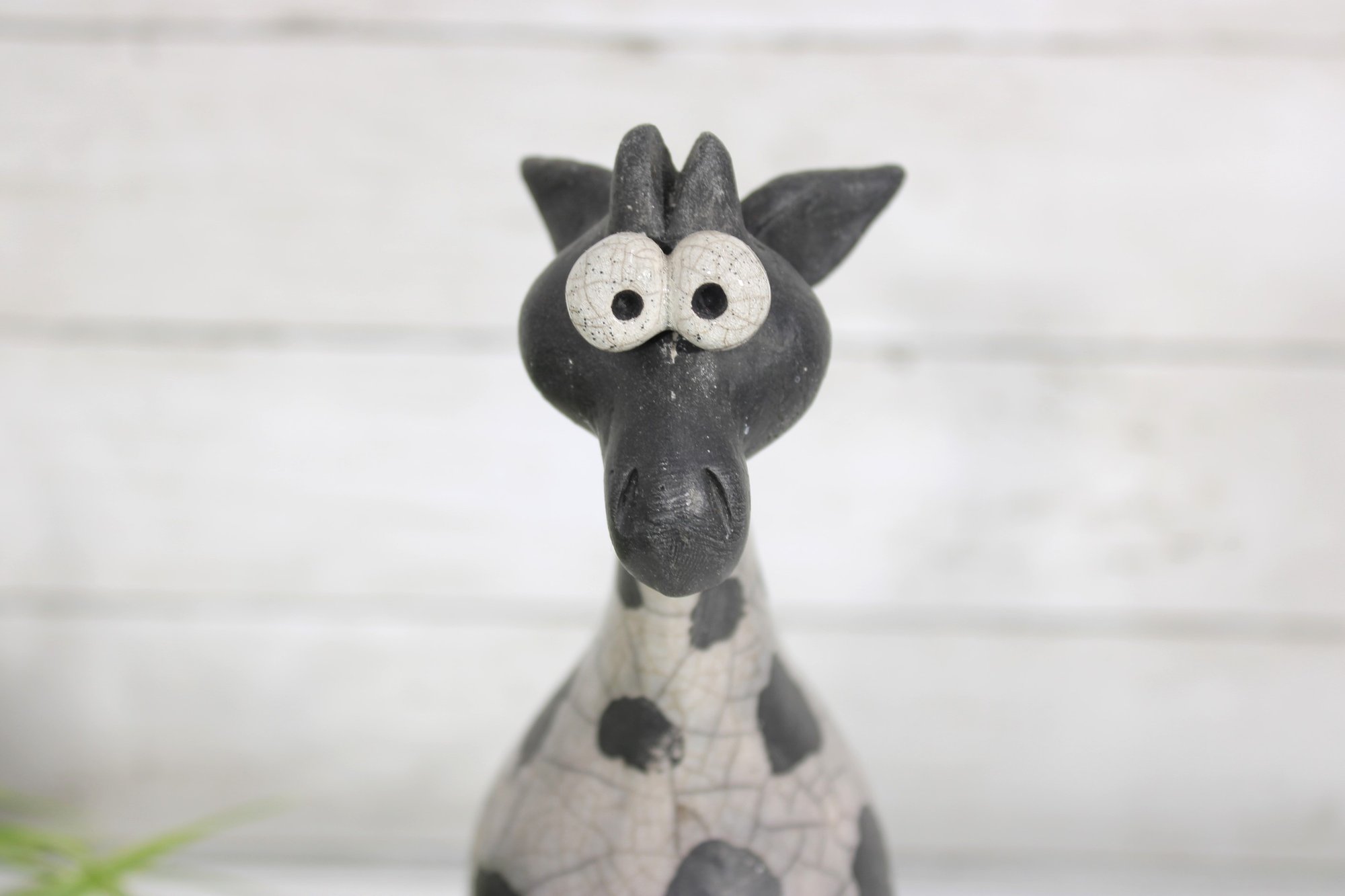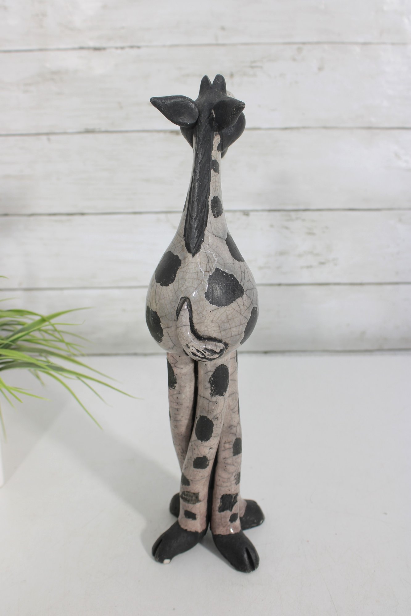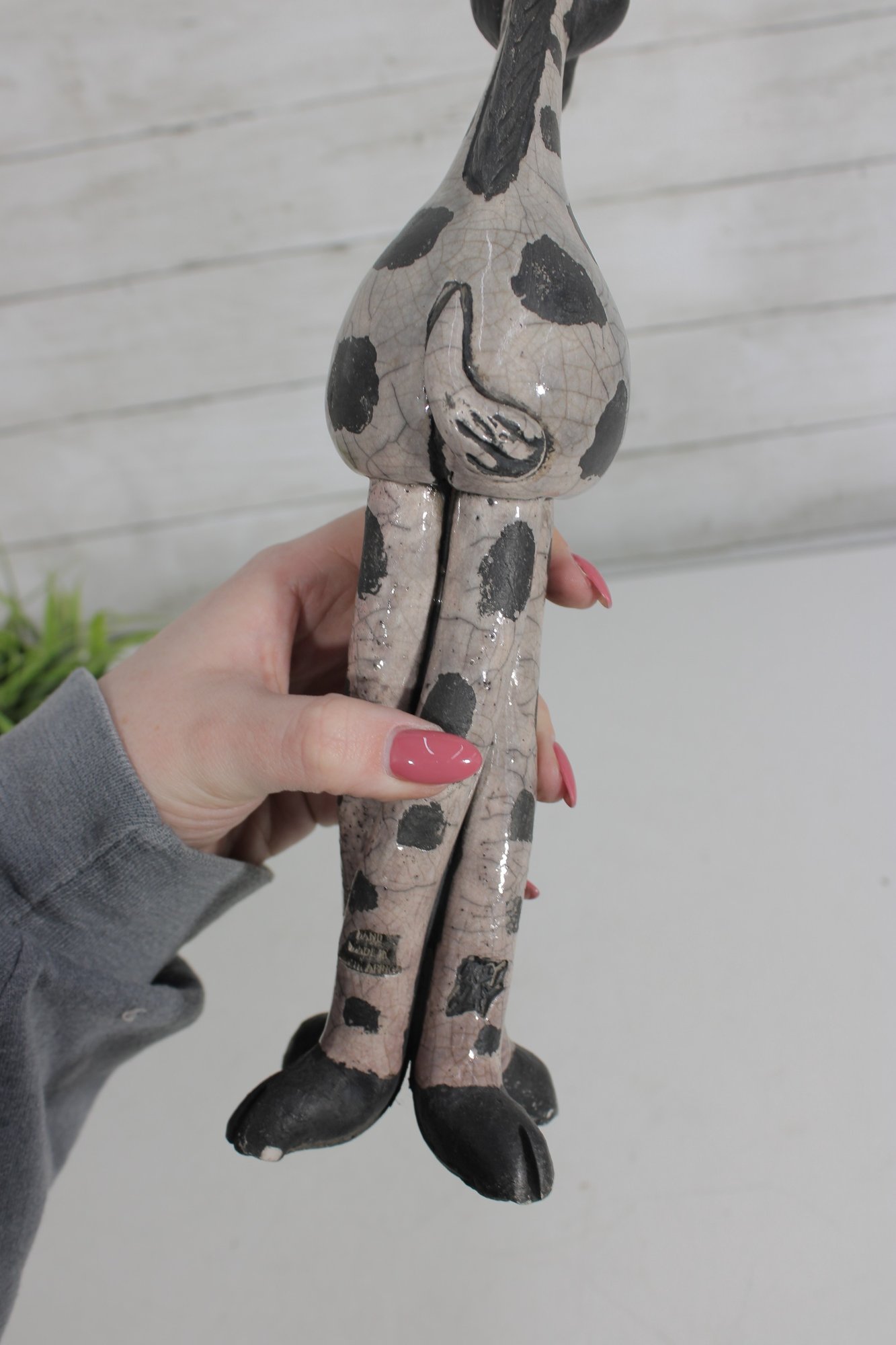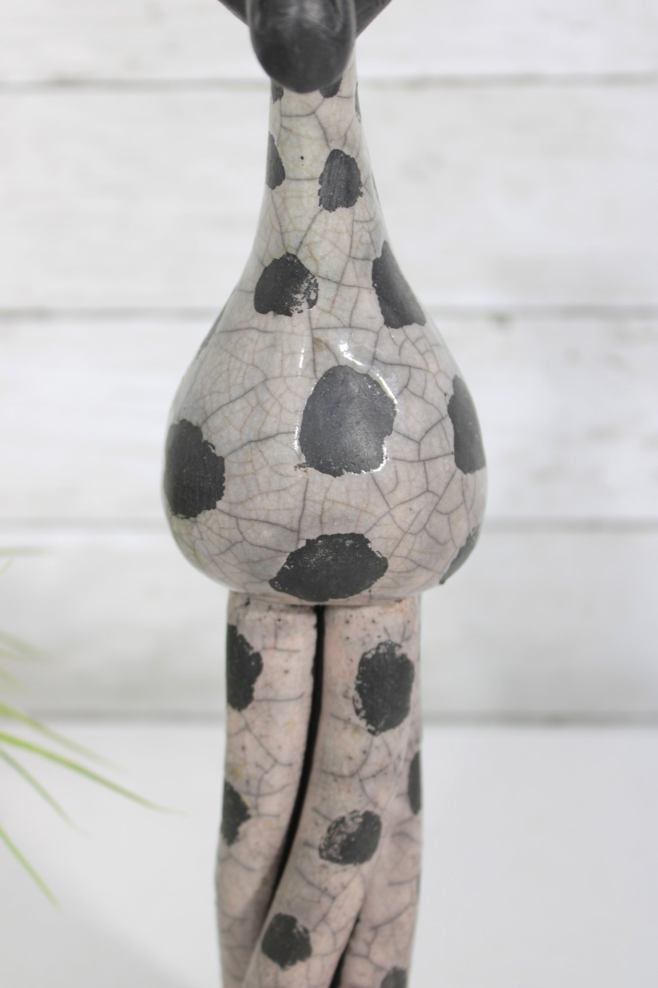 Charming and whimsical giraffe sculpture figurine featuring a playful design with exaggerated features and expressive eyes. This unique piece showcases a crackle-style finish with black spots over a light neutral base, giving it a handcrafted, folk art feel.