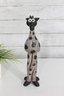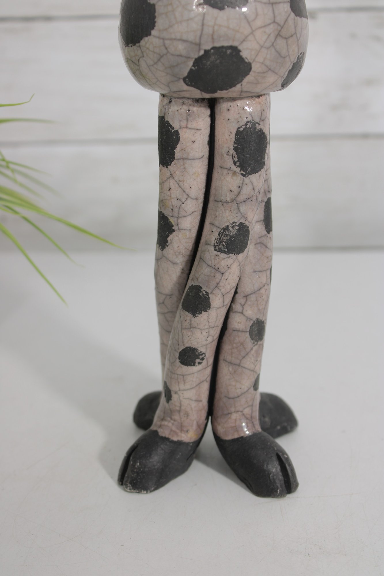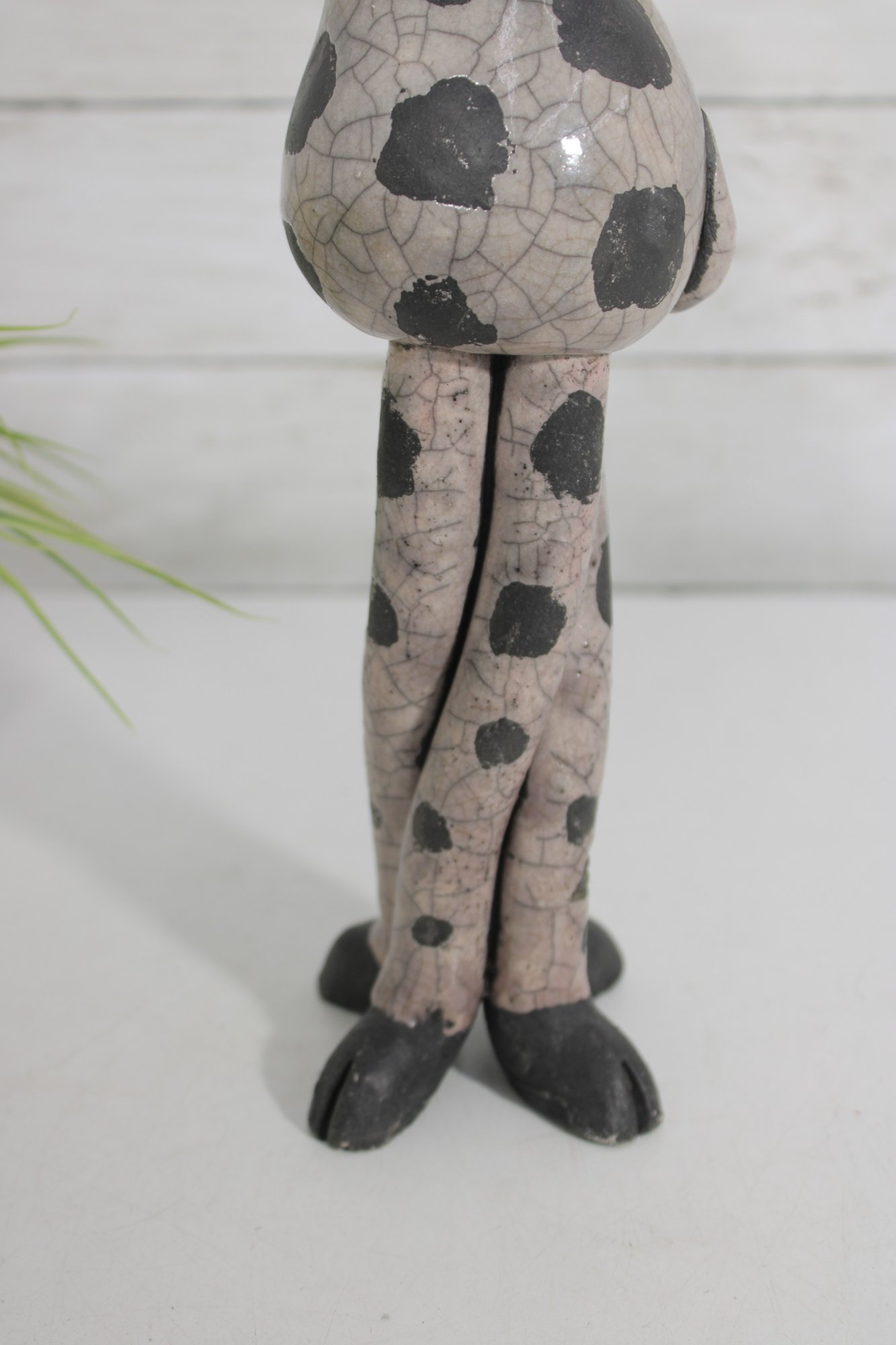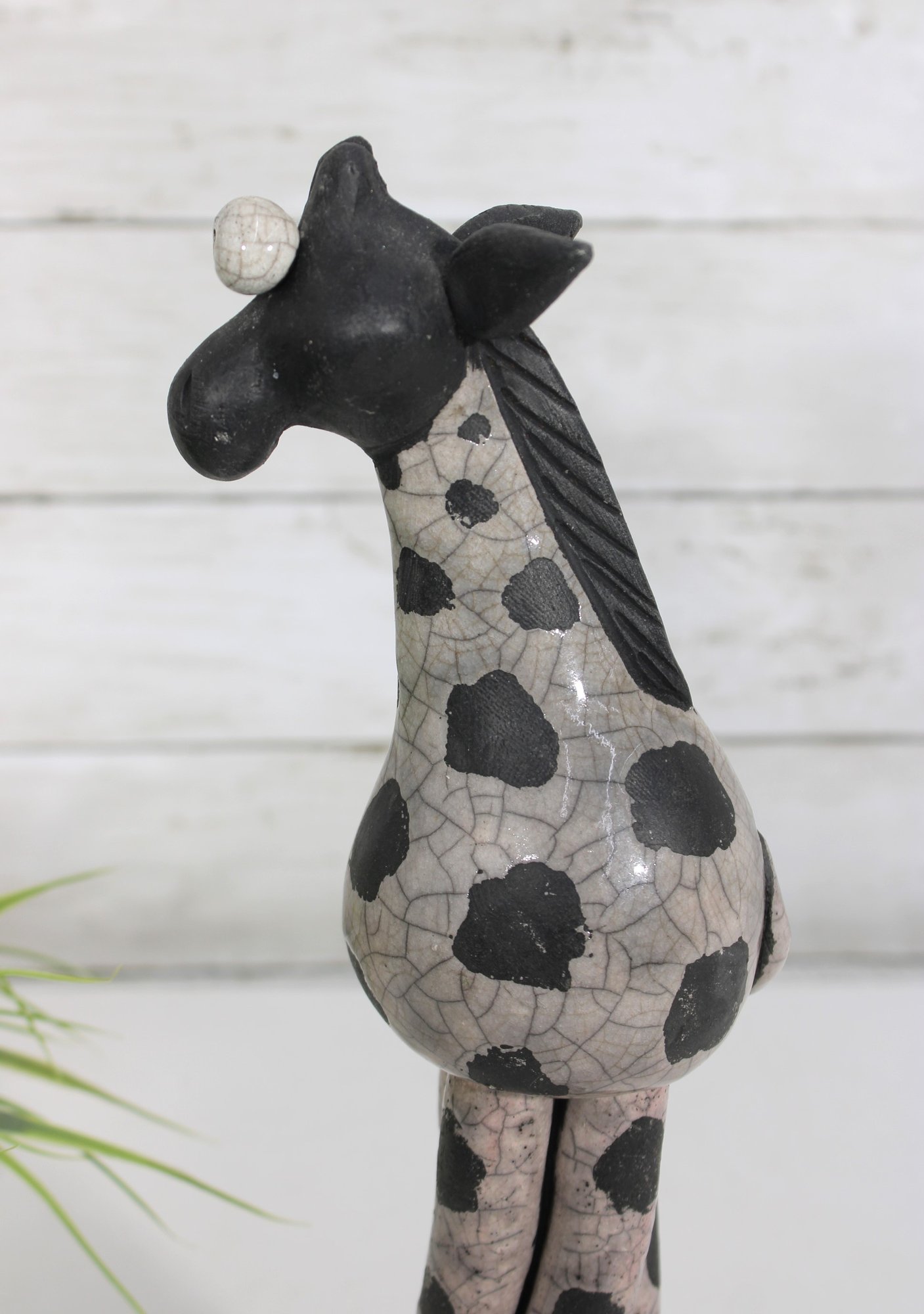 Charming and whimsical giraffe sculpture figurine featuring a playful design with exaggerated features and expressive eyes. This unique piece showcases a crackle-style finish with black spots over a light neutral base, giving it a handcrafted, folk art feel.