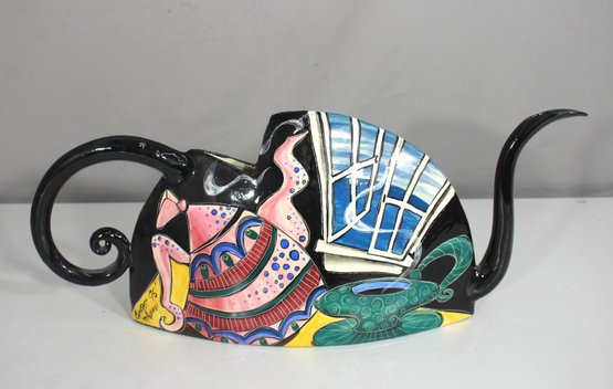 A striking piece of functional art, this hand-painted ceramic teapot sculpture is a lively explosion of color and form. Titled “Camabot 95” and signed by artist , this large, sculptural teapot measures 7.5 inches high by 18.5 inches wide, and features a surreal, abstract design with bold patterns, exaggerated forms, and playful energy.