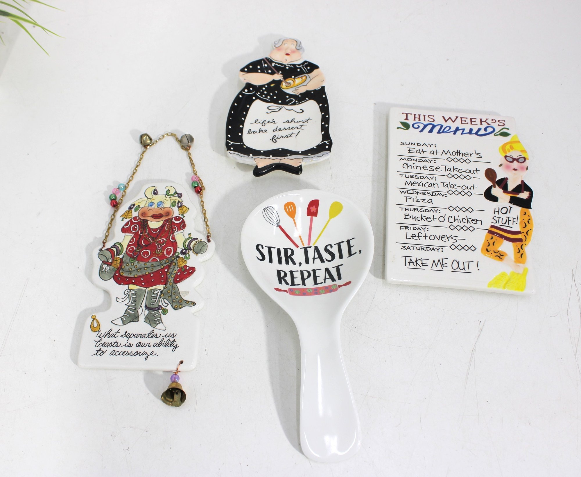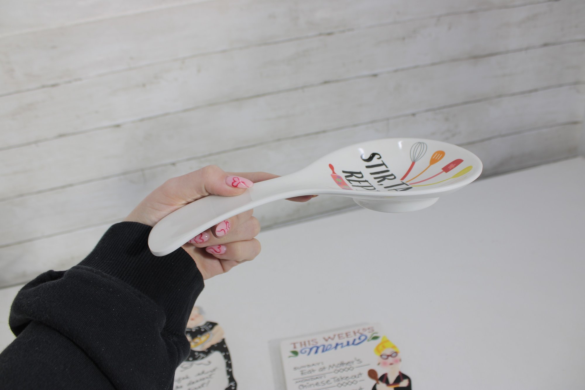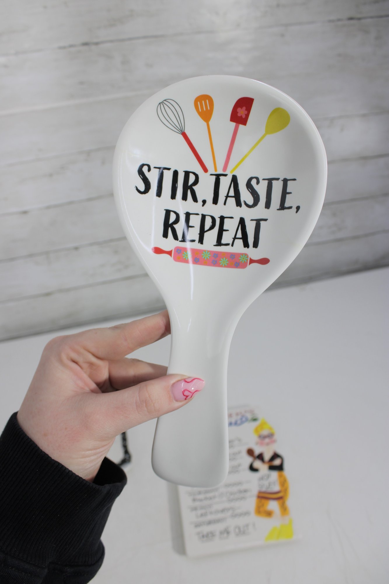 Mud Pie ceramic spoon rest reading “Stir, Taste, Repeat”