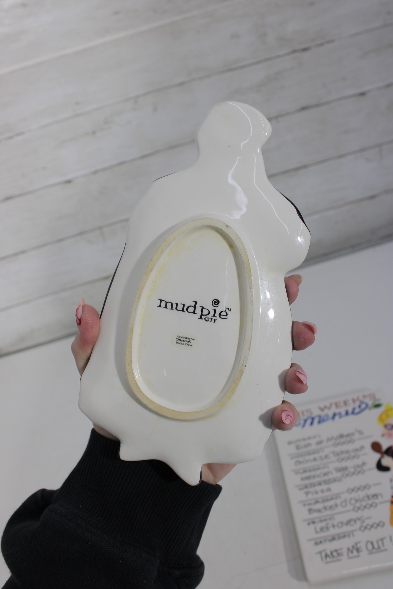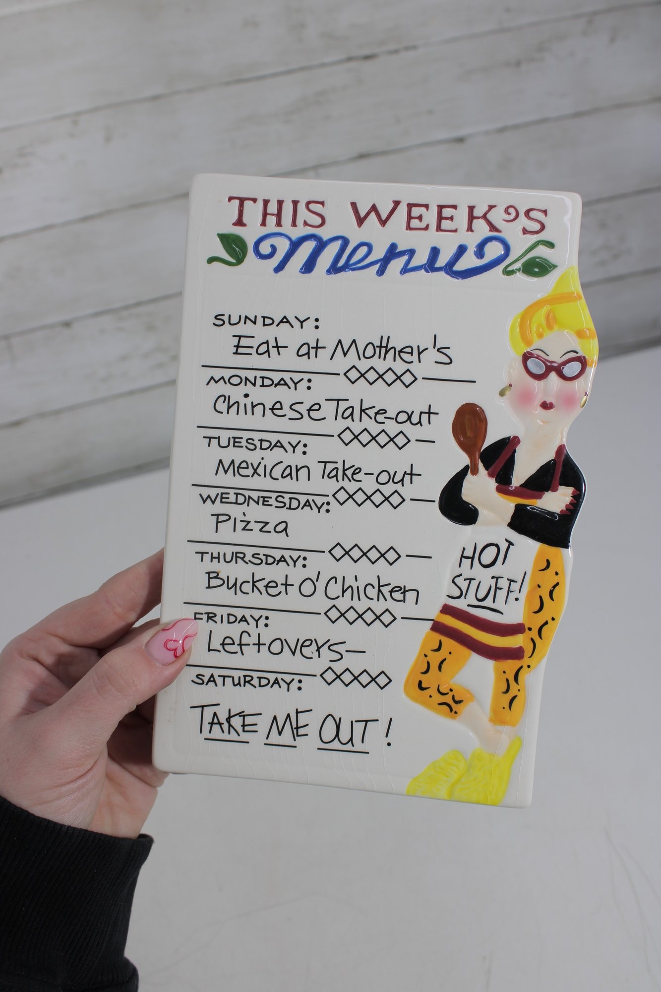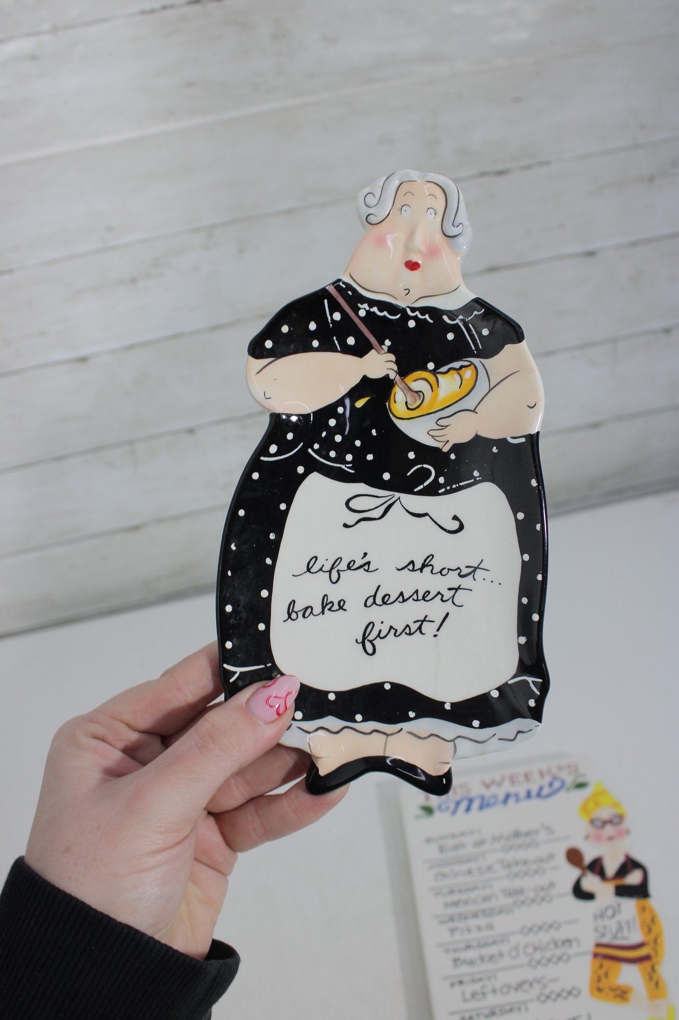 Shaped ceramic recipe plaque featuring a vintage-style cook illustration