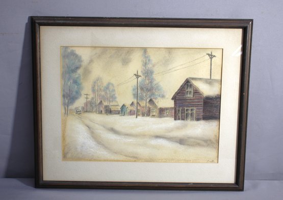 This atmospheric street scene portrays a row of rustic buildings lining a snowy road, evoking the quiet solitude of a small town in winter. The soft pastel tones create a dreamy, nostalgic feeling, inviting viewers to reflect on stories and memories that such a scene may hold.