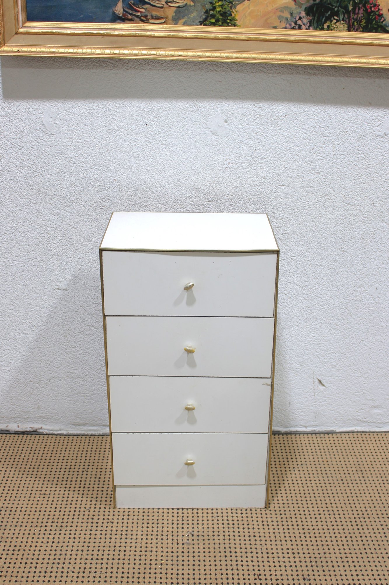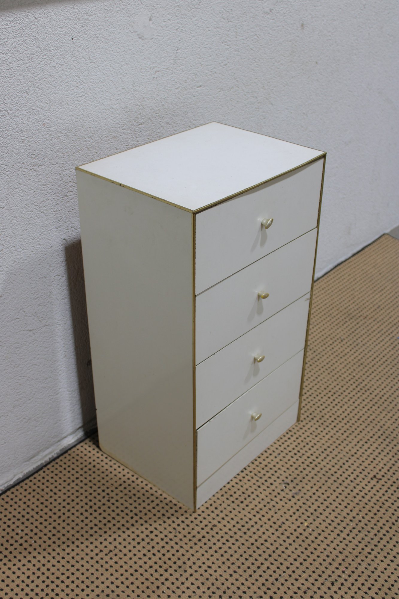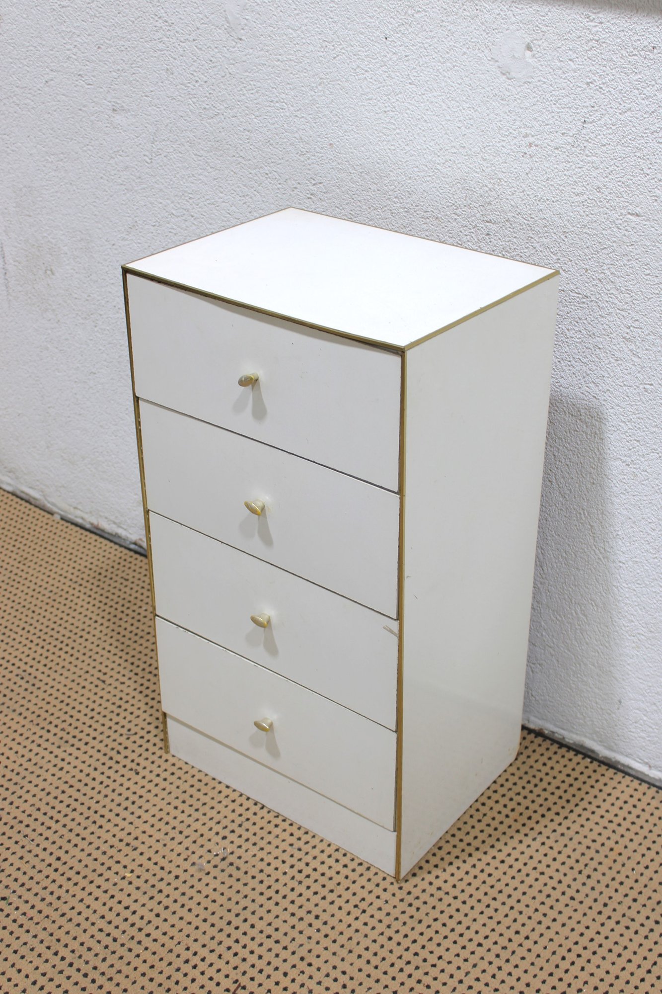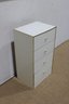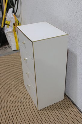 Clean and compact white four-drawer chest, ideal for use as a lingerie cabinet, bedside storage piece, or small space organizer. Its simple design and narrow profile make it perfect for apartments, bedrooms, closets, or office storage.