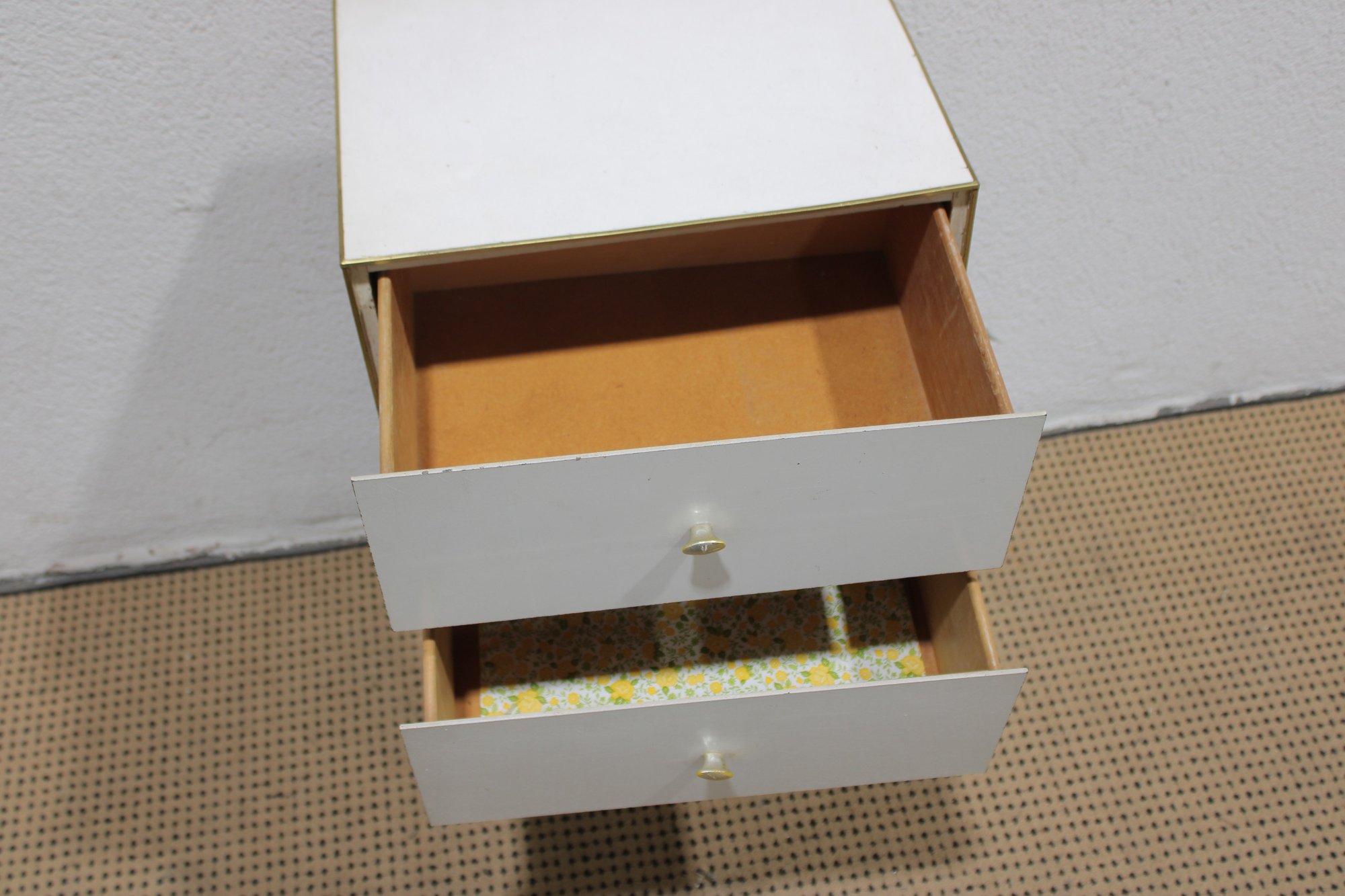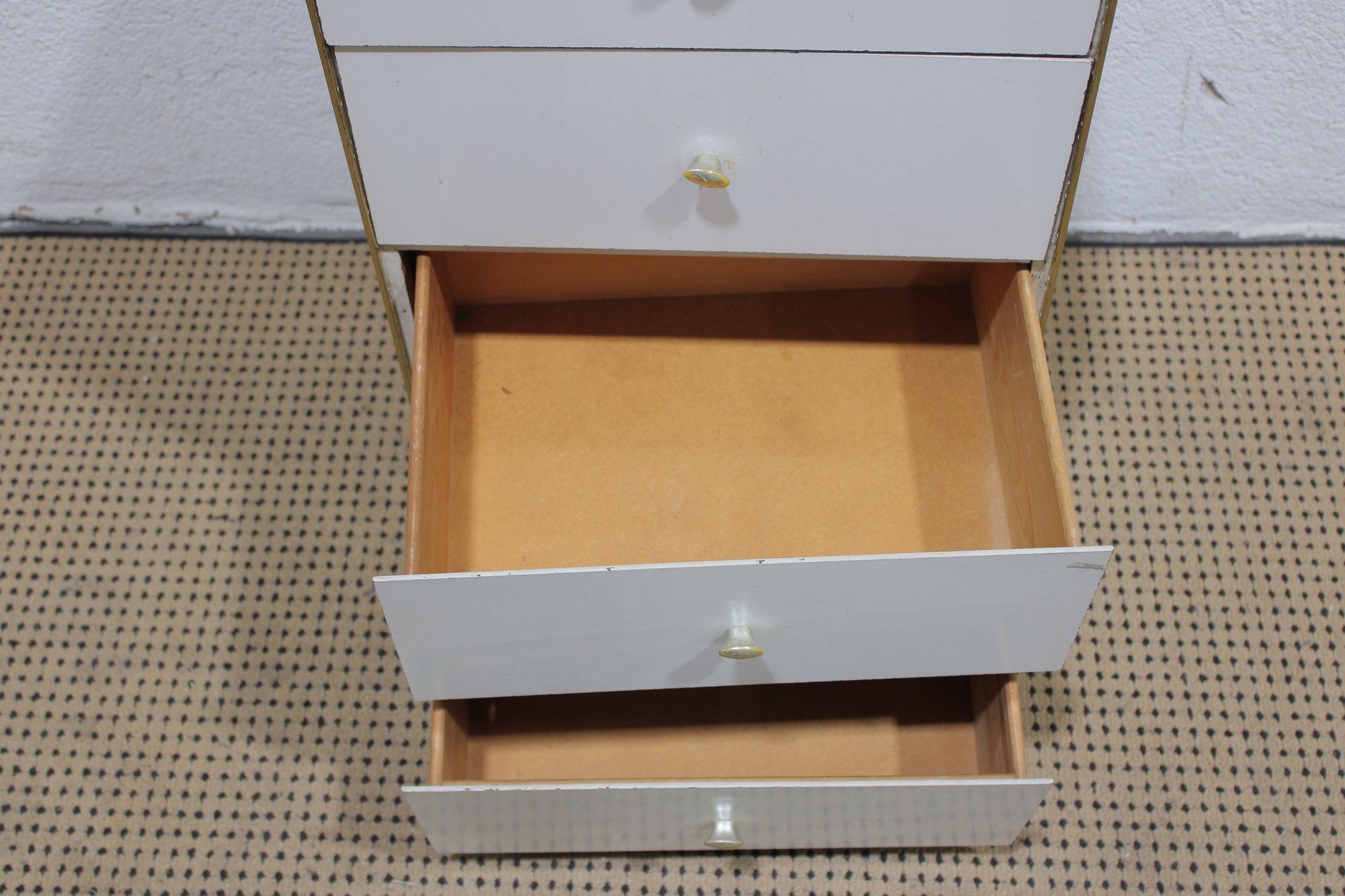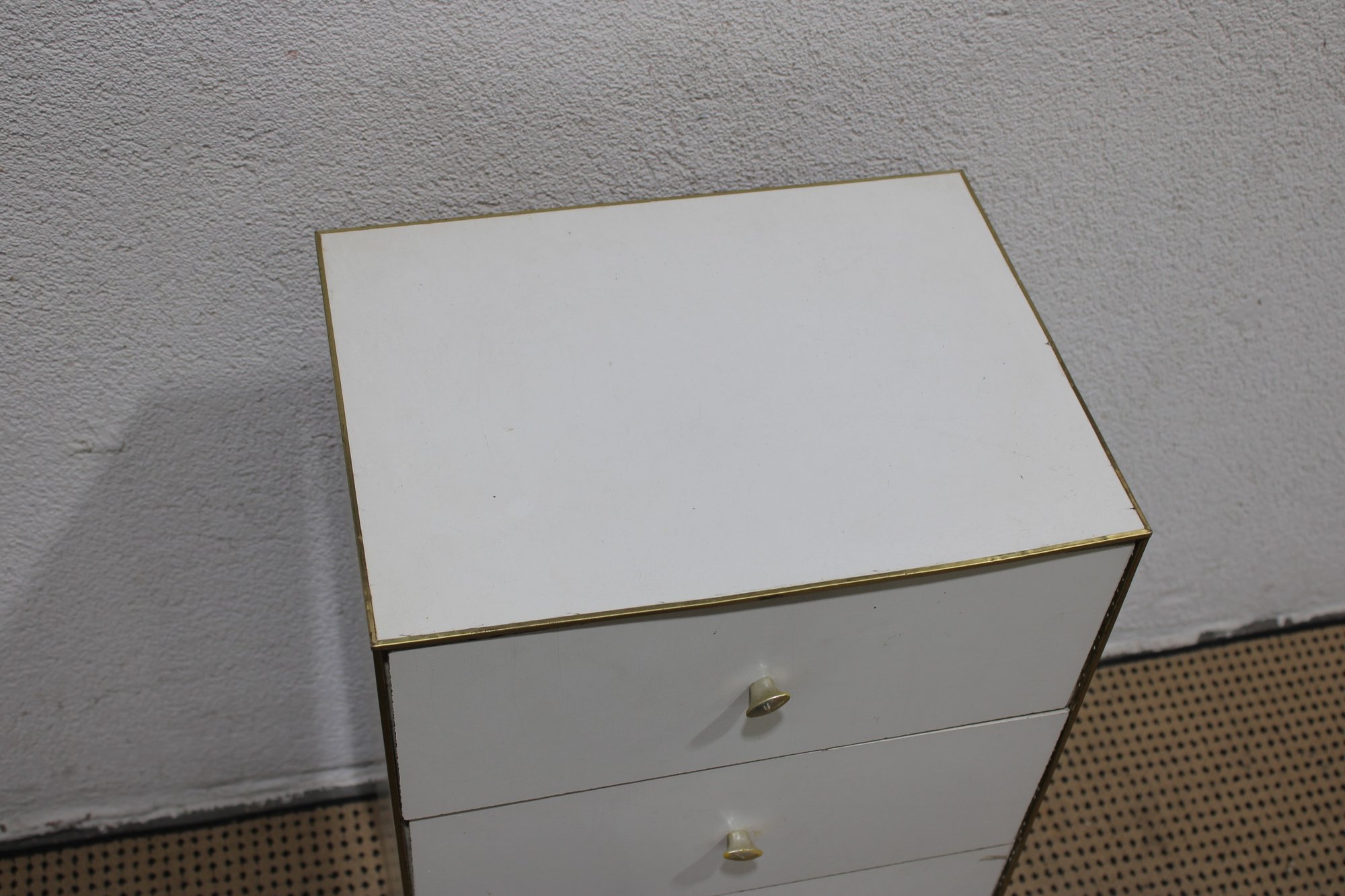 Clean and compact white four-drawer chest, ideal for use as a lingerie cabinet, bedside storage piece, or small space organizer. Its simple design and narrow profile make it perfect for apartments, bedrooms, closets, or office storage.