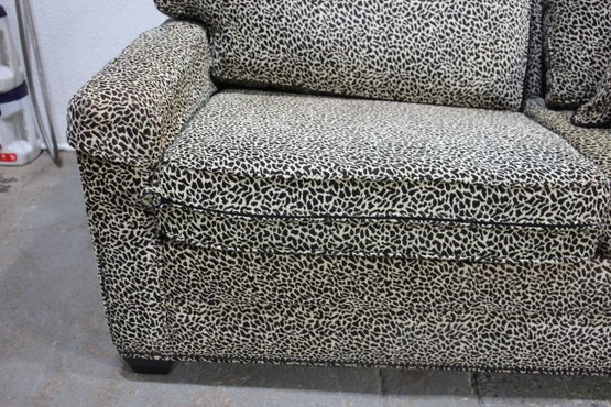 This stylish and functional loveseat sofa bed features a striking off-white and black animal print fabric, combining bold design with practical comfort. Perfect for small spaces or guest rooms, this loveseat easily transforms into a cozy pull-out bed. The piece comes with two matching cushions and slipcovers for the armrests, adding extra comfort and protection.Comfortable and plush with some signs of fading/discoloration, adding to its vintage charm