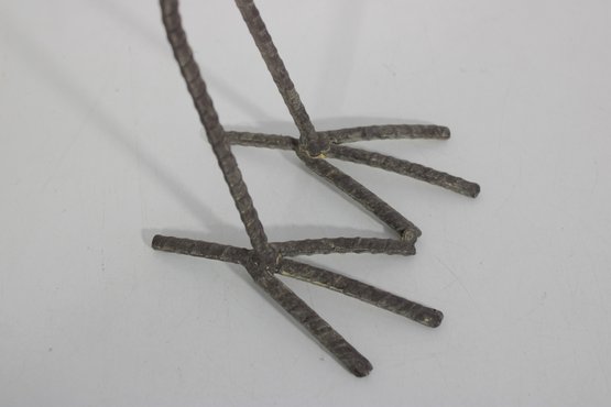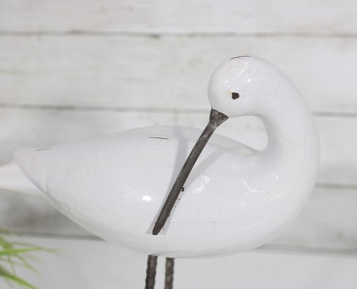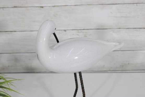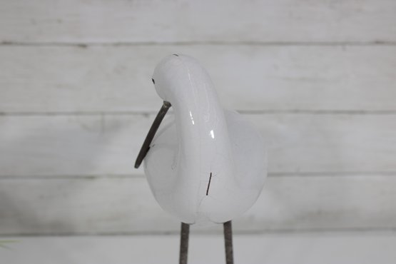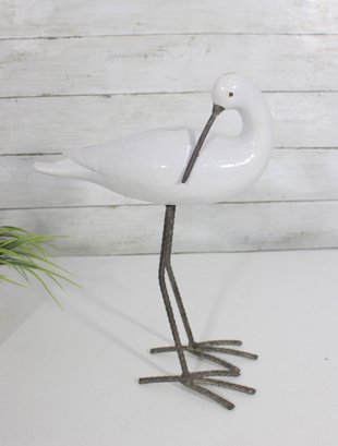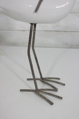 Stylish and minimalist white ceramic bird sculpture featuring a sleek, modern form paired with industrial-style metal legs. The glossy white body has a clean, contemporary look, while the textured metal legs add contrast and visual interest.