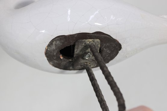 Good pre-owned condition with visible age-related wear. Notable crackle finish/crazing throughout the ceramic body and some wear/oxidation to the metal legs and attachment area (see photos). Structurally stable.
