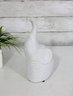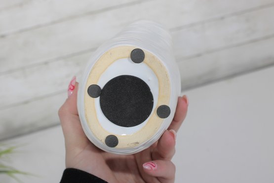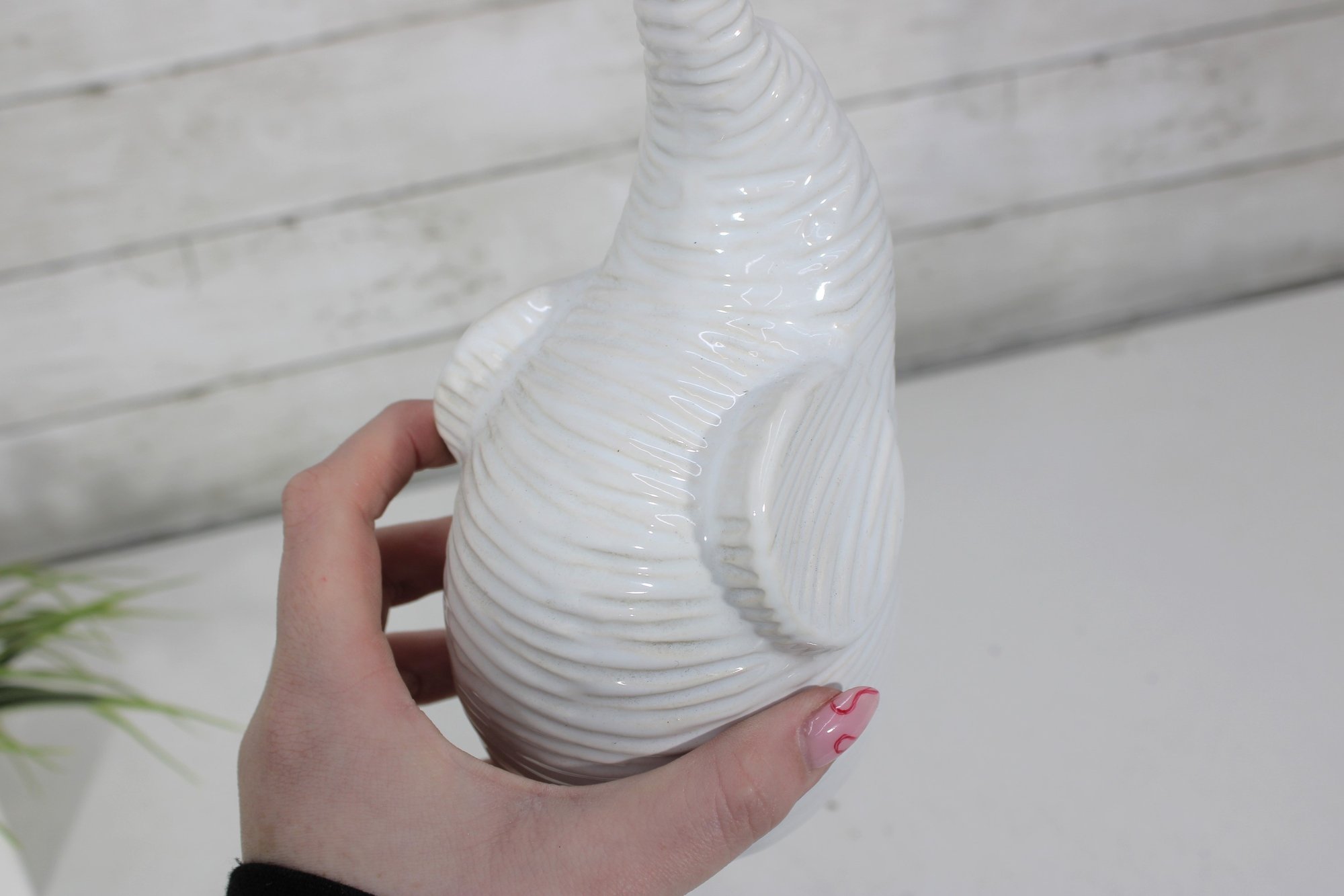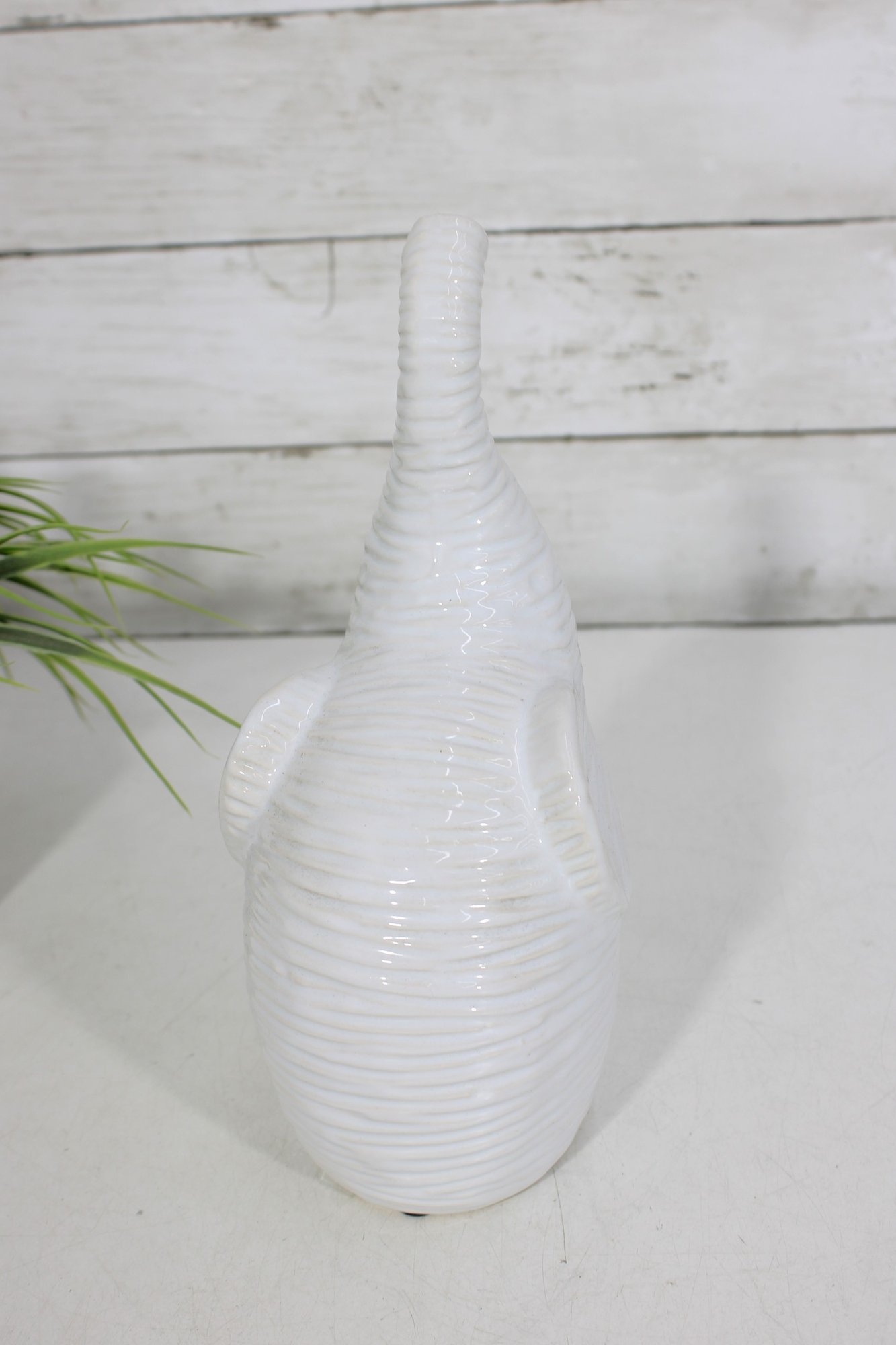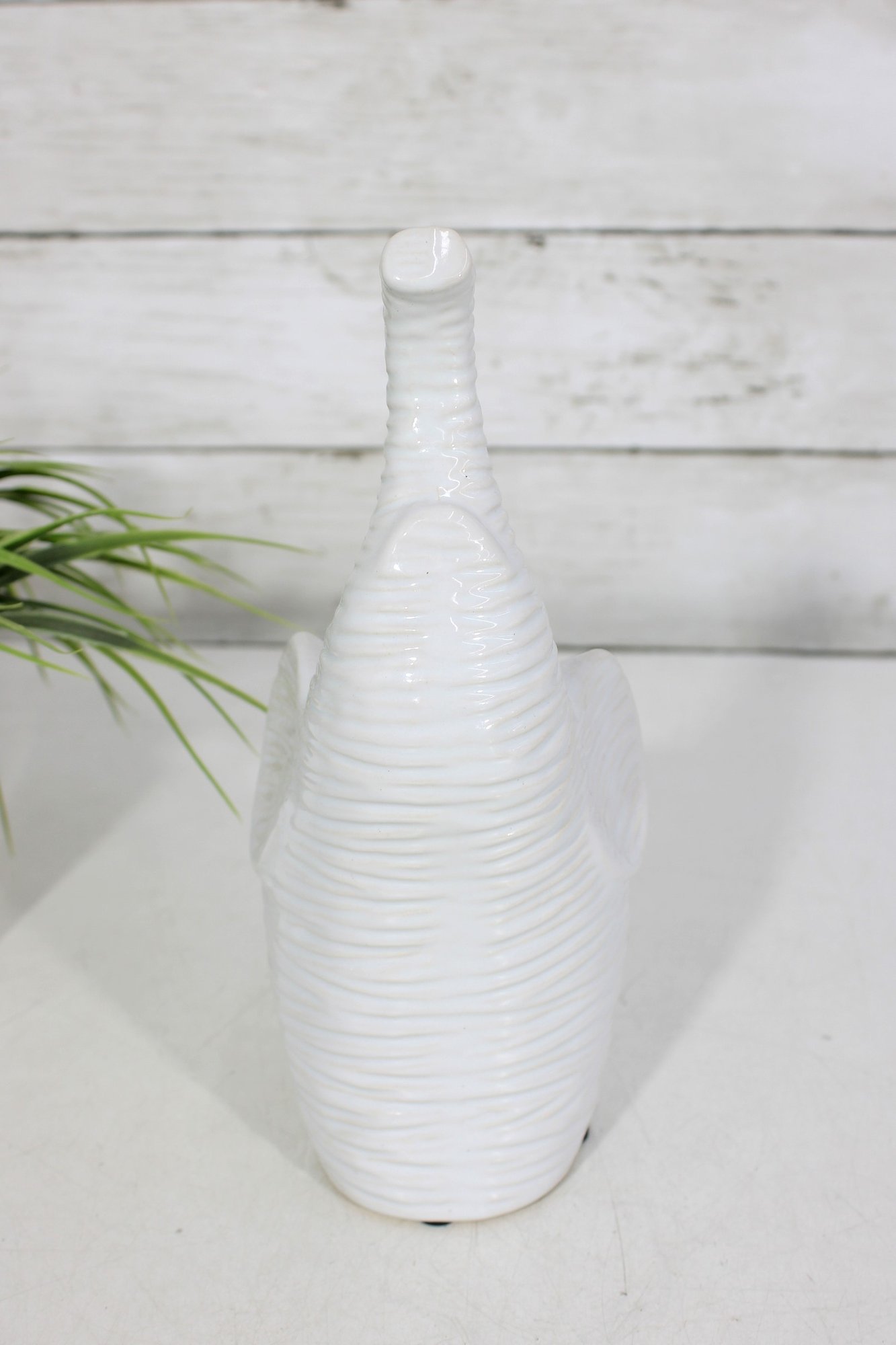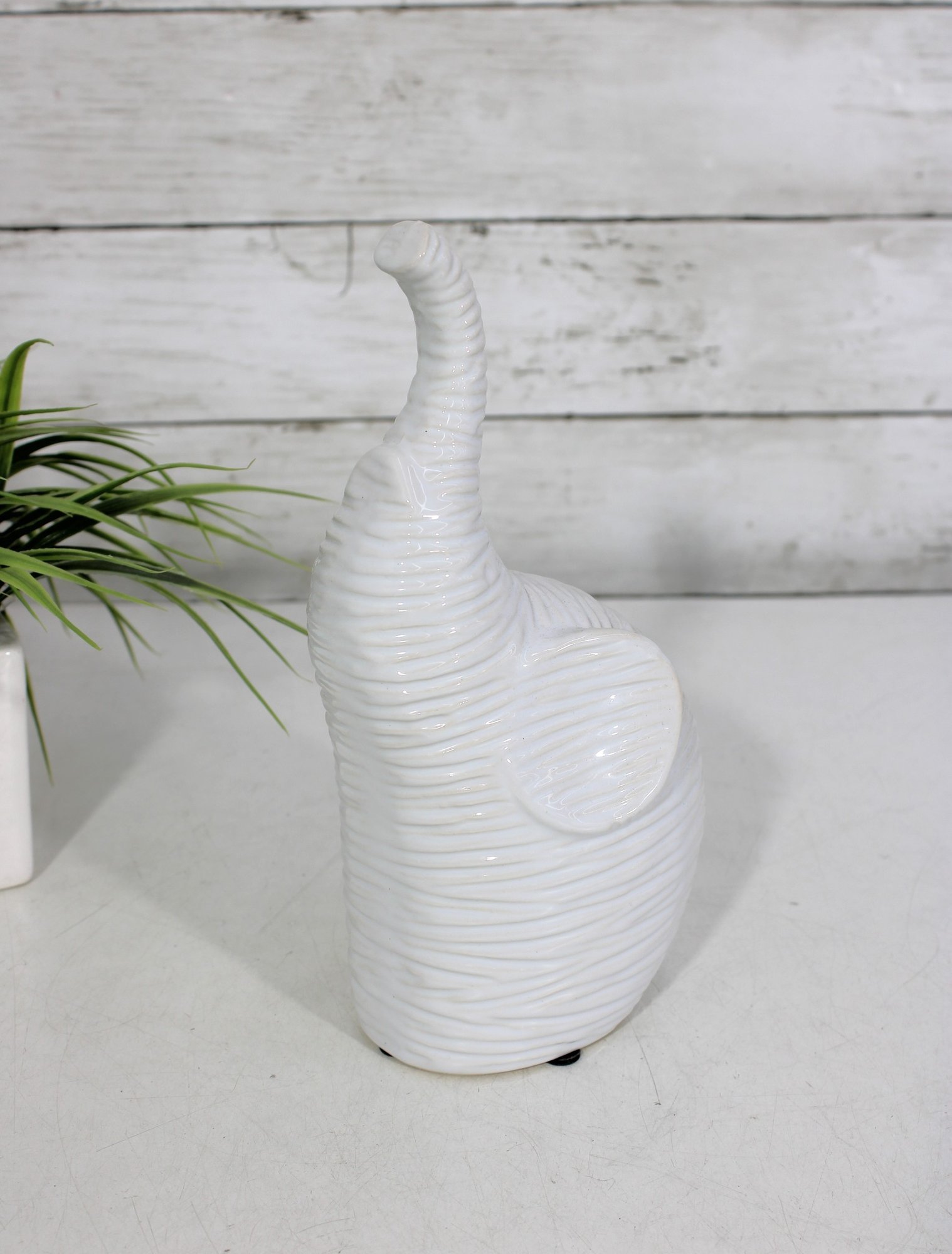 Finished in a glossy white glaze, this elephant works beautifully as a shelf accent, tabletop décor piece, nursery decoration, or modern home accessory. Felt pads on the base help protect surfaces during display.