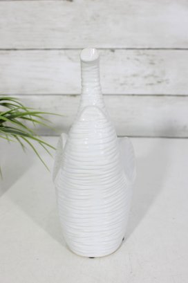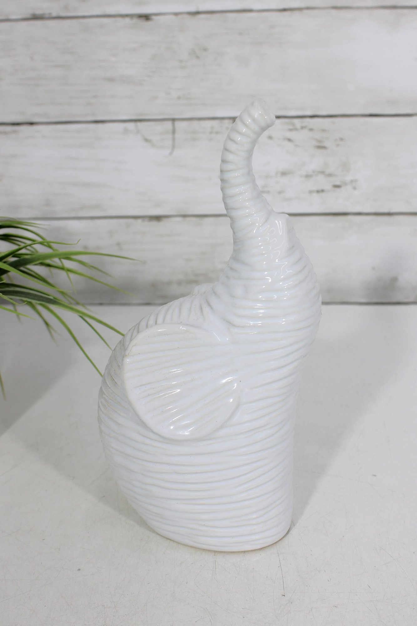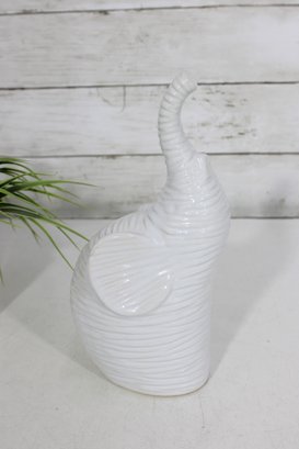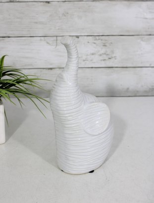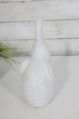 a modern white ceramic elephant figurine with a sleek, sculptural design. This piece features a raised trunk and subtle horizontal textured detailing throughout the body, giving it a contemporary yet playful look.