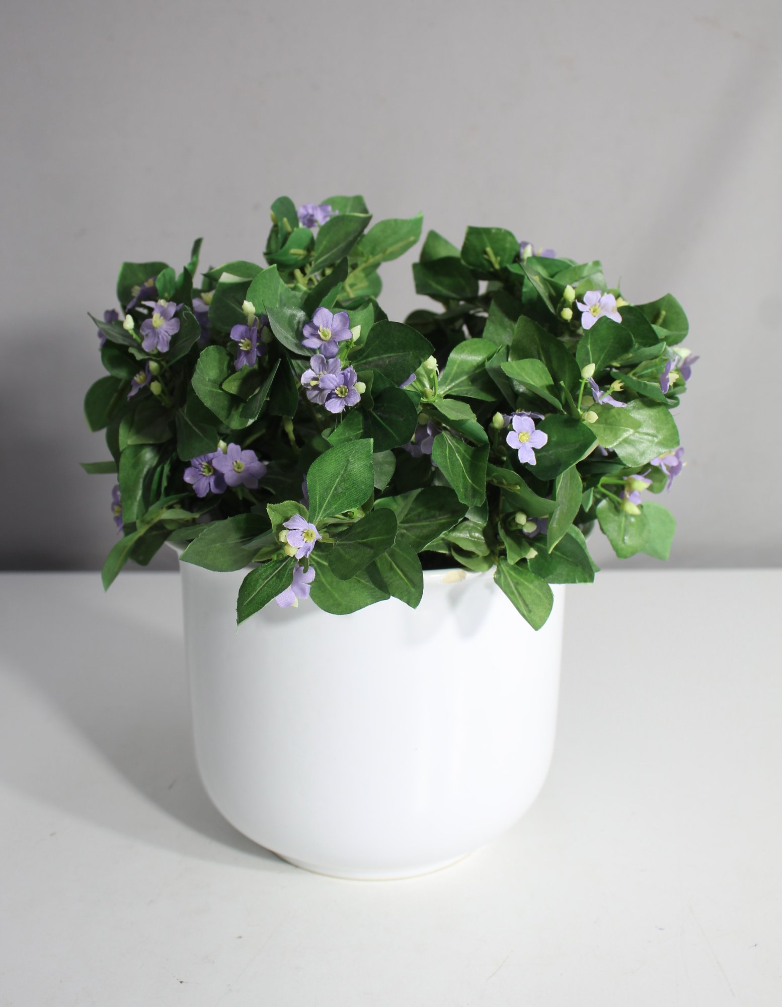 Simple yet charming, this white ceramic flower pot holds a lush arrangement of artificial purple flowers. Perfect for adding a touch of greenery and color to any space without the maintenance. The clean design of the pot complements various decor styles. Ideal for indoor decoration on shelves, countertops, or as a centerpiece.