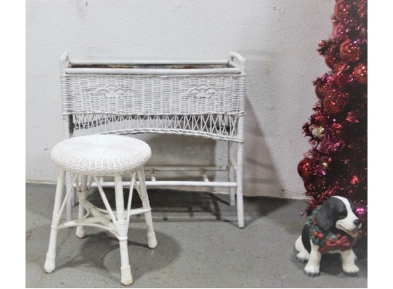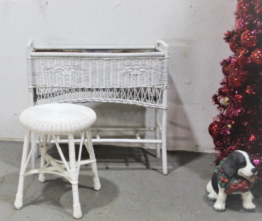 White Painted Wicker Long Plant Stand And Round Stool