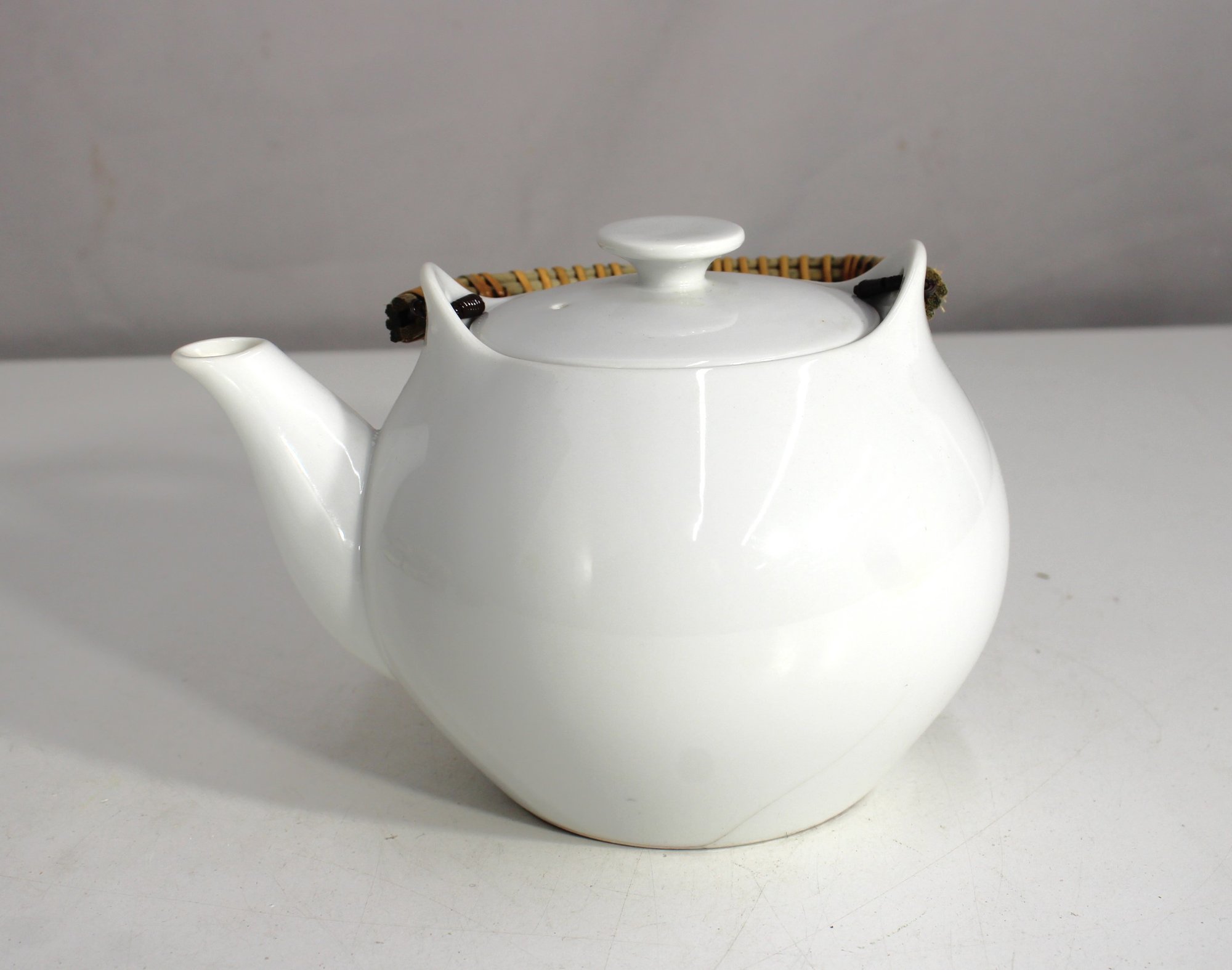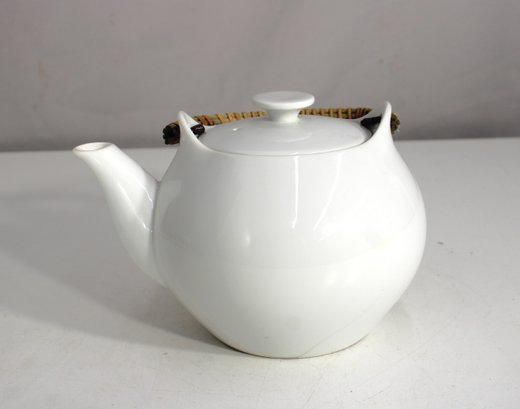 Elegant and timeless, this 5" tall white porcelain teapot features a clean, minimalist form and a curved profile, complemented by a natural woven bamboo handle. A beautiful addition to any tea service, it blends traditional materials with modern design.