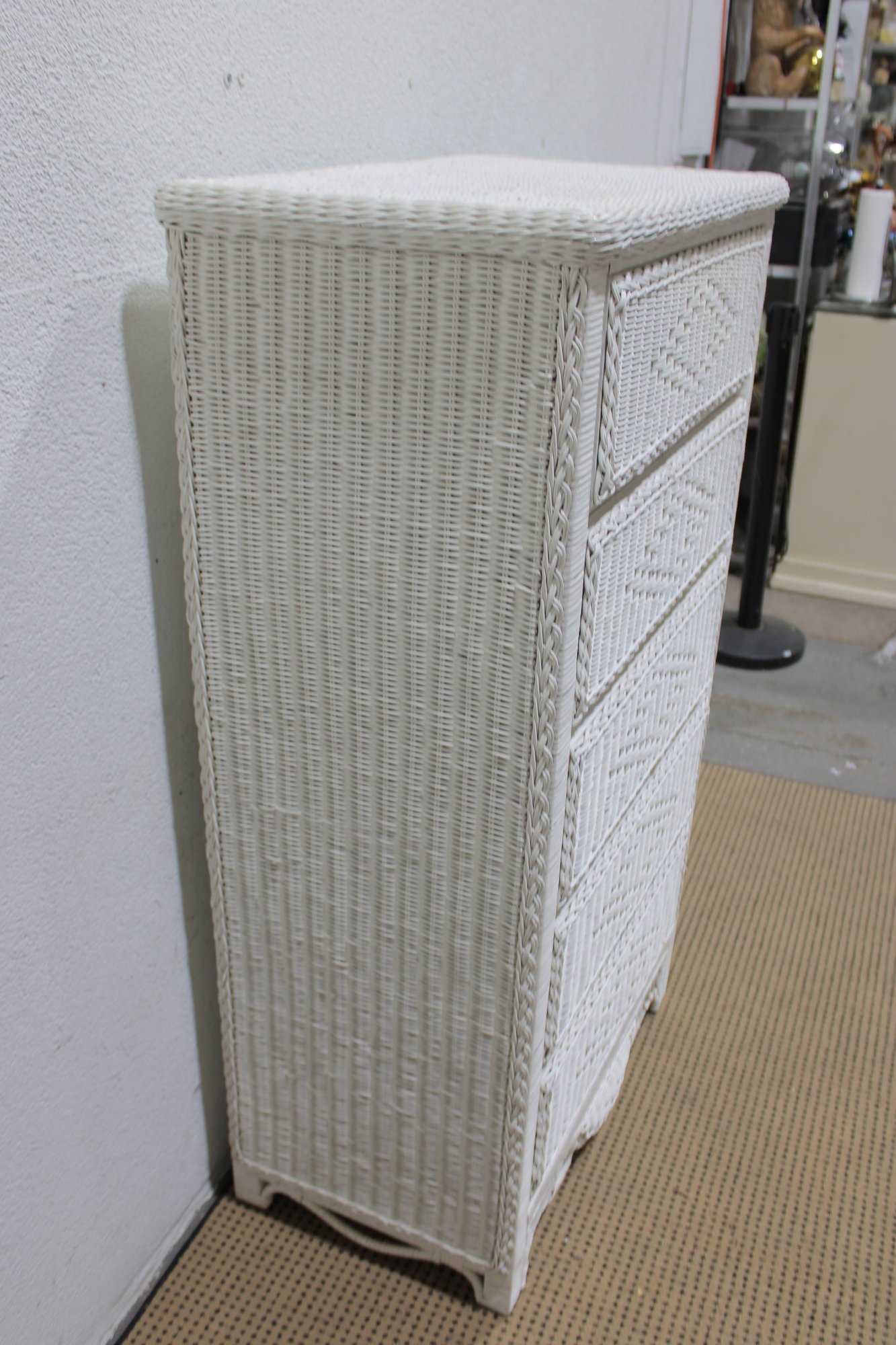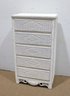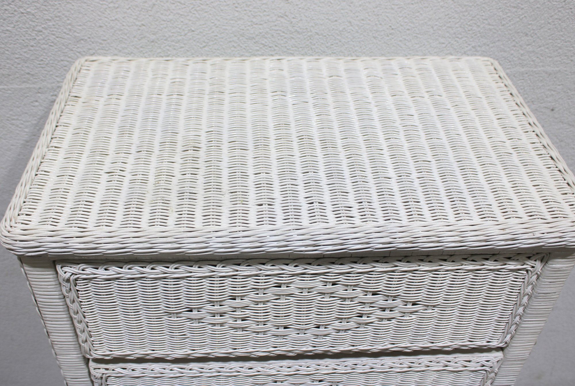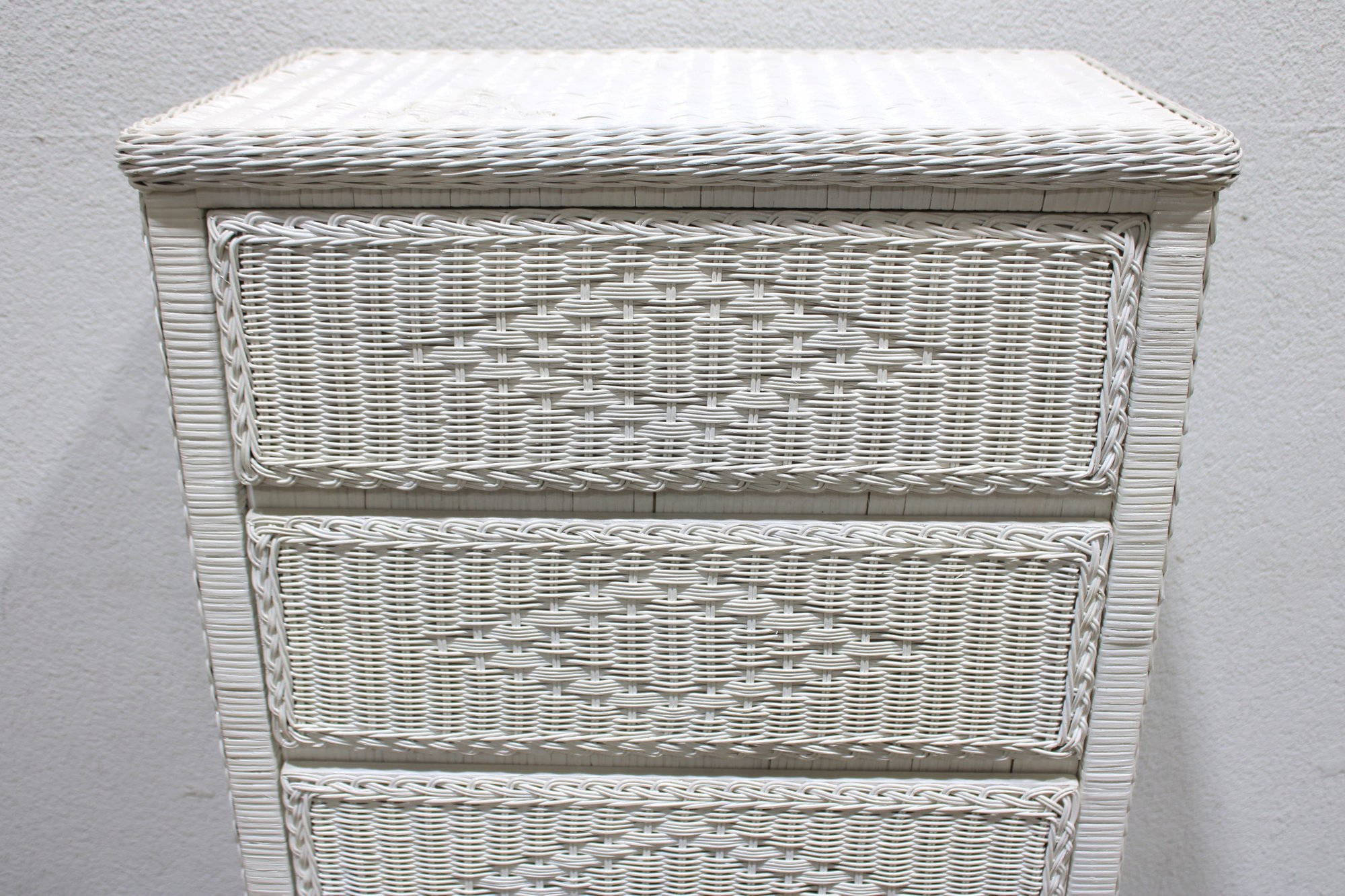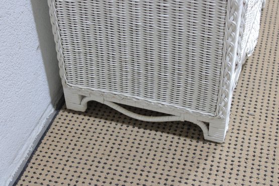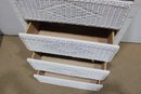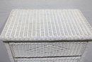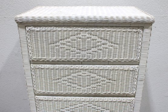 Charming white wicker tall chest featuring a classic woven design and light, airy coastal style. Measuring approximately 51" high x 28" wide x 17" deep, this vertical storage piece offers multiple drawers, making it ideal for bedrooms, guest rooms, or cottage-inspired interiors.