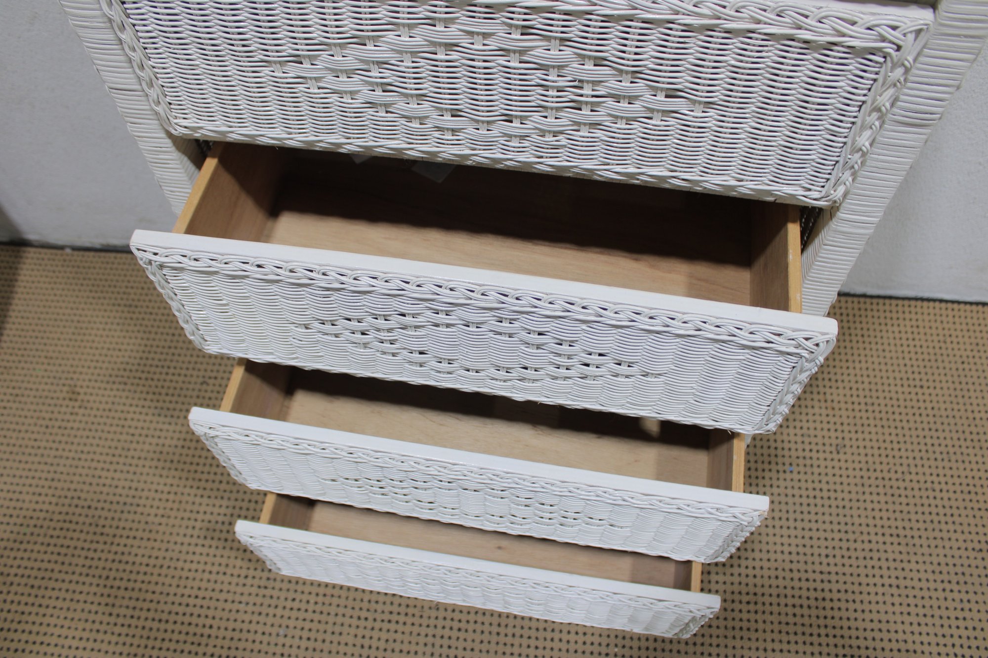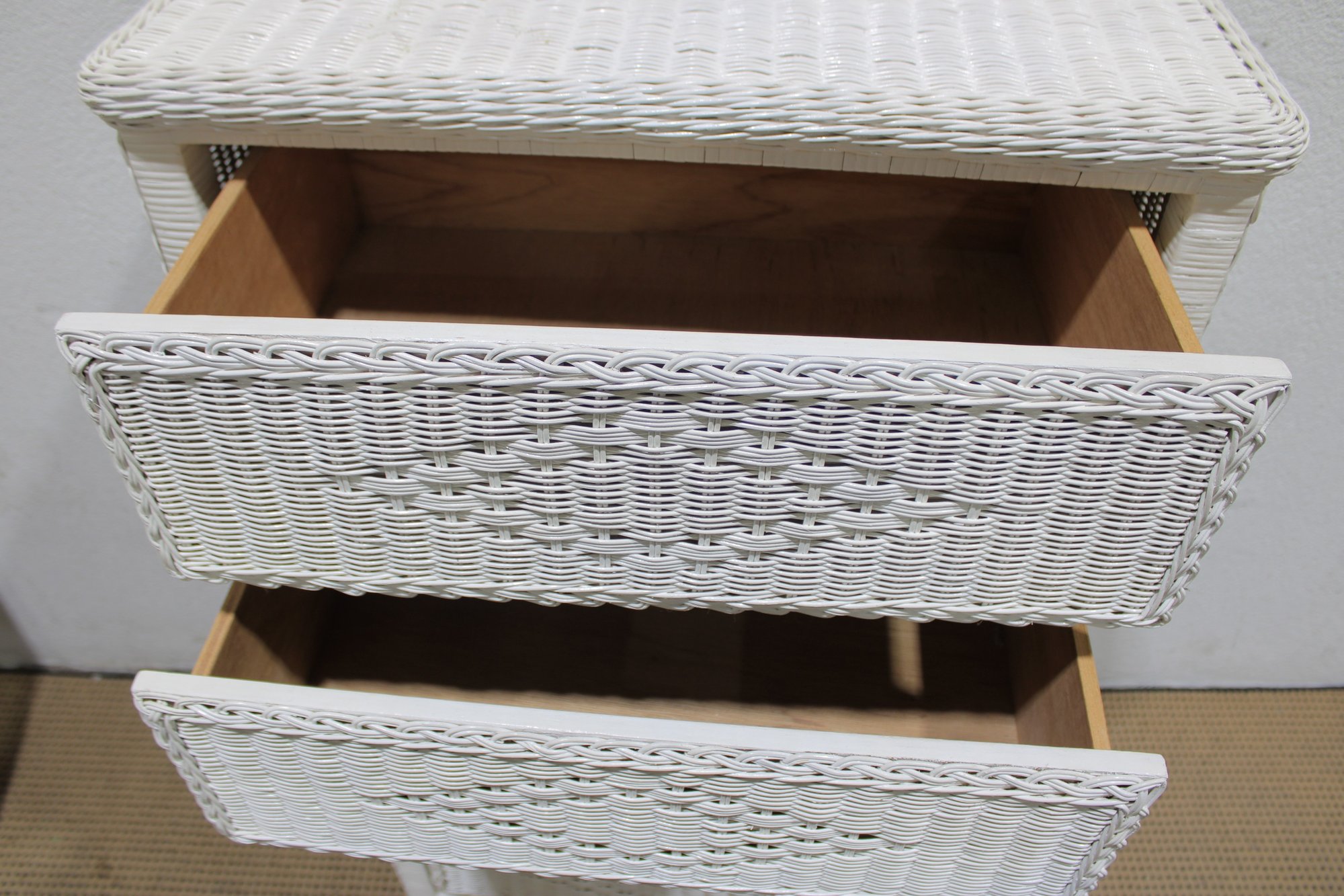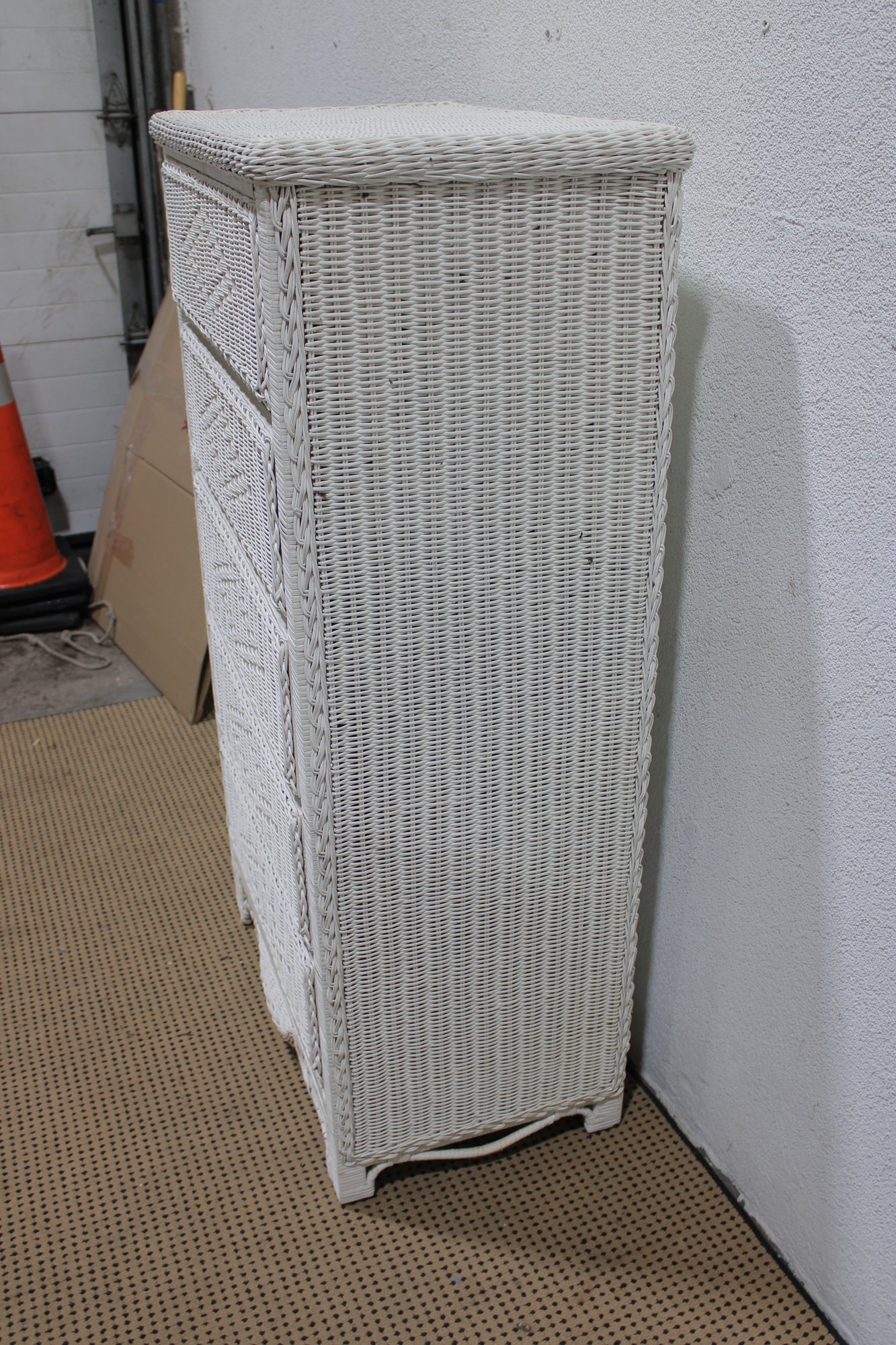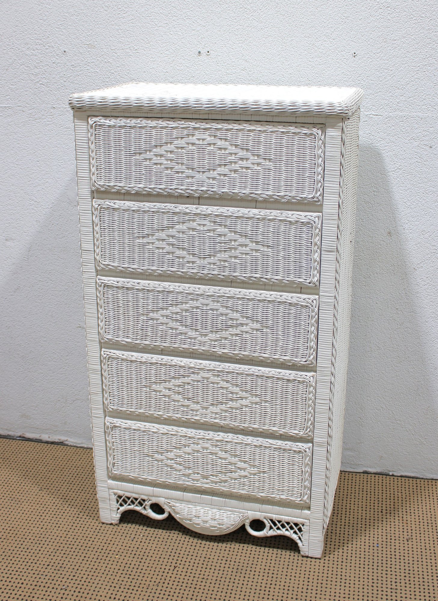 Charming white wicker tall chest featuring a classic woven design and light, airy coastal style. Measuring approximately 51" high x 28" wide x 17" deep, this vertical storage piece offers multiple drawers, making it ideal for bedrooms, guest rooms, or cottage-inspired interiors.