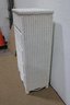 The textured wicker construction adds warmth and character while maintaining a clean neutral look that blends easily with coastal, farmhouse, or vintage décor styles. Its slim profile makes it perfect for spaces where storage is needed without taking up excessive floor space.