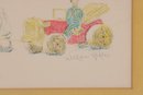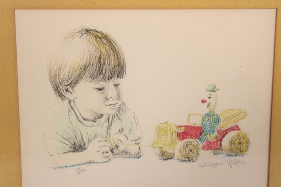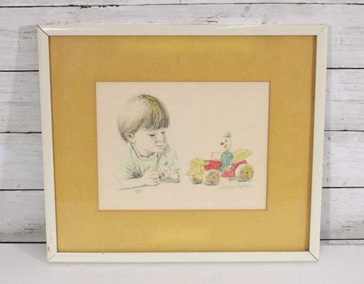A charming and nostalgic framed print by William Holder, featuring a young child intently playing beside a colorful toy tractor. The artwork beautifully combines delicate pencil-style portraiture with soft, hand-colored accents, bringing warmth and personality to the scene.