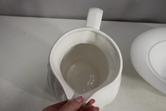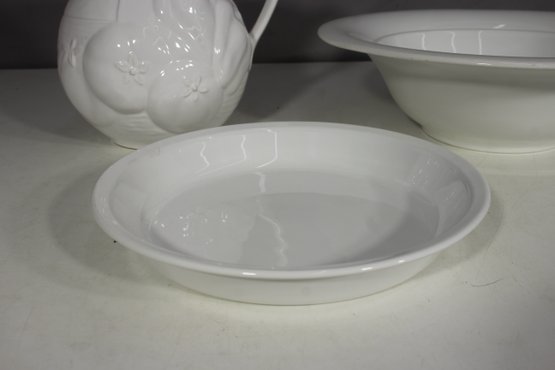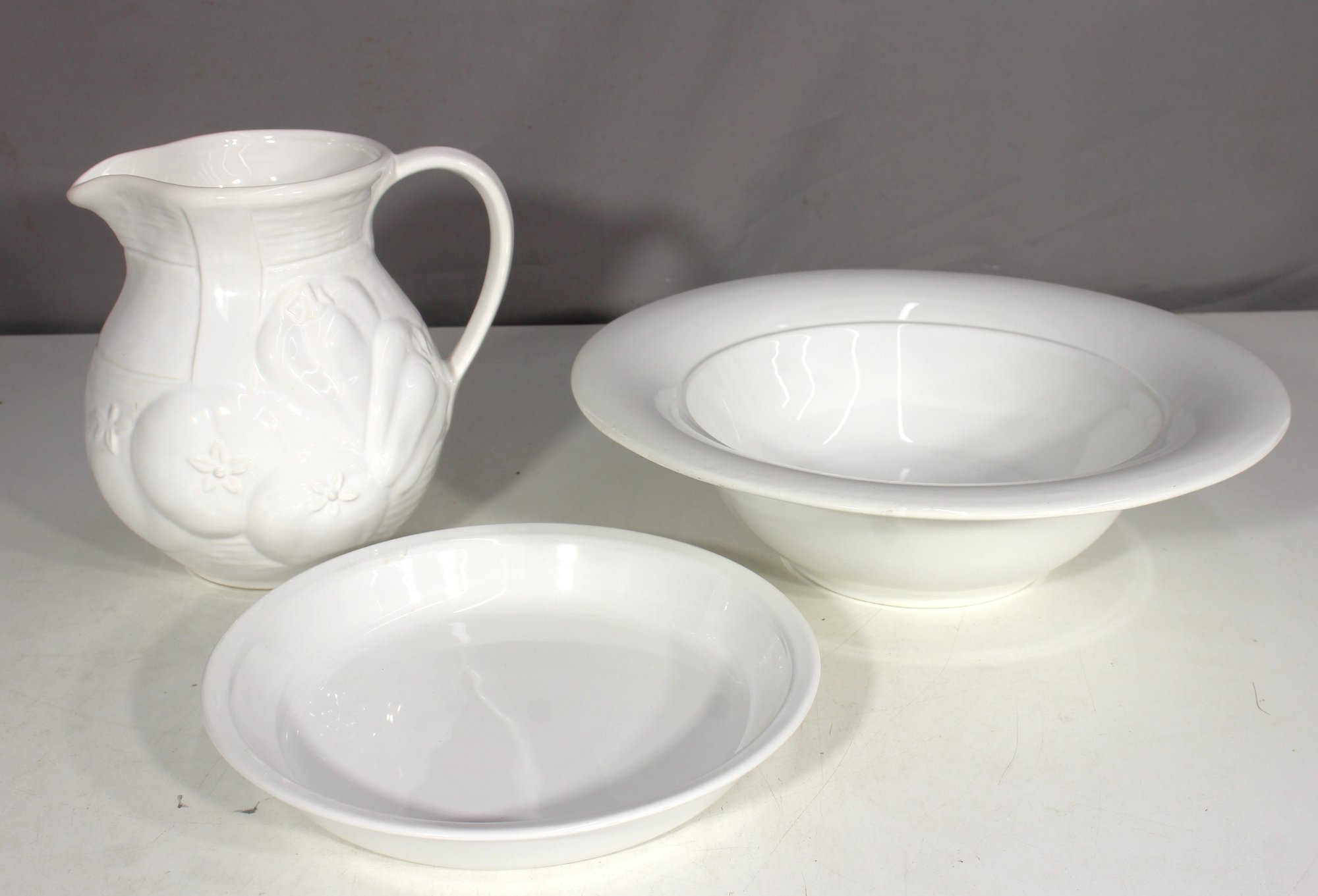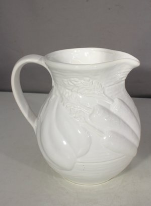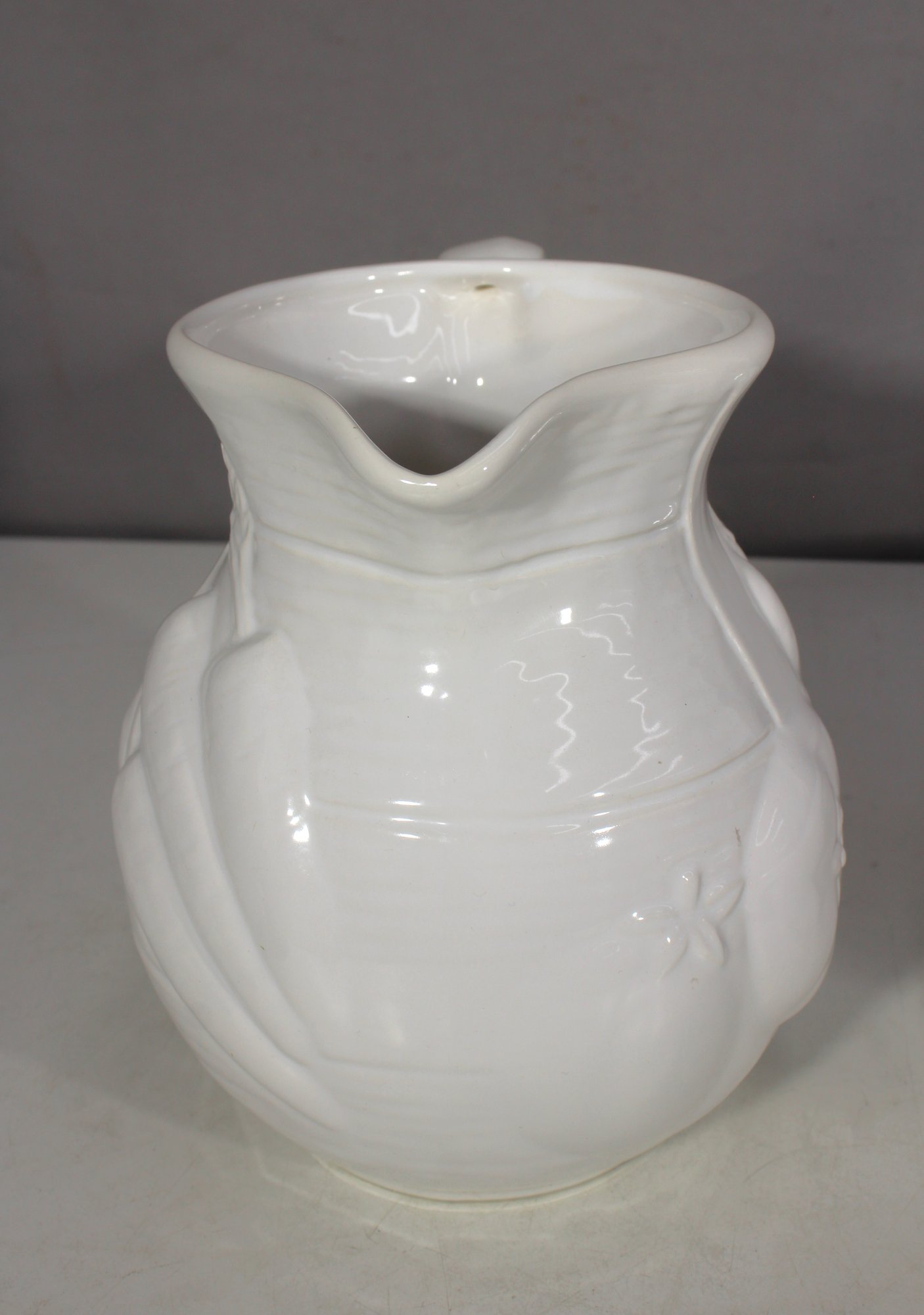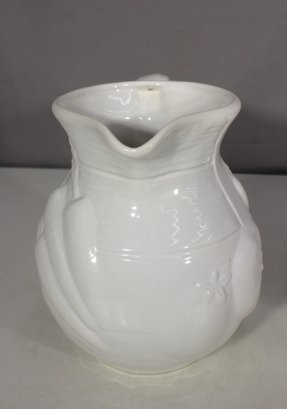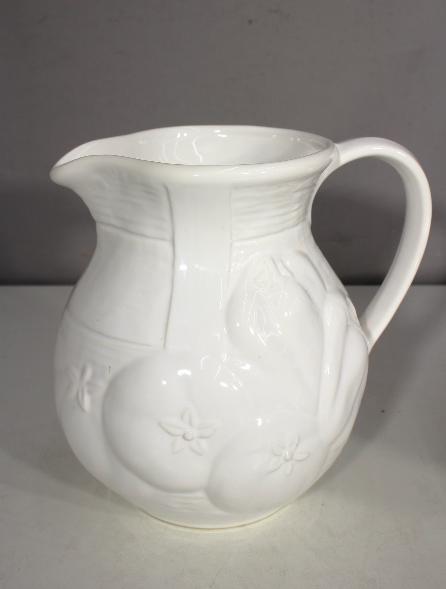 Vintage White Ironstone Pitcher – Embossed fruit and floral motif, gracefully curved handle, and sturdy base.