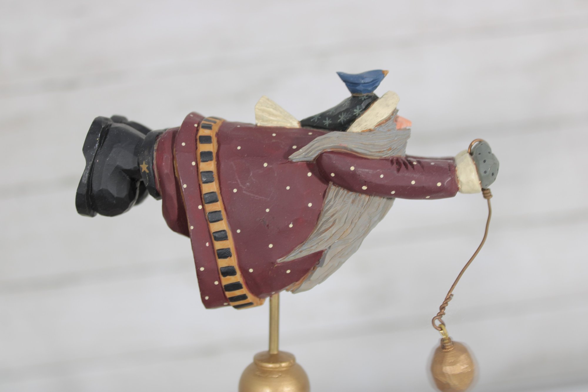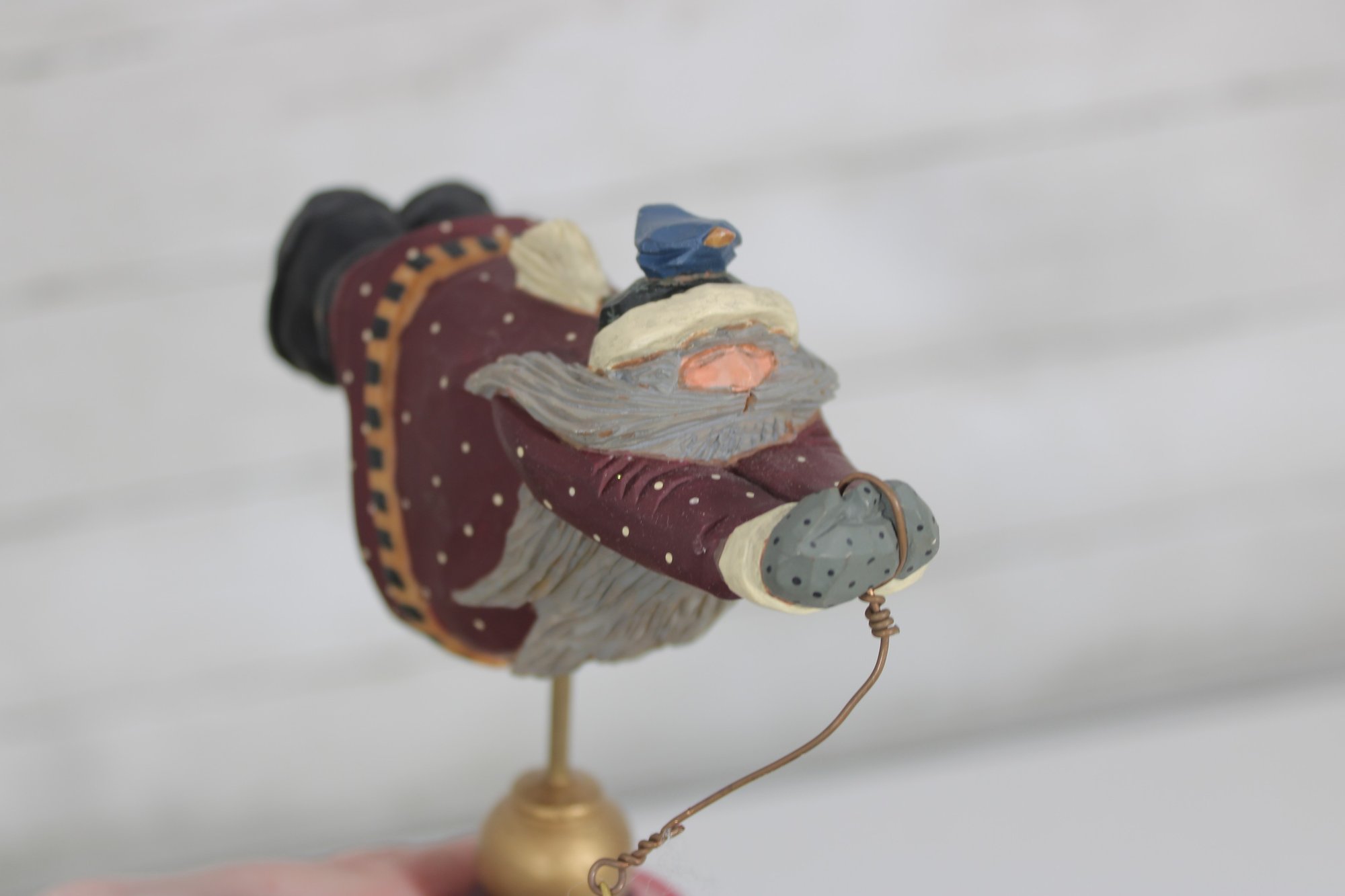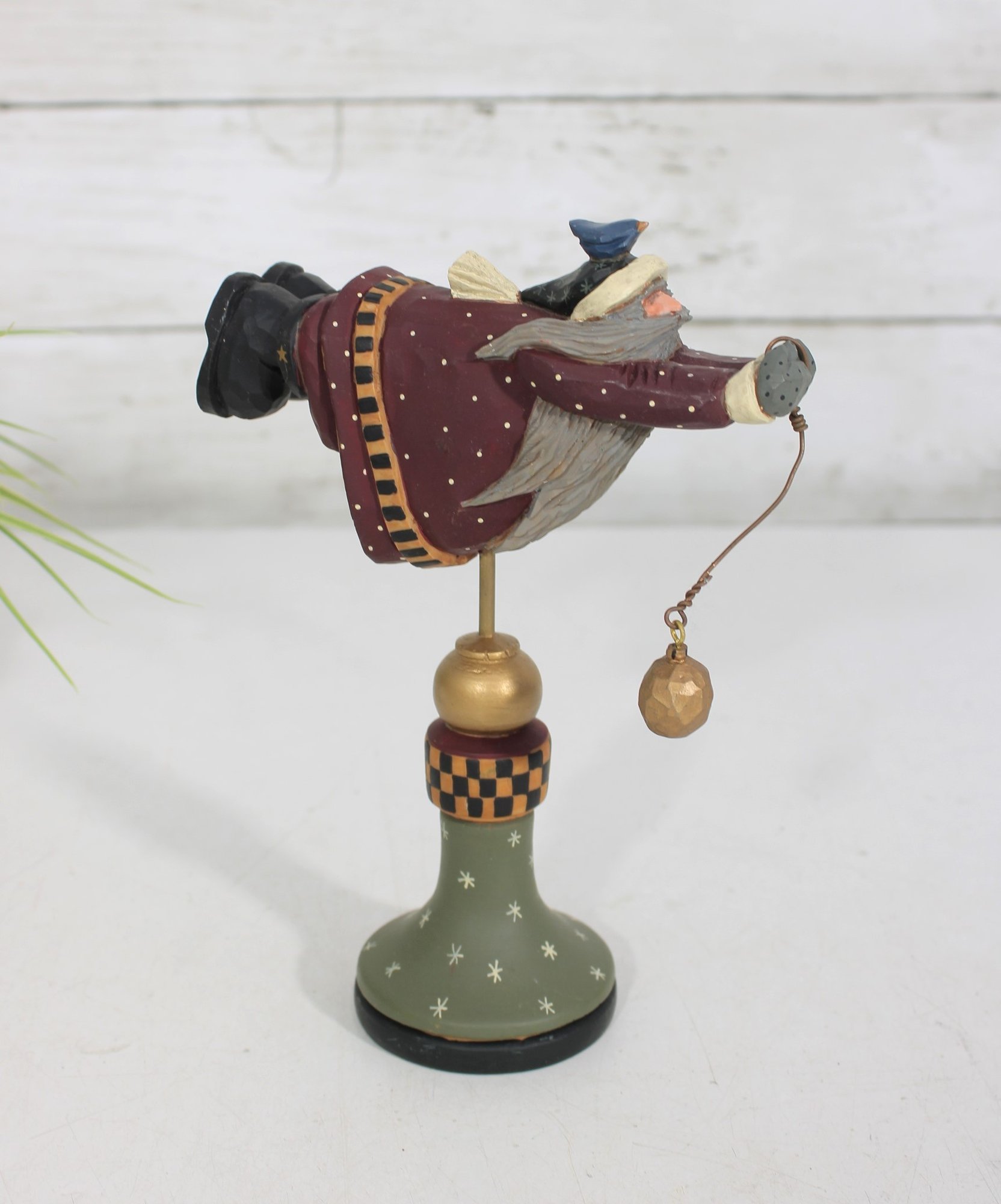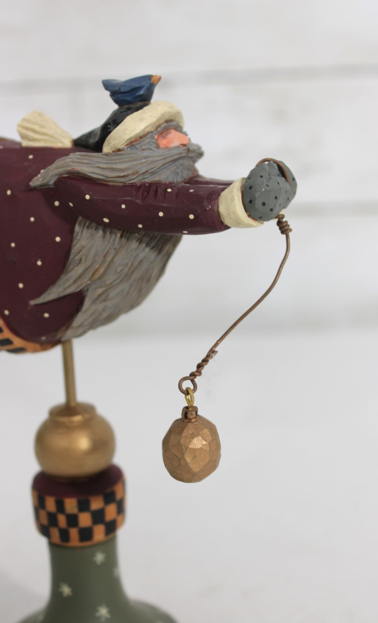 Whimsical and unique Williraye Studio Santa figurine, standing approximately 7 inches tall. This charming folk art piece features Santa in a playful “flying” or balancing pose, mounted on a decorative pedestal with a dangling weight that adds movement and visual interest.