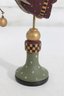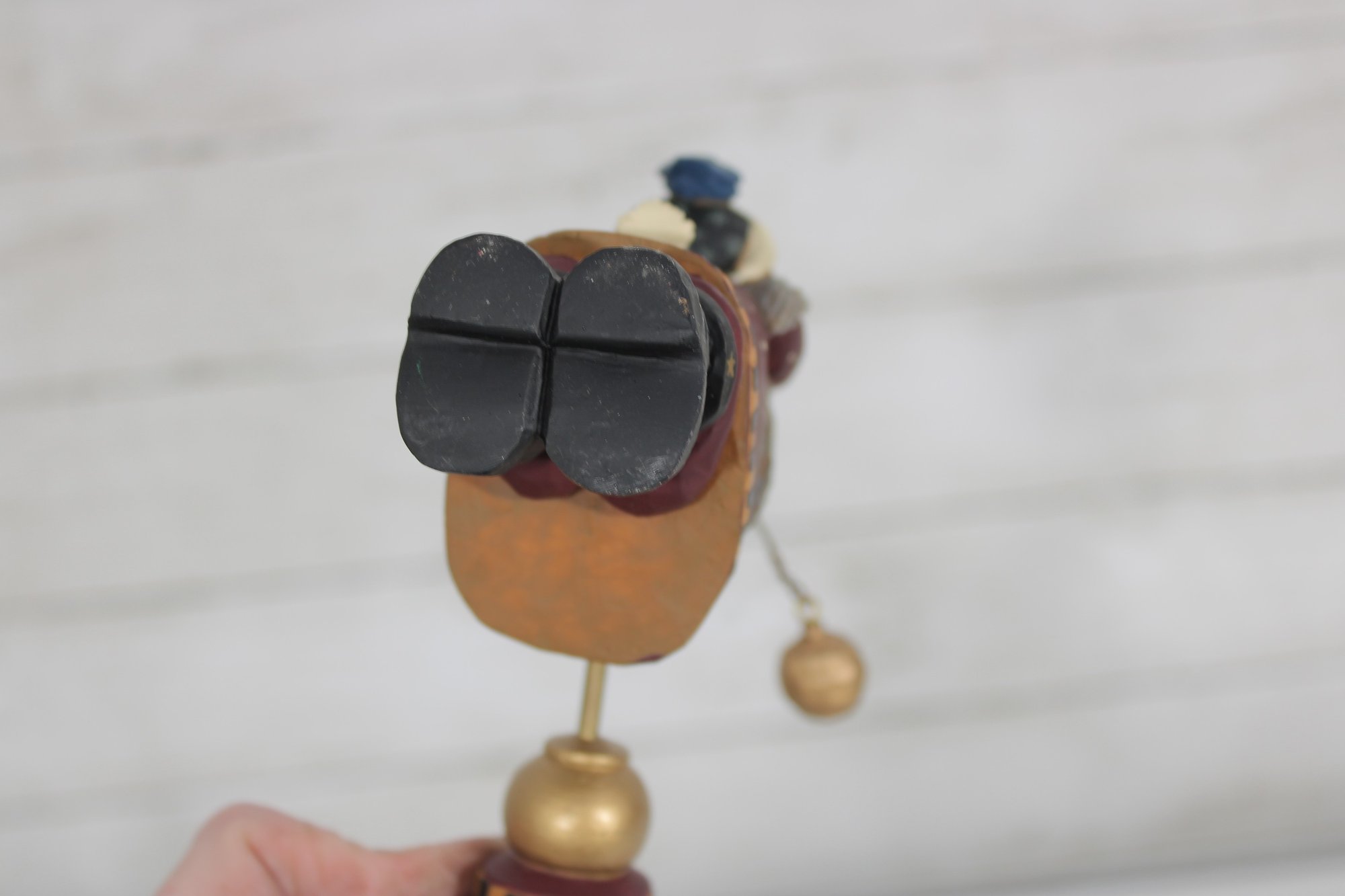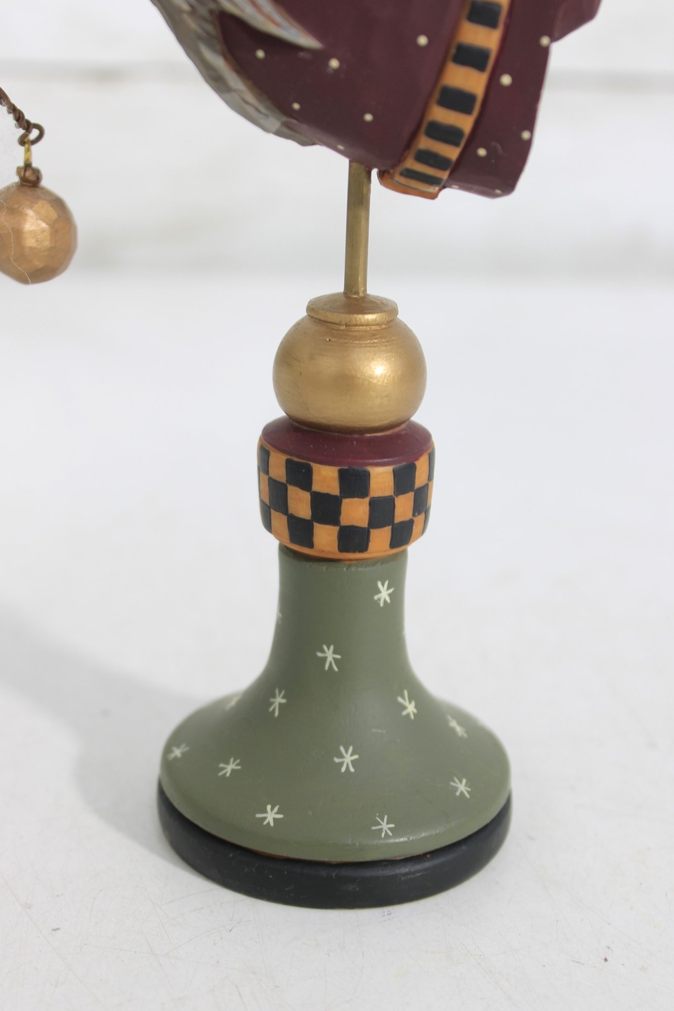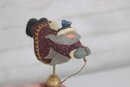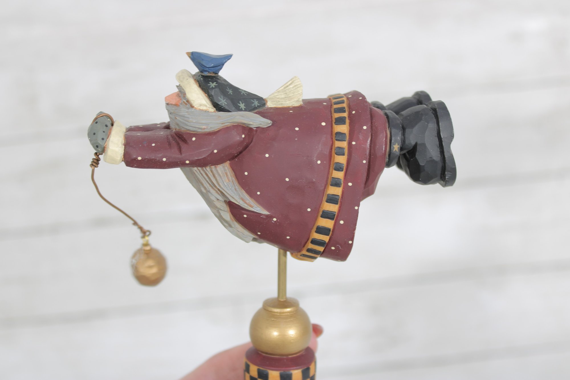 Whimsical and unique Williraye Studio Santa figurine, standing approximately 7 inches tall. This charming folk art piece features Santa in a playful “flying” or balancing pose, mounted on a decorative pedestal with a dangling weight that adds movement and visual interest.