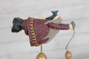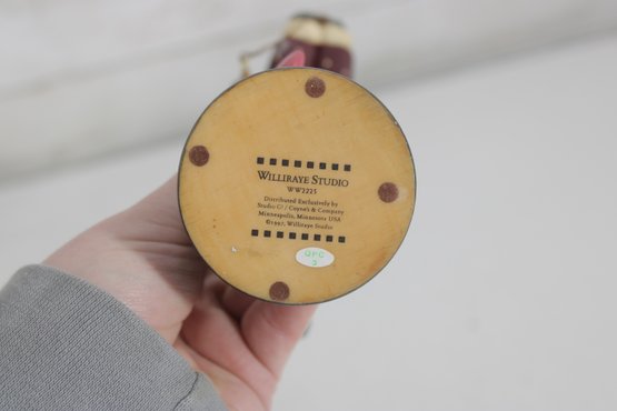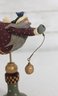 Santa is dressed in a richly textured coat with hand-painted details, including subtle patterns and muted holiday tones typical of Williraye’s signature style. A small bird companion rests on his back, adding to the storytelling charm of the piece. The dangling element enhances the sense of motion, making this a standout decorative item.