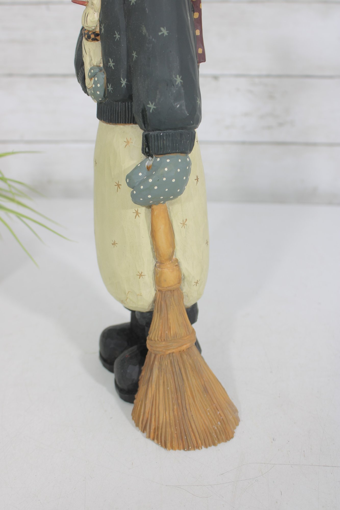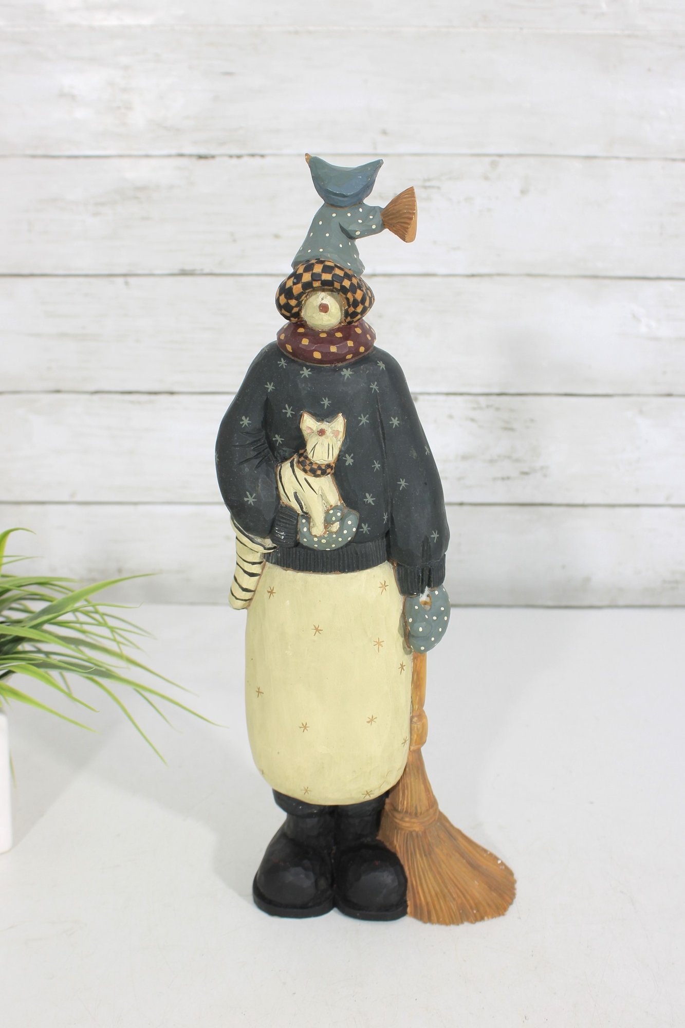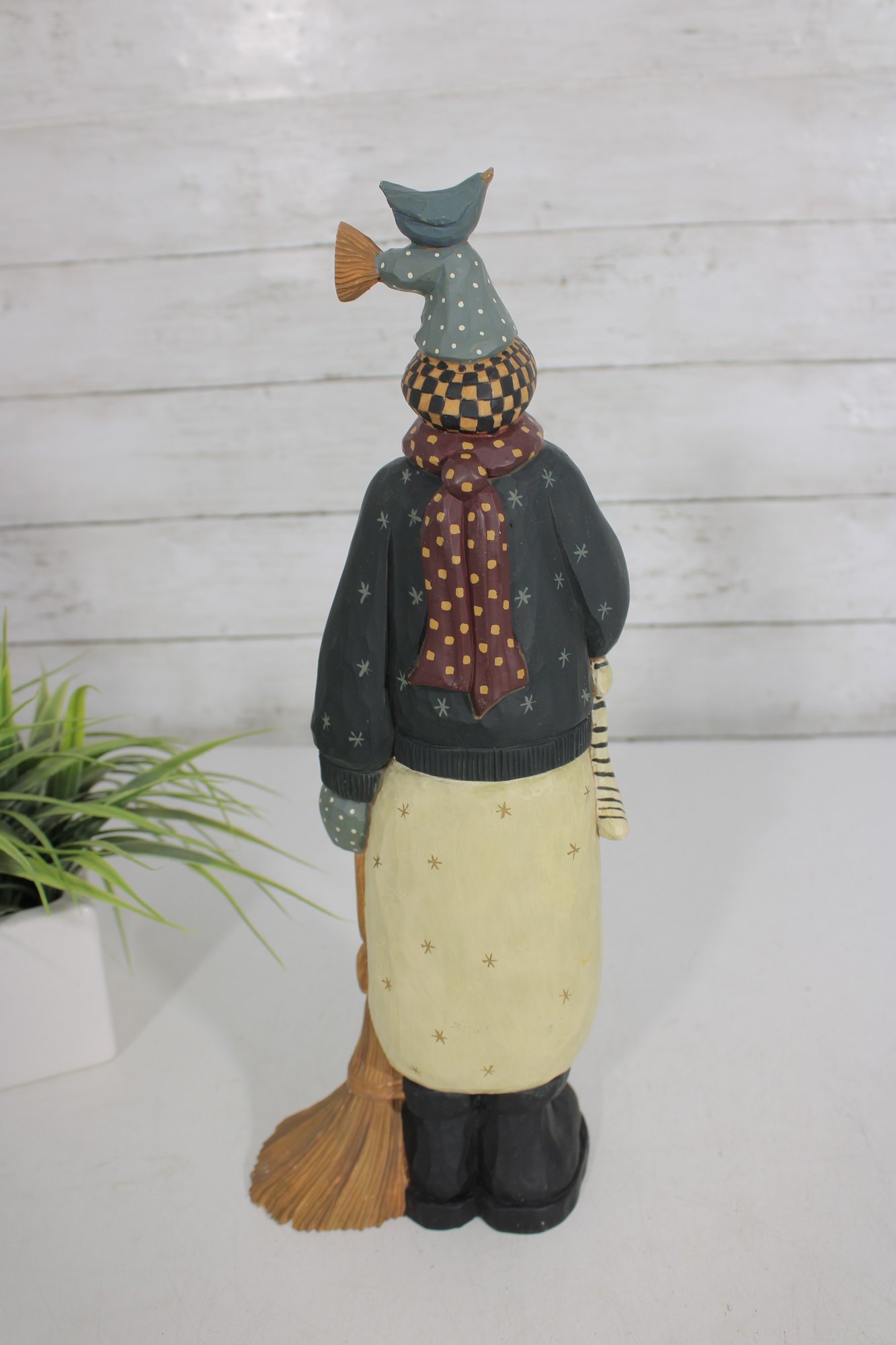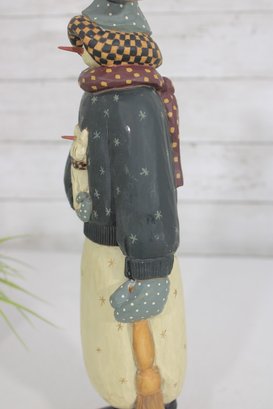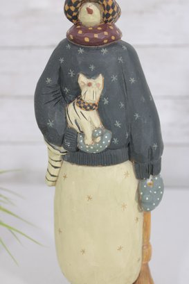 Charming Williraye Studio handcrafted winter figurine, standing approximately 14 inches tall. This whimsical folk art piece features a bundled figure dressed in a textured winter coat, accented with a patterned scarf and a small bird perched atop the hat. The figure holds a broom and showcases a sweet cat motif on the front, adding to its cozy, storybook appeal.