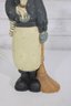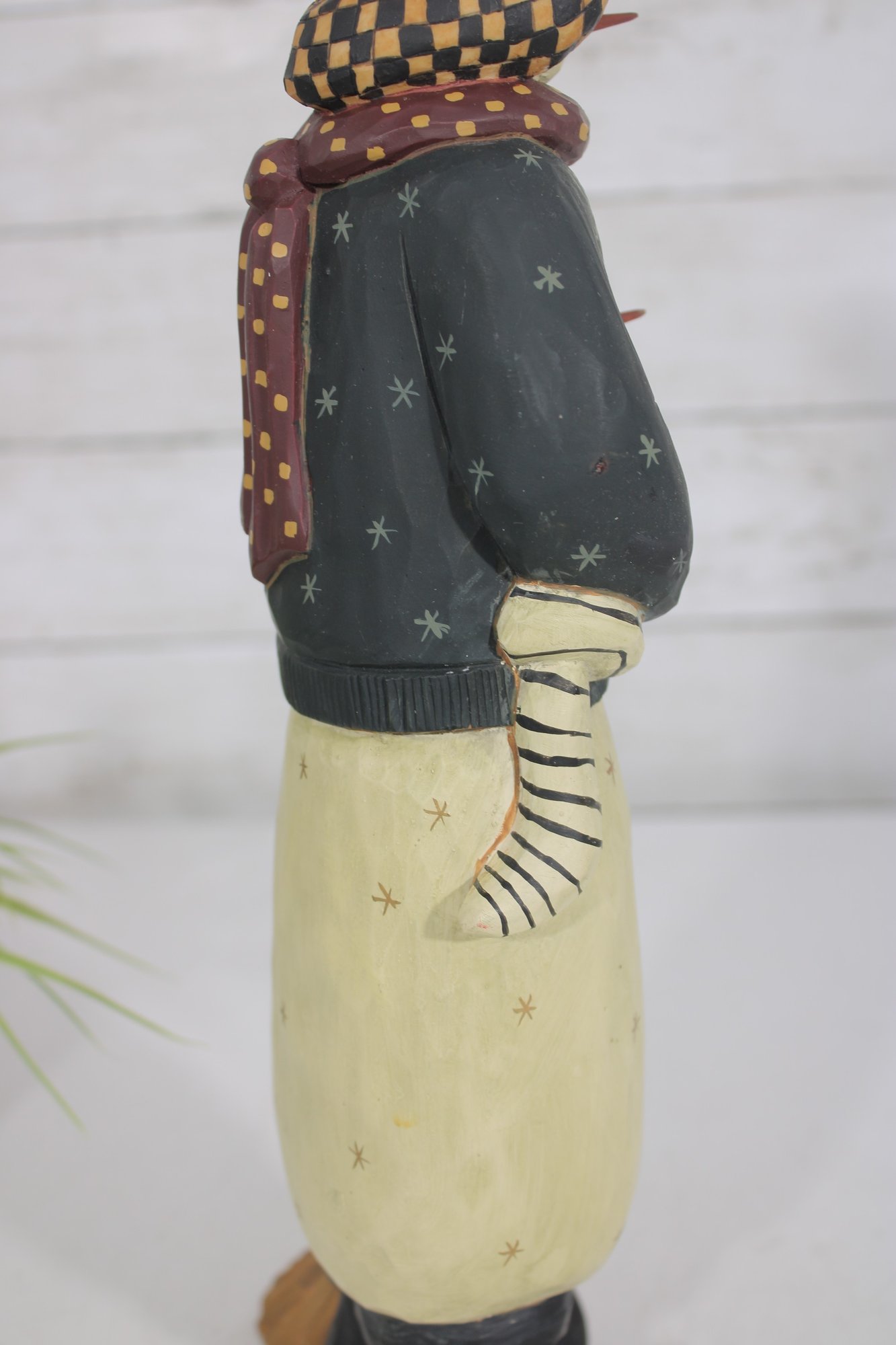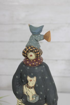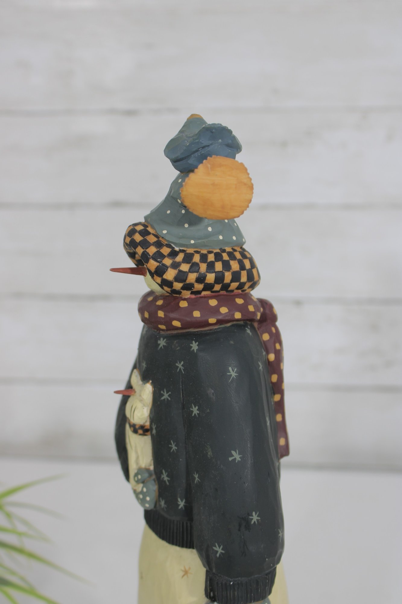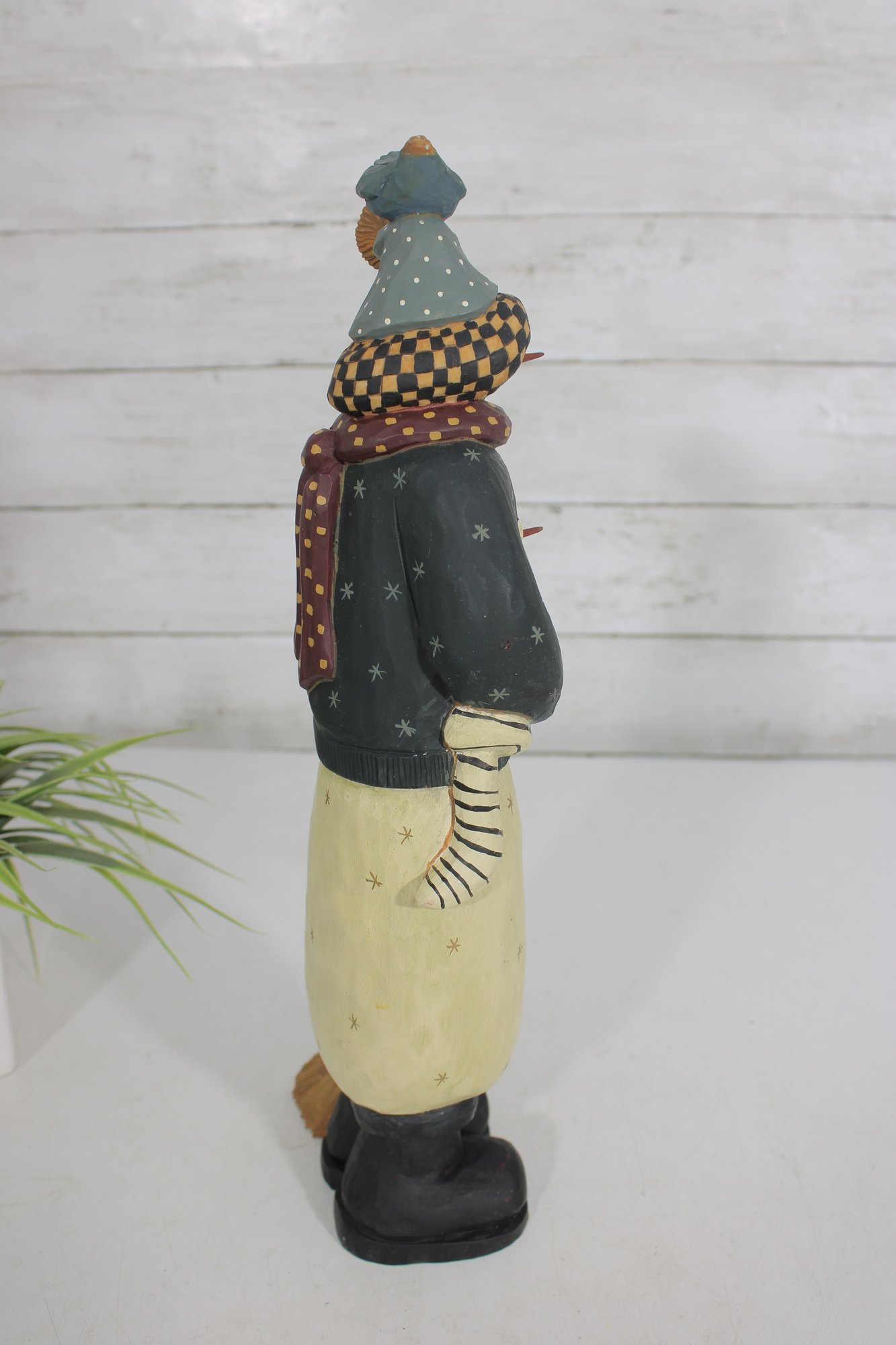 Charming Williraye Studio handcrafted winter figurine, standing approximately 14 inches tall. This whimsical folk art piece features a bundled figure dressed in a textured winter coat, accented with a patterned scarf and a small bird perched atop the hat. The figure holds a broom and showcases a sweet cat motif on the front, adding to its cozy, storybook appeal.