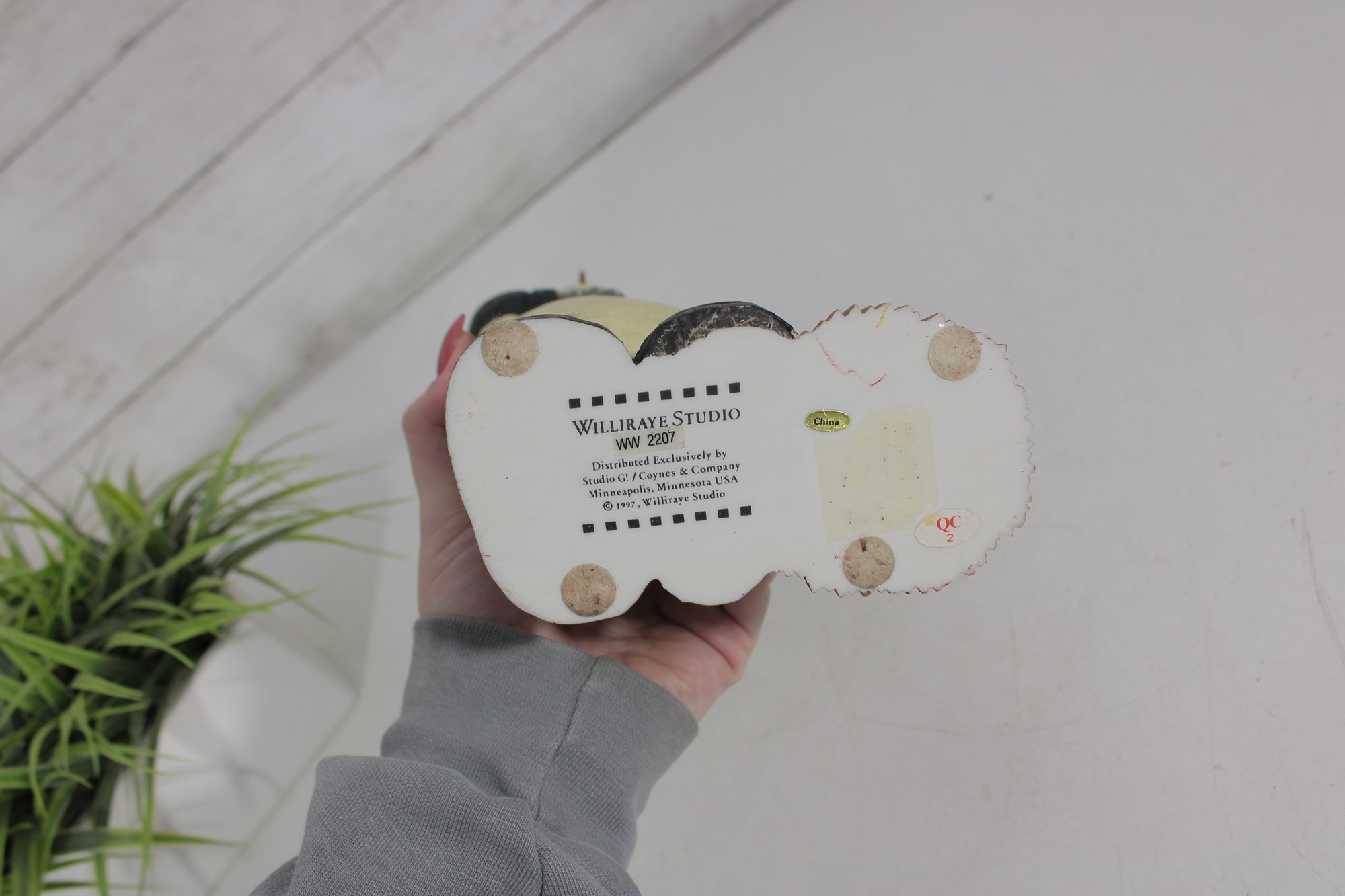 Beautifully detailed in Williraye’s signature muted color palette, this piece highlights hand-painted finishes, subtle distressing, and intricate folk art styling. The base is clearly marked with the Williraye Studio label.