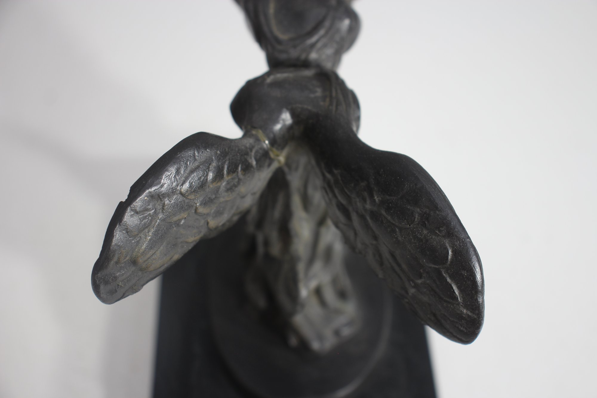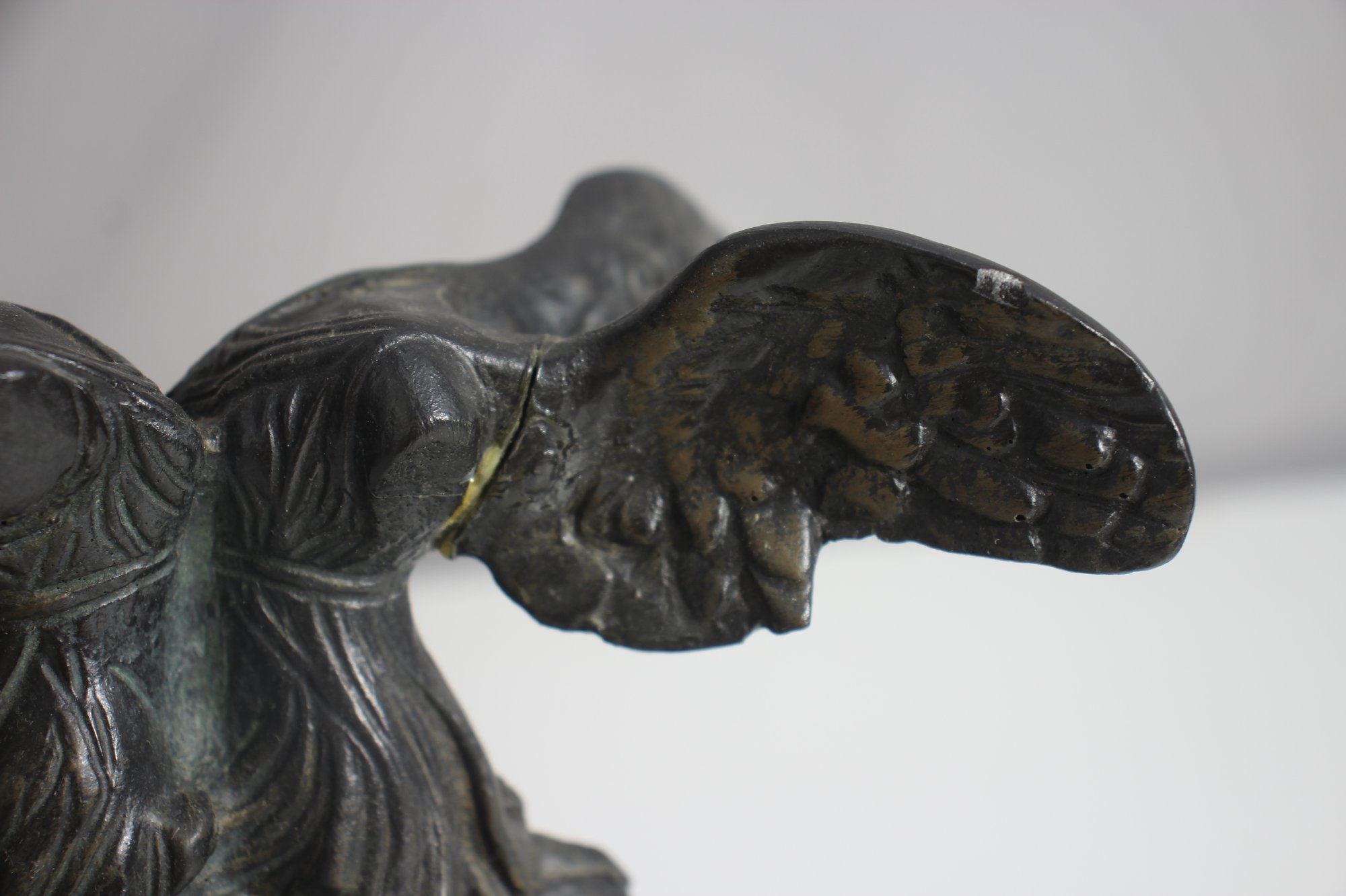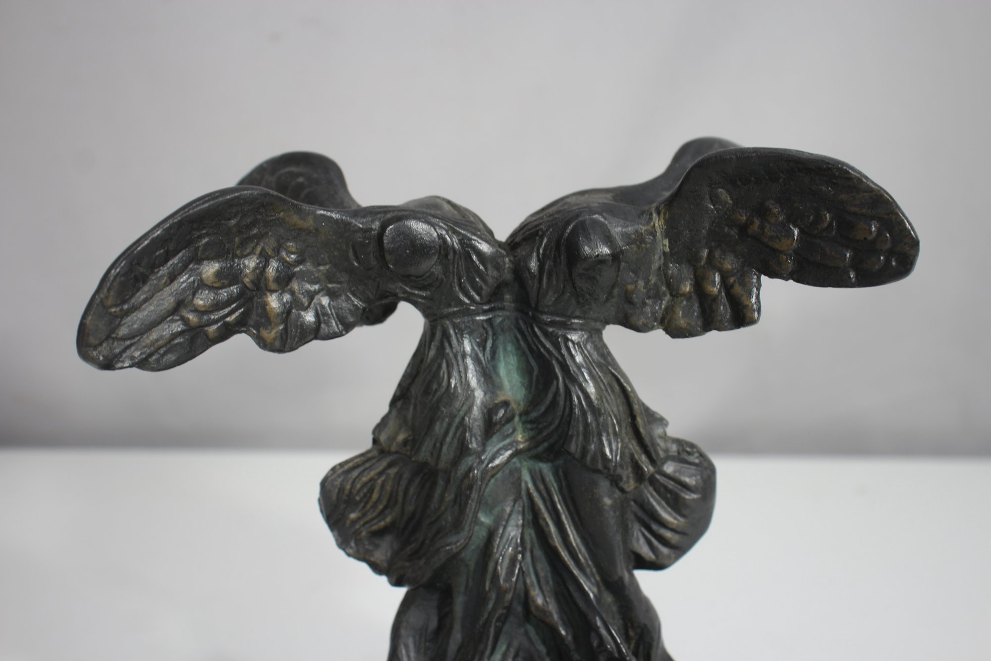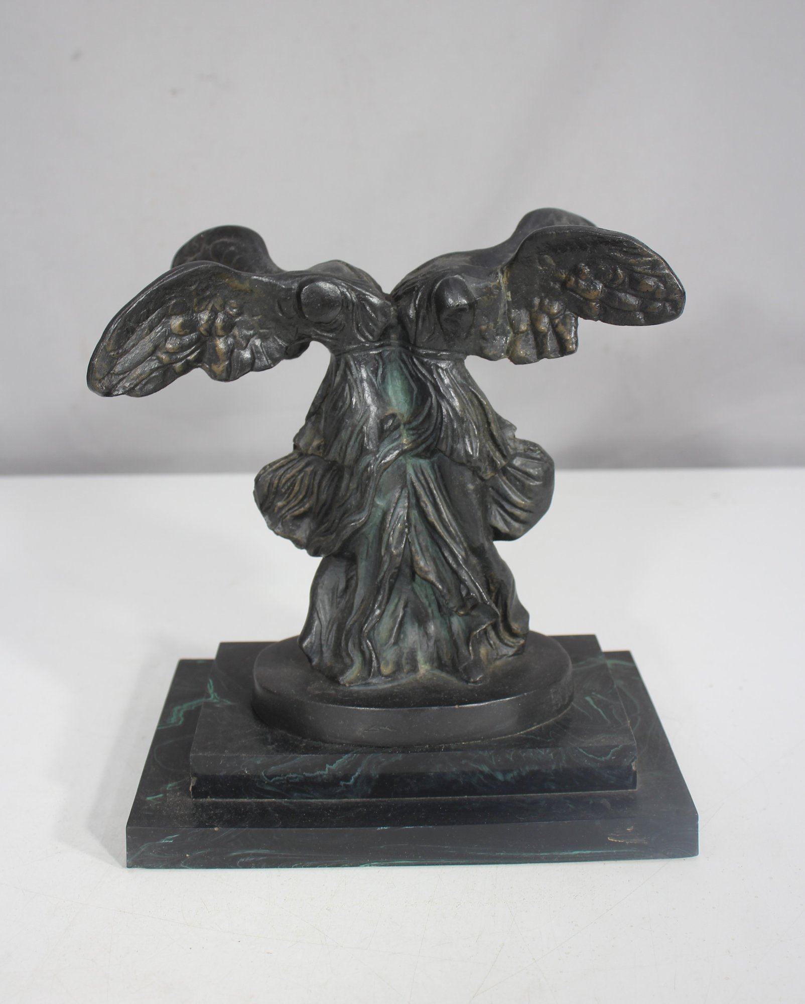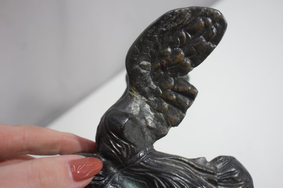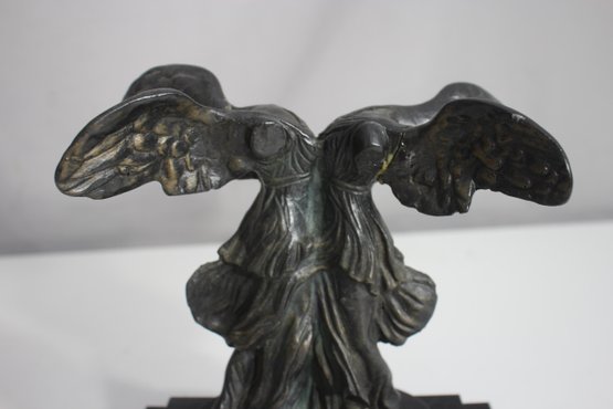 The piece has undergone a repair, visible on the wings, but remains an elegant and collectible display item. The patina adds to its aged charm, making it a perfect addition to any classical art collection.
