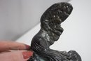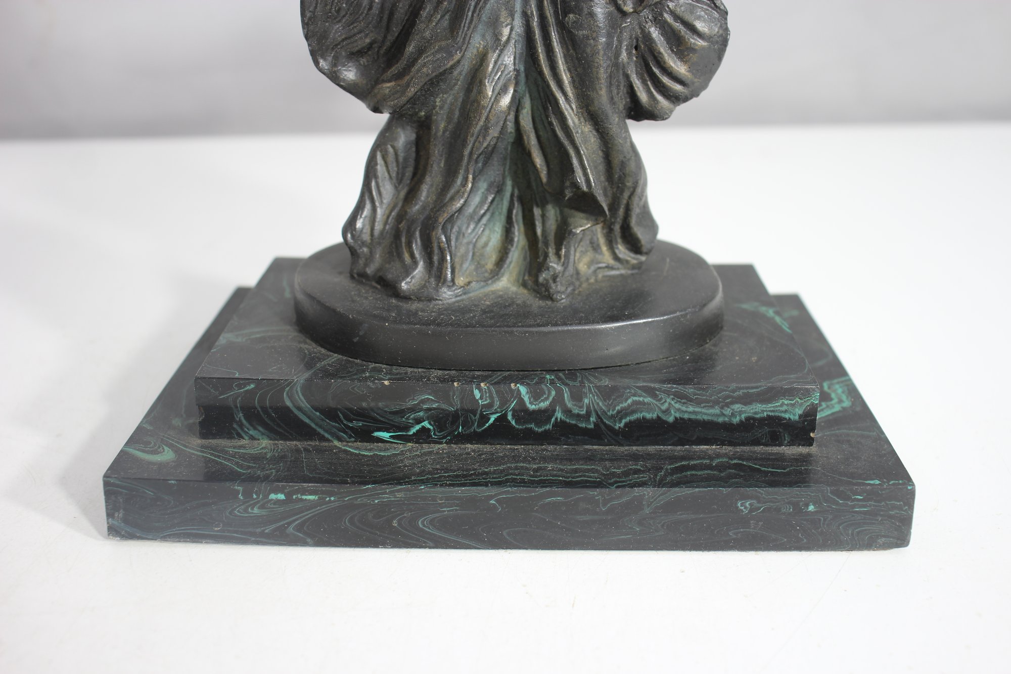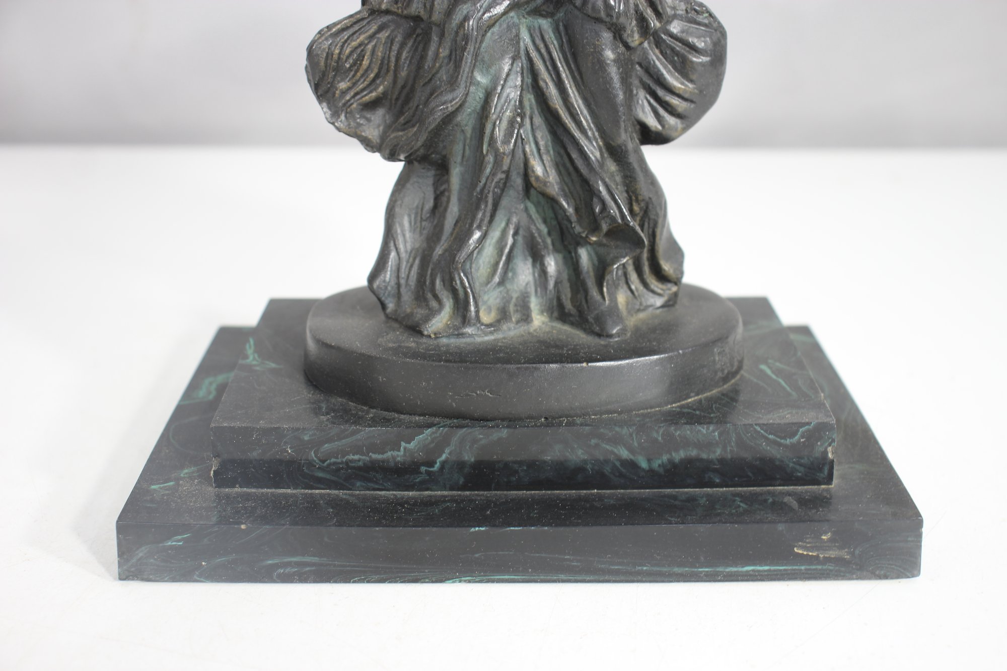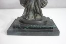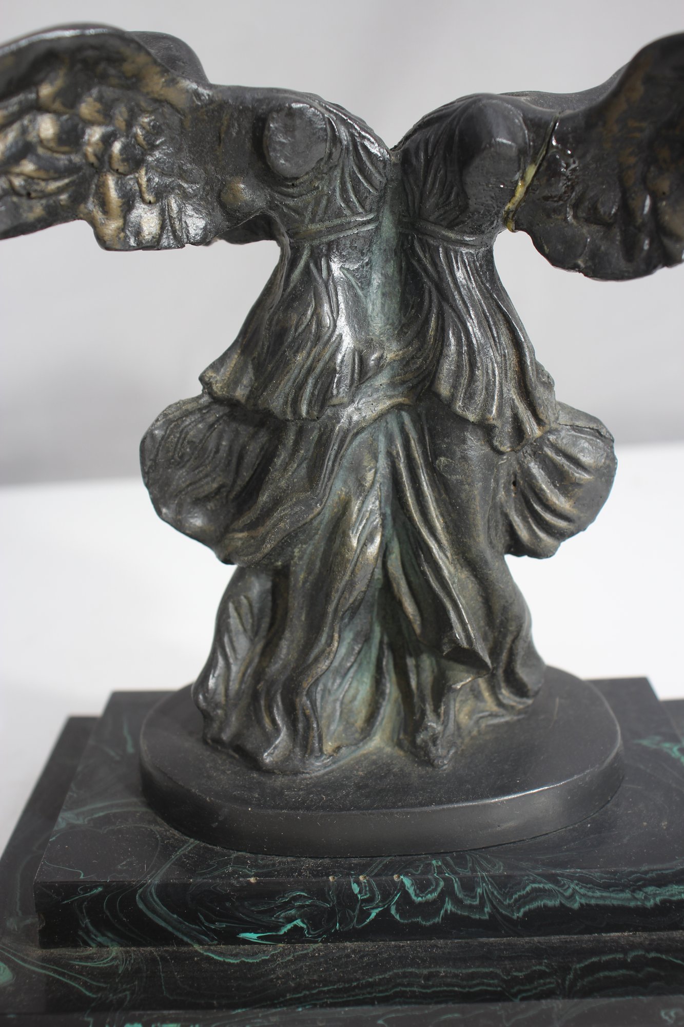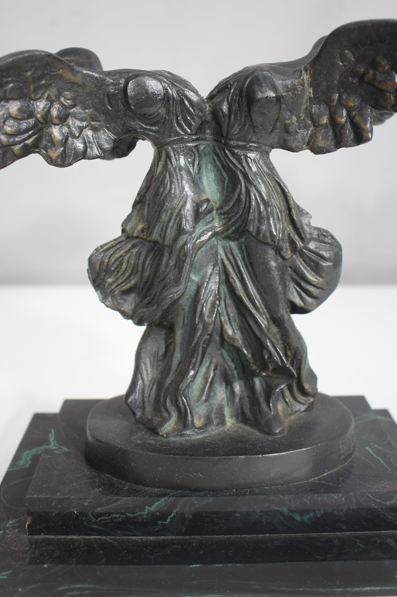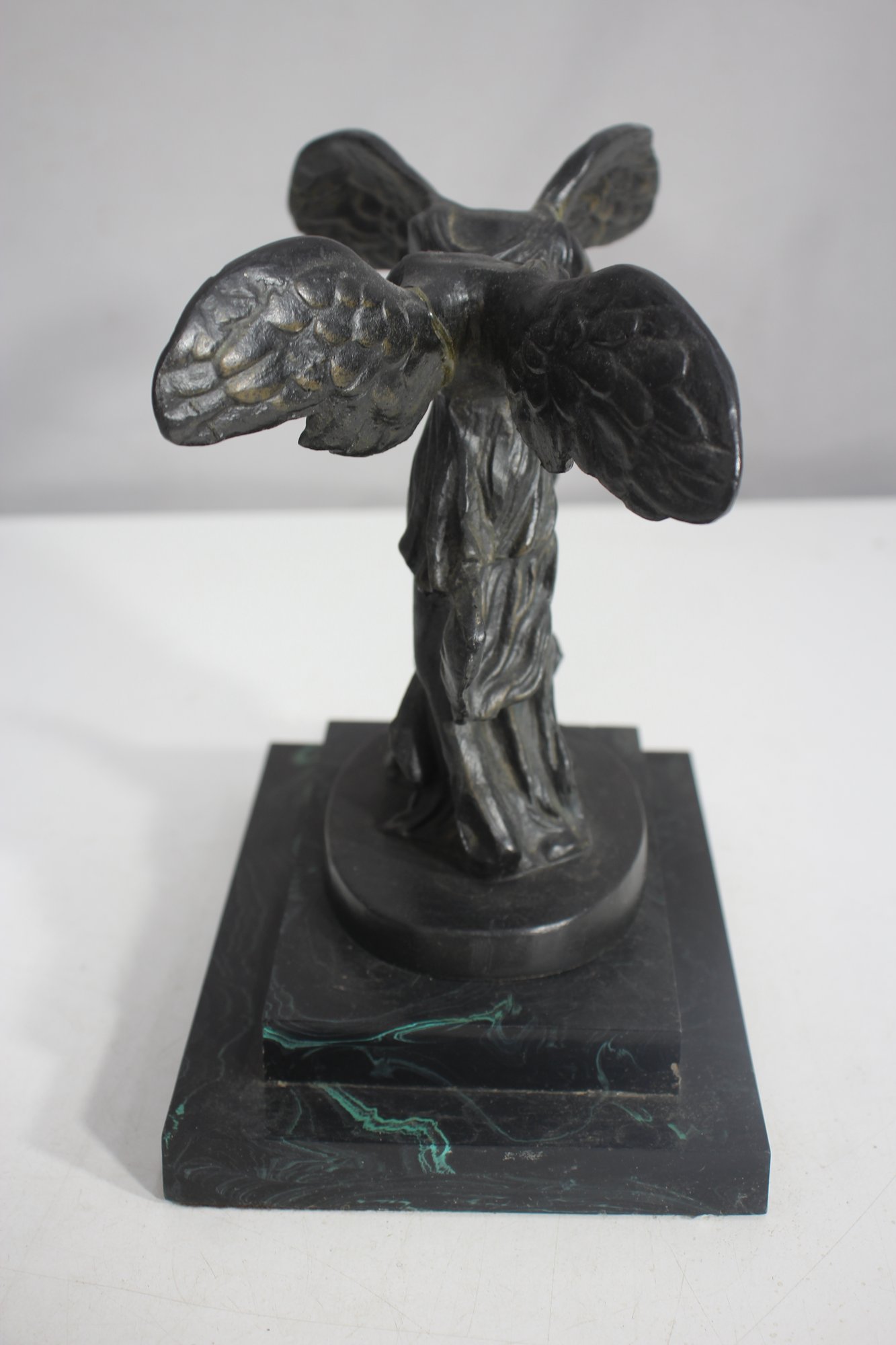 The piece has undergone a repair, visible on the wings, but remains an elegant and collectible display item. The patina adds to its aged charm, making it a perfect addition to any classical art collection.