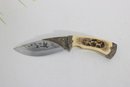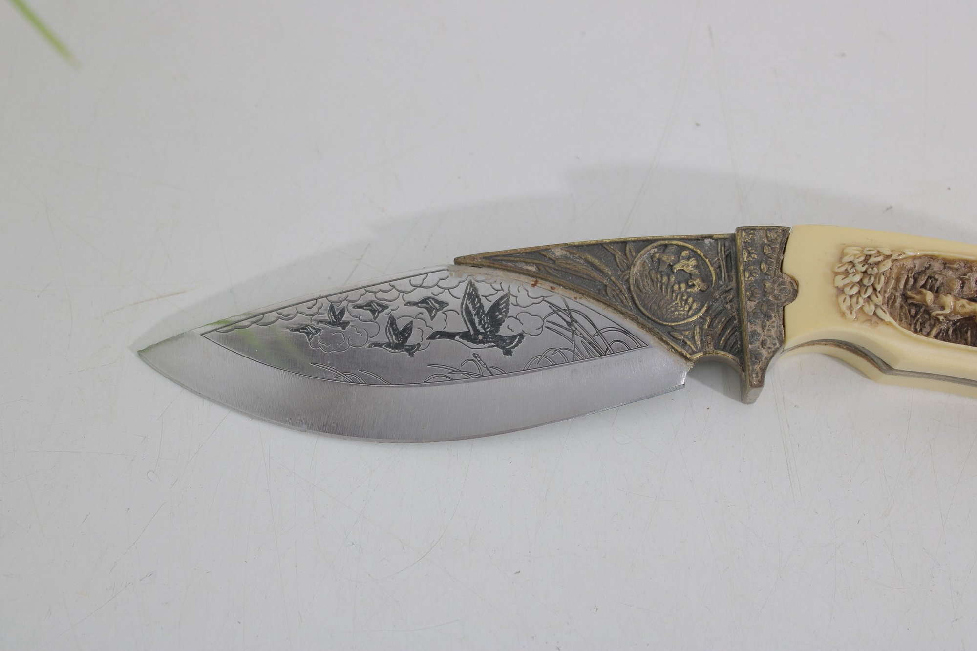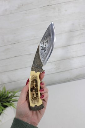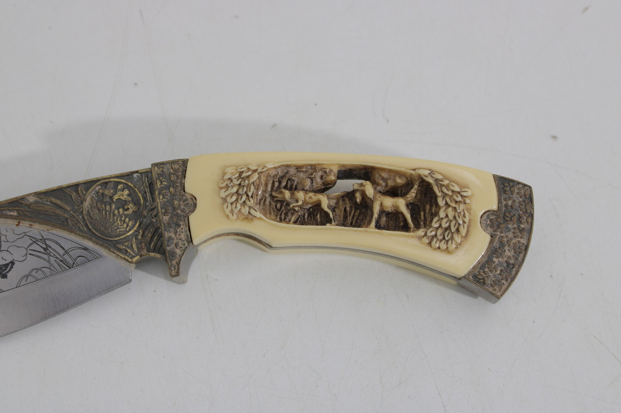 The handle has a faux bone appearance with raised relief carving of a hunting dog in a woodland setting, framed by detailed metalwork at the bolster and pommel. The blade features engraved designs, adding to its collectible appeal.