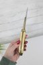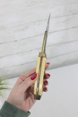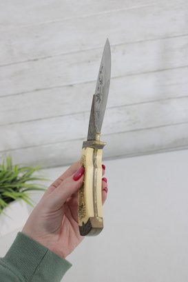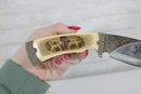 Unique WMG 2006 hunting display knife featuring an intricately carved handle with a detailed Labrador pointer dog scene. Measuring approximately 9.5 inches in length, this decorative knife showcases a beautifully etched blade with wildlife motifs and ornate metal accents.