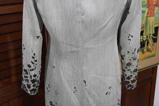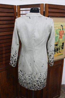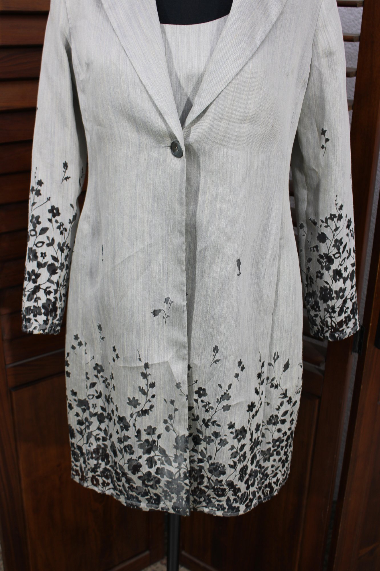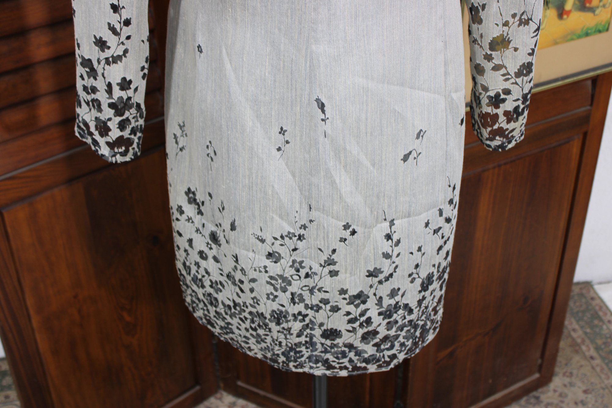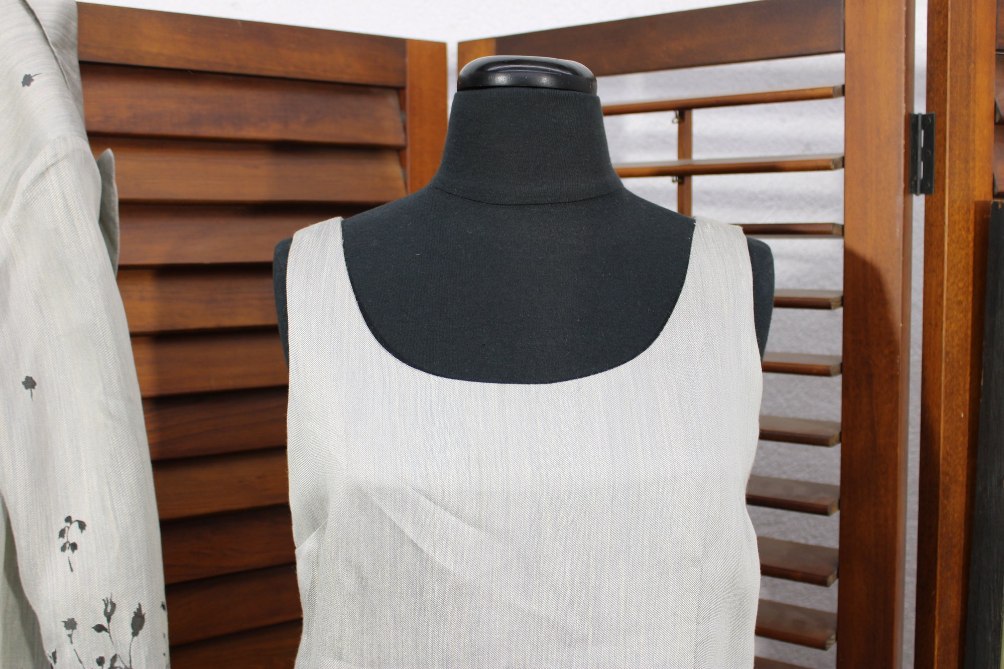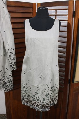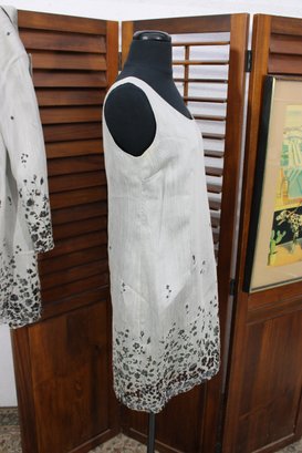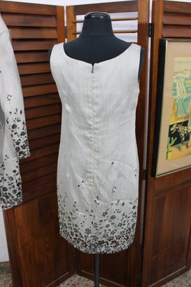a lovely women’s two-piece outfit featuring a sleeveless dress with a matching sheer jacket. The set is done in soft white with delicate dark floral detailing along the hem and cuffs, creating an elegant and feminine look. The dress has a simple, flattering silhouette with a back zipper, while the lightweight jacket adds coverage and style.