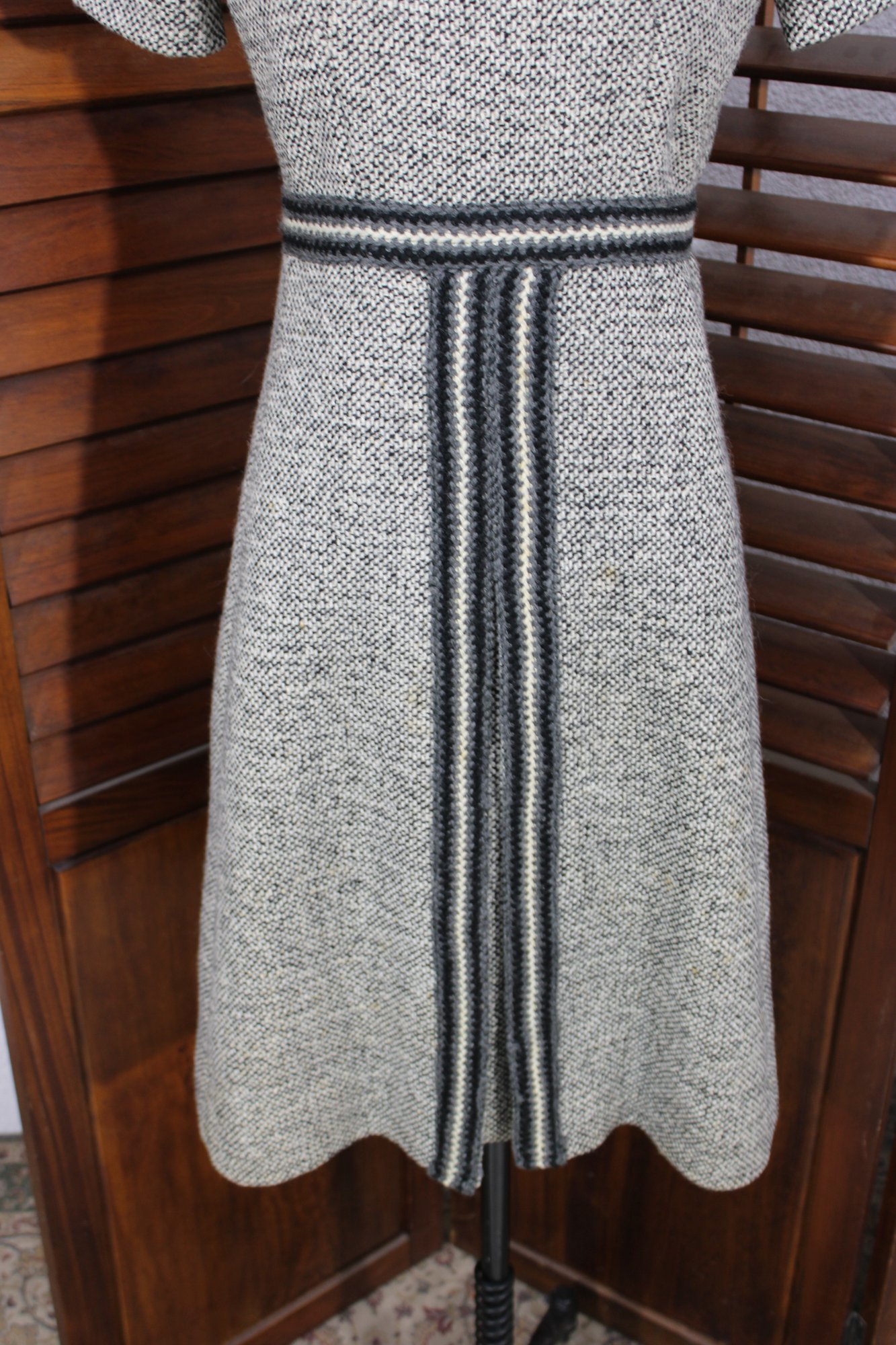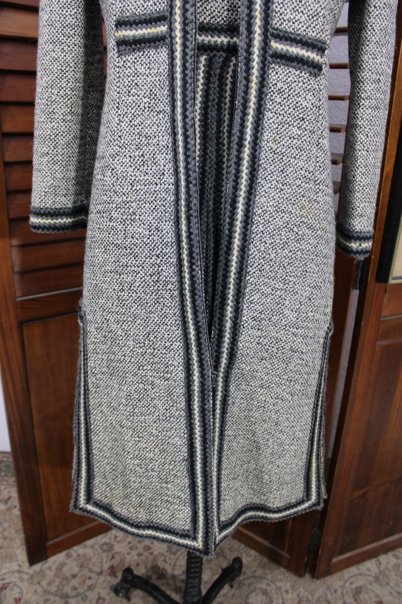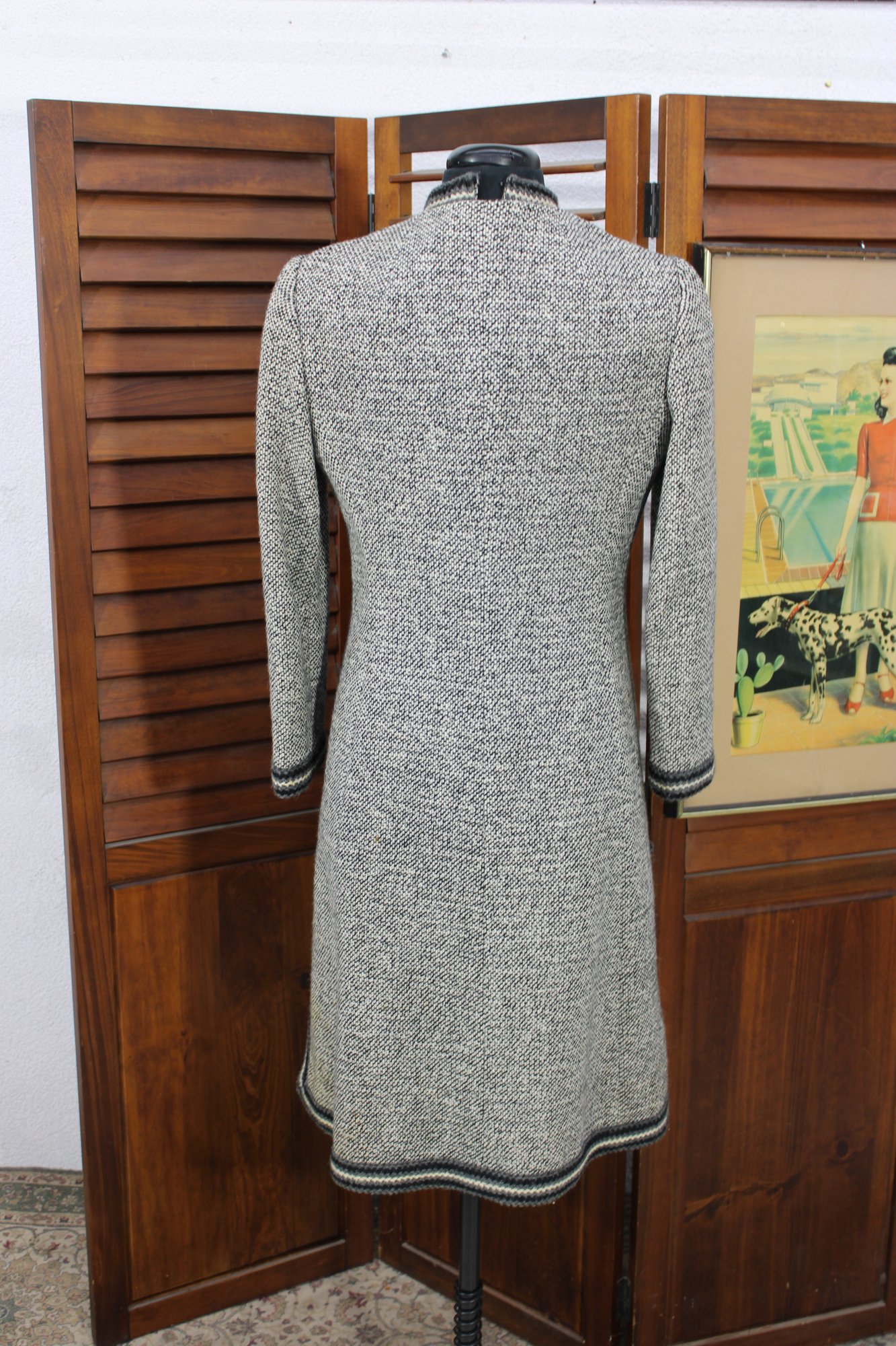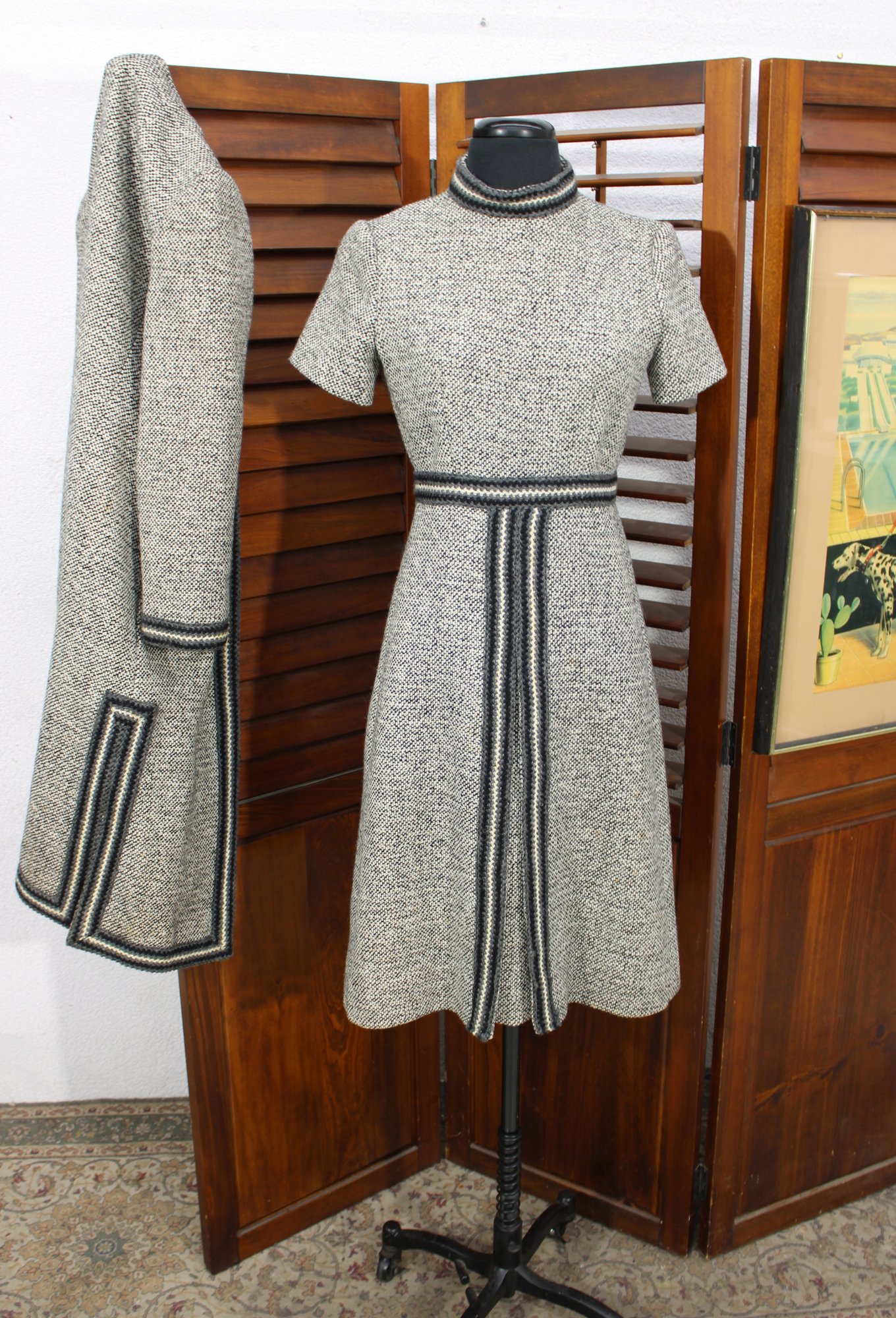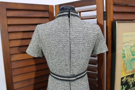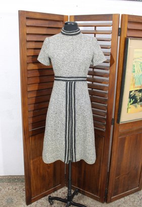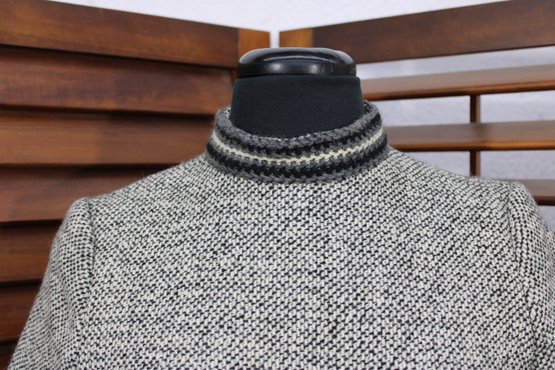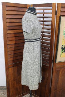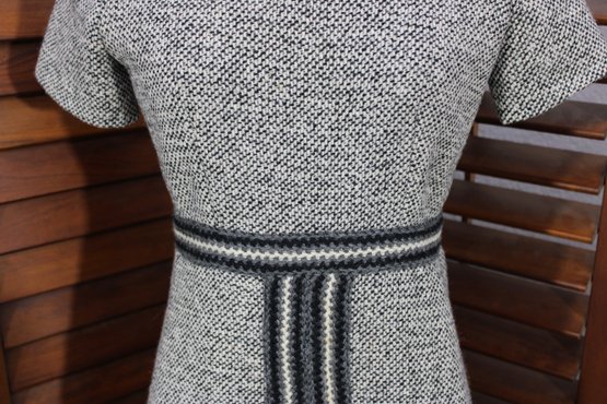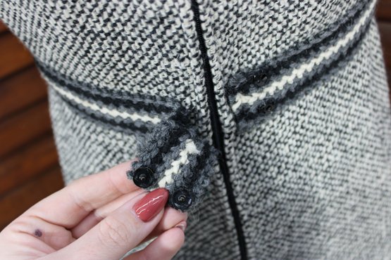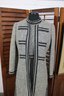 a beautifully coordinated women’s knit dress with matching long coat in a classic black and white pattern. The set features timeless styling with striped accents, a high neckline, and elegant tailoring that creates a polished, vintage-inspired look. The dress has short sleeves, while the matching coat adds length and warmth with decorative trim and front closures.