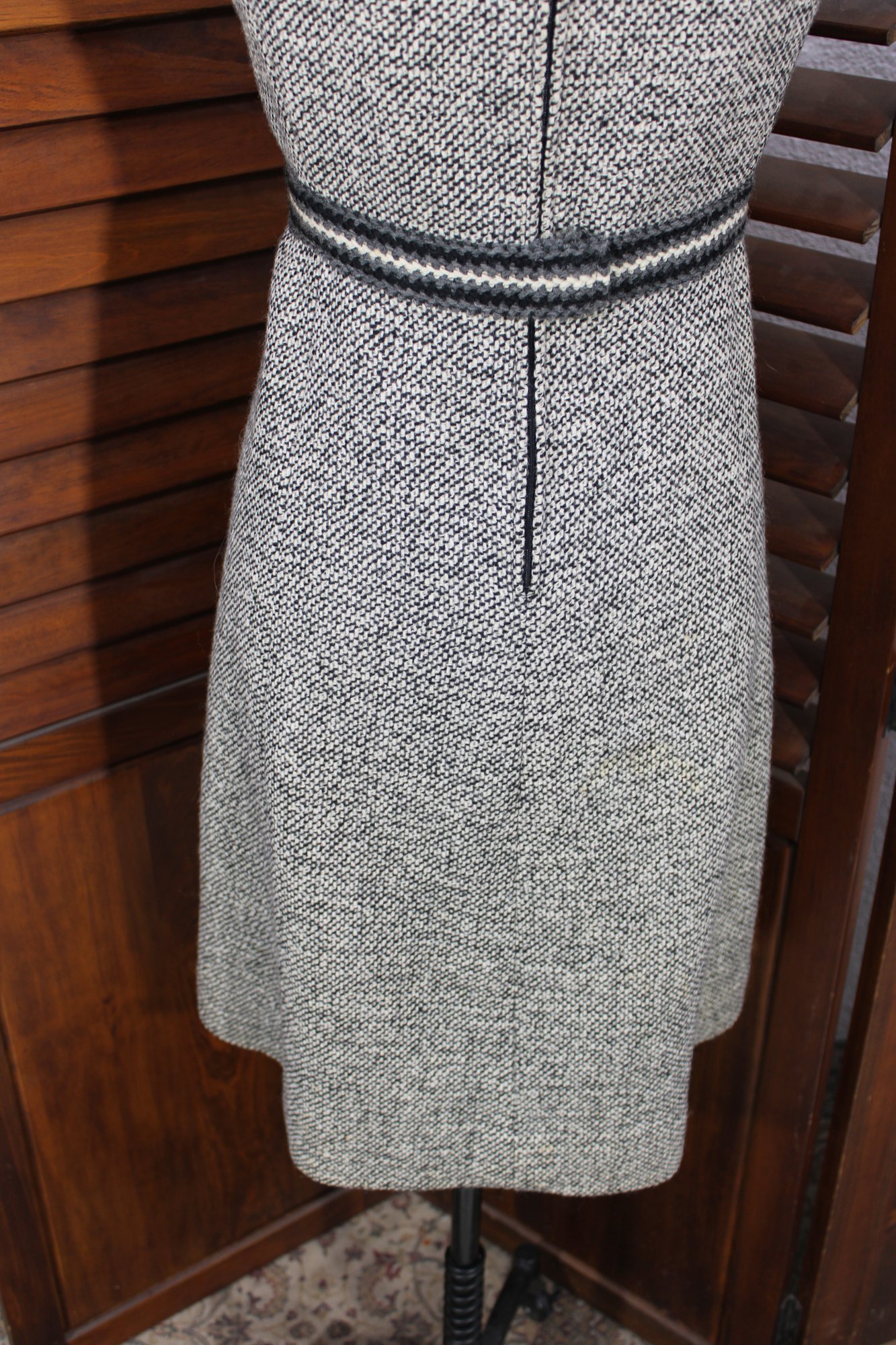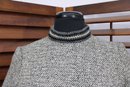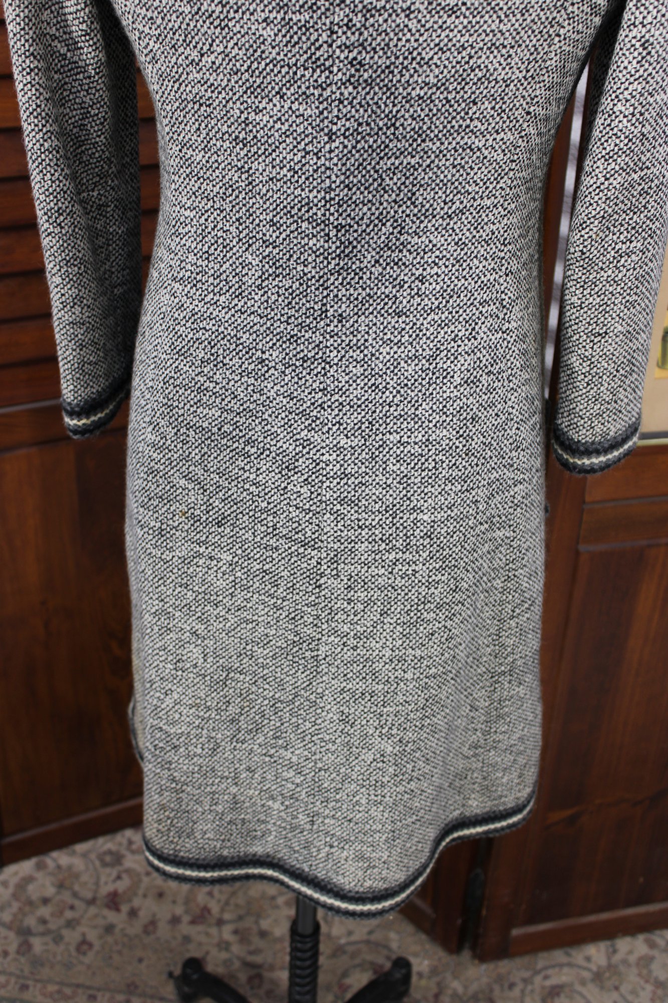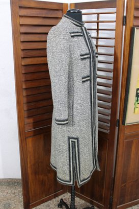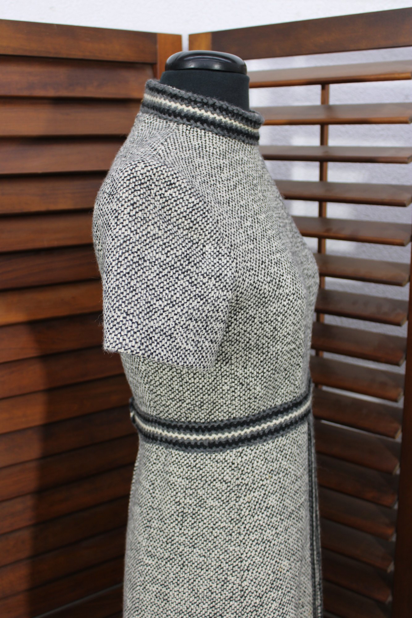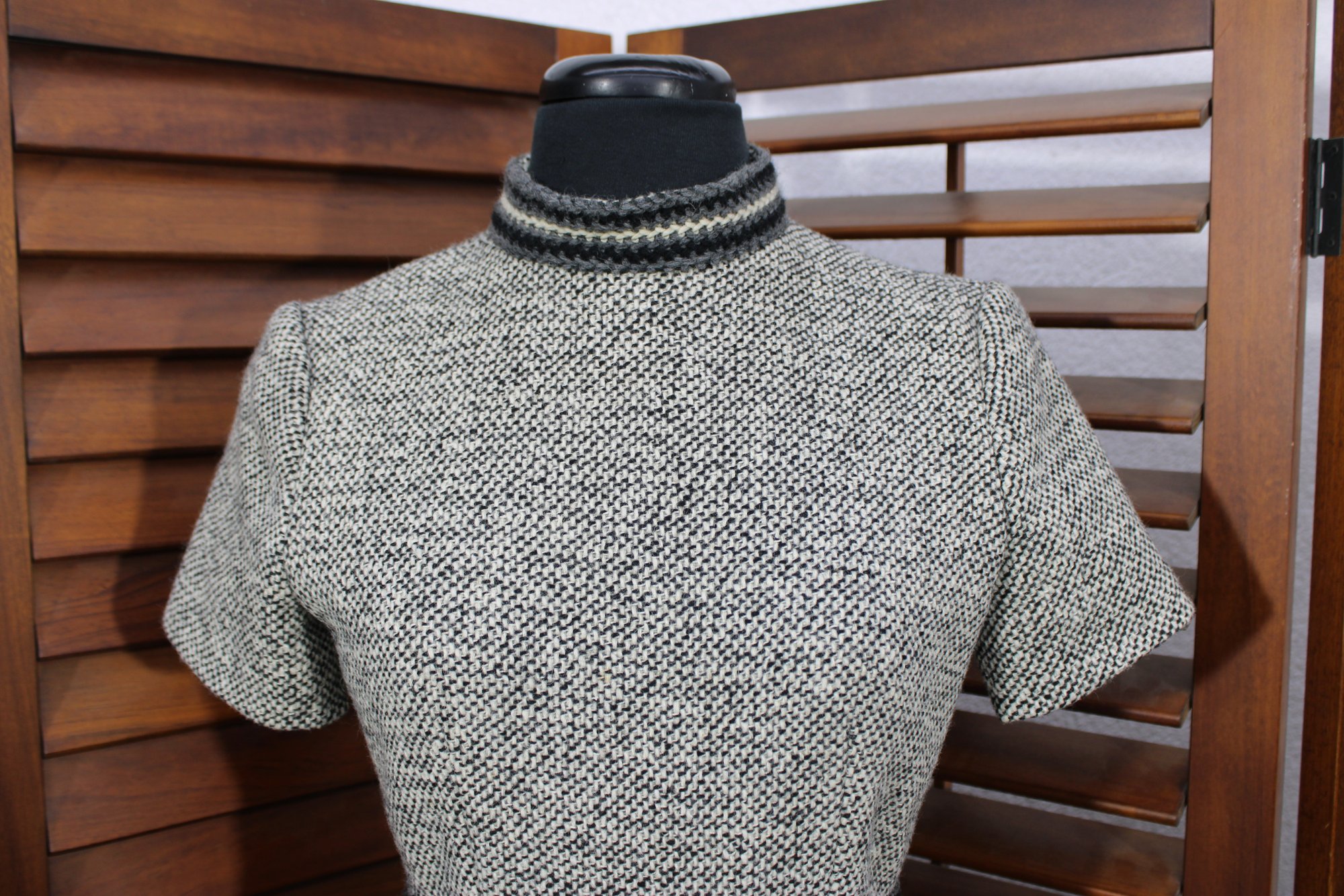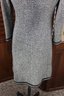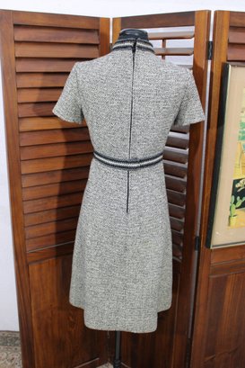a beautifully coordinated women’s knit dress with matching long coat in a classic black and white pattern. The set features timeless styling with striped accents, a high neckline, and elegant tailoring that creates a polished, vintage-inspired look. The dress has short sleeves, while the matching coat adds length and warmth with decorative trim and front closures.