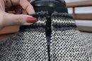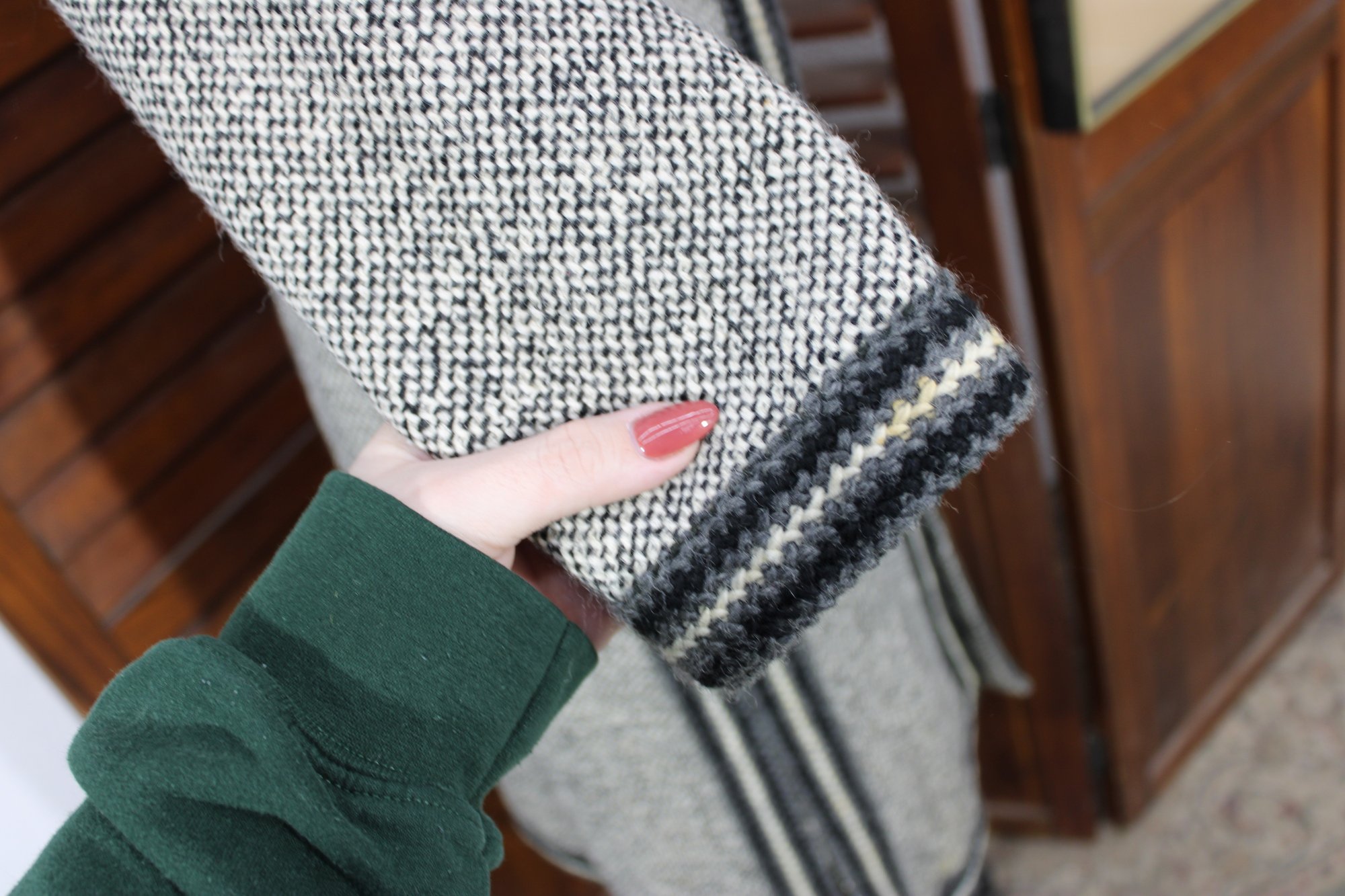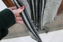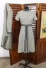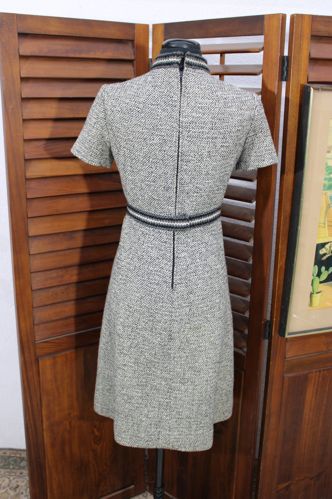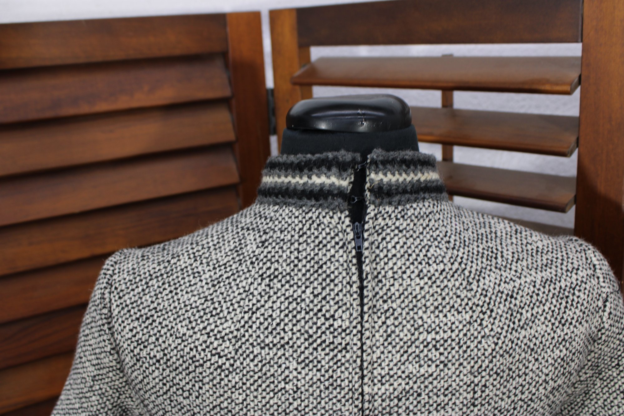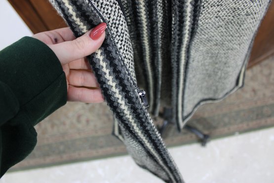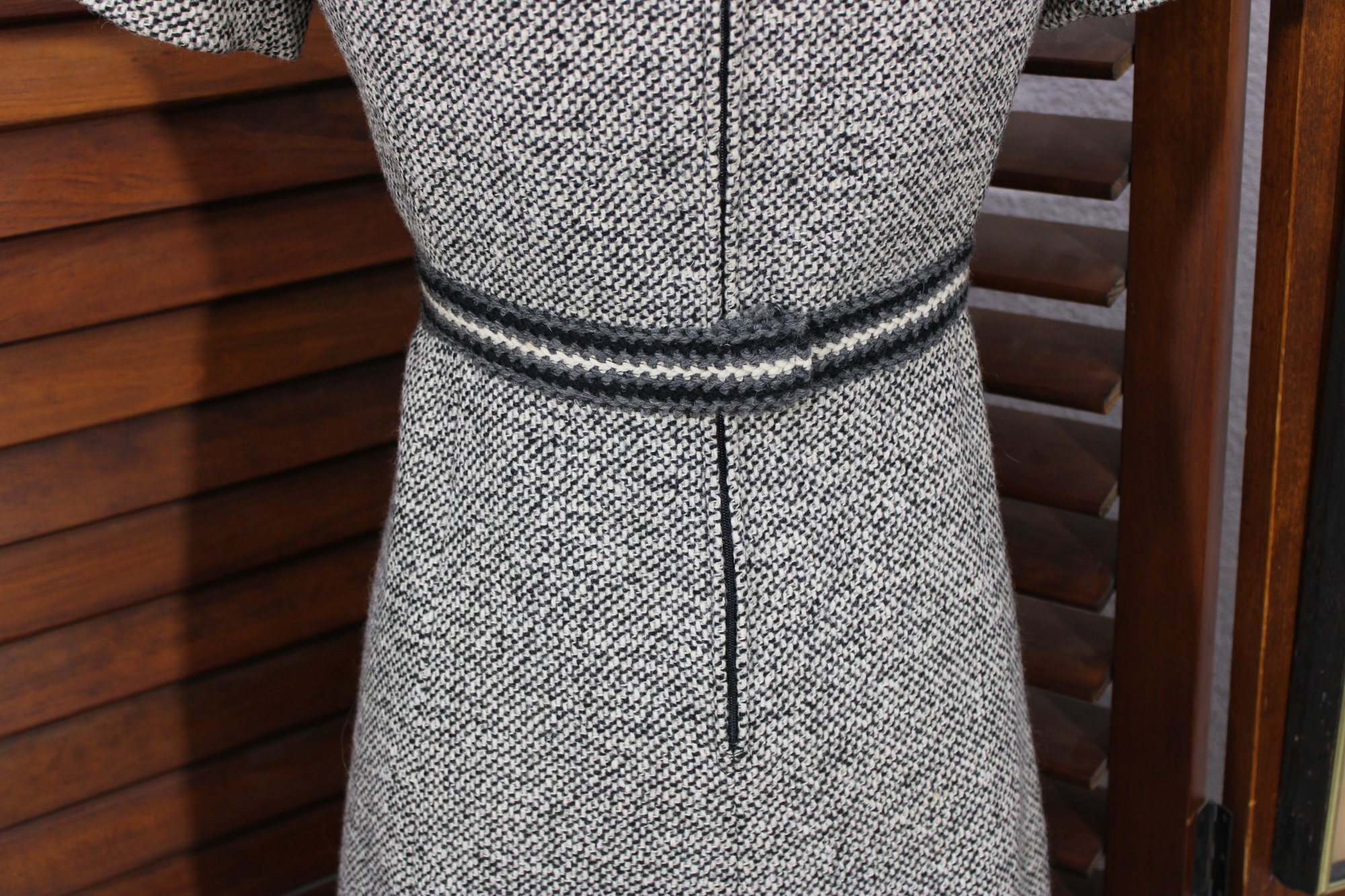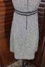 a beautifully coordinated women’s knit dress with matching long coat in a classic black and white pattern. The set features timeless styling with striped accents, a high neckline, and elegant tailoring that creates a polished, vintage-inspired look. The dress has short sleeves, while the matching coat adds length and warmth with decorative trim and front closures.