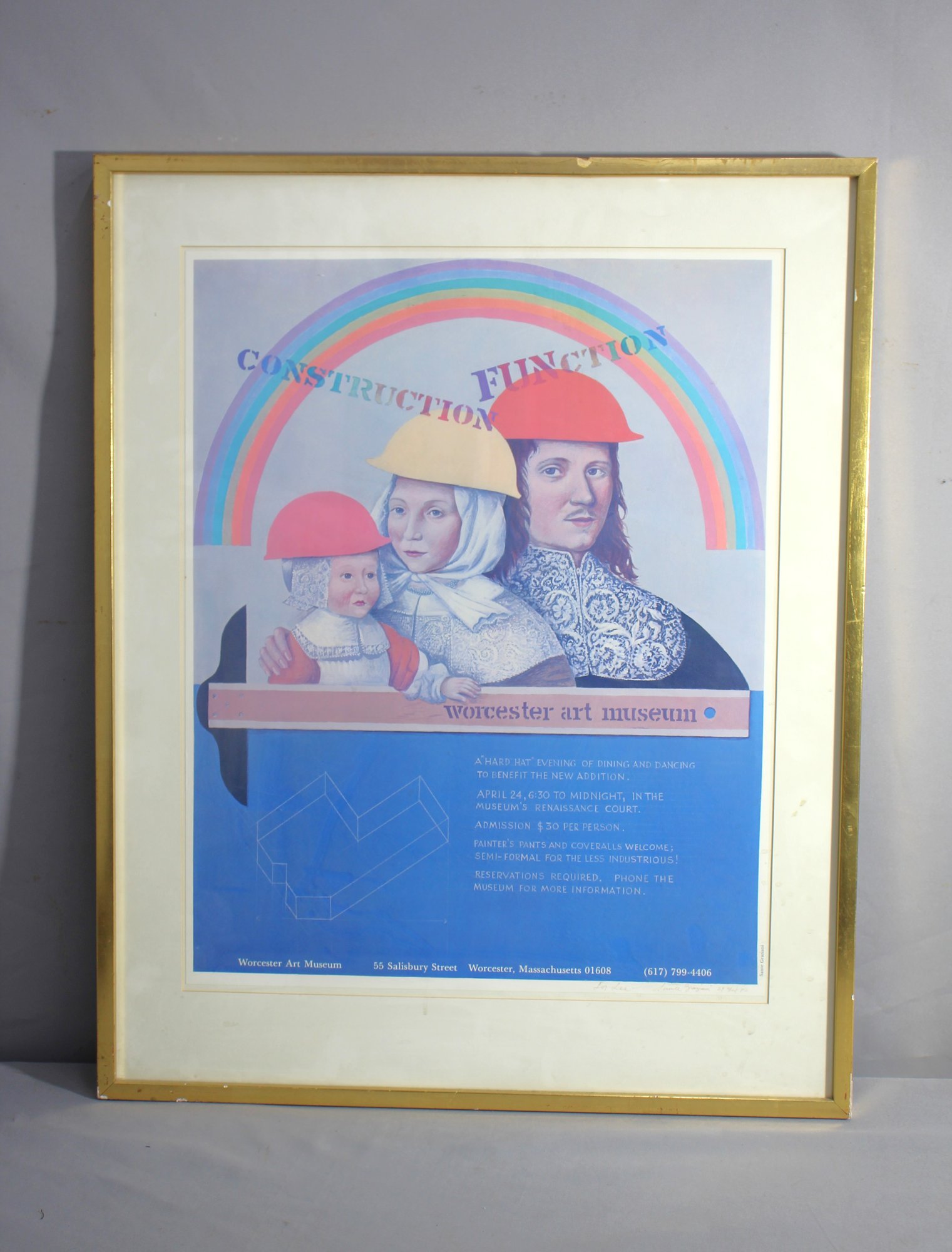 Presenting a vibrant slice of Worcester's cultural history, this framed event poster hails from a whimsical affair at the Worcester Art Museum, aptly titled 'Construction Junction.' A brainchild of the artist Sante Graziani, this piece is both signed and dated, a testament to the merging of historical artistry with the fun of a modern event.