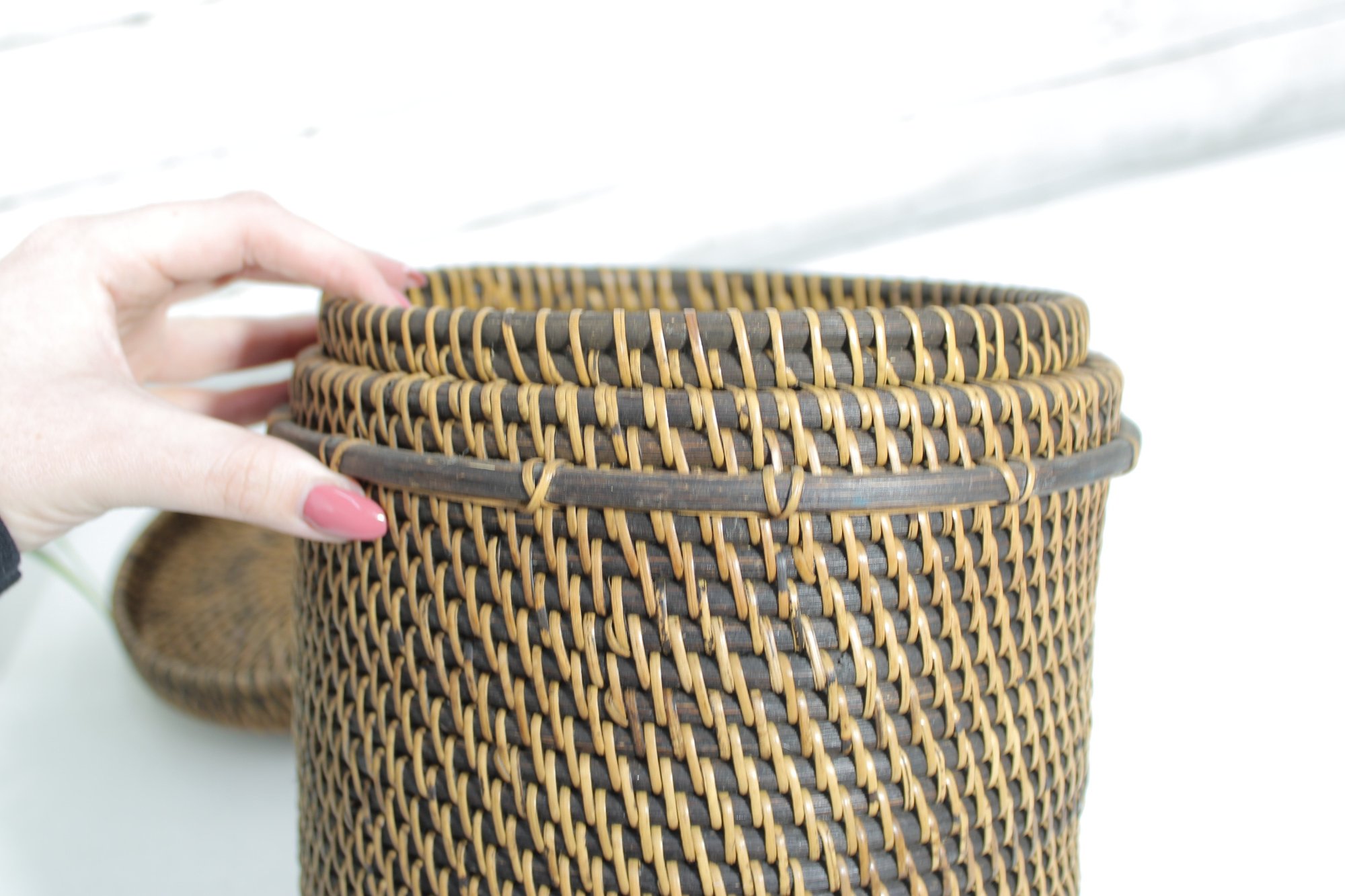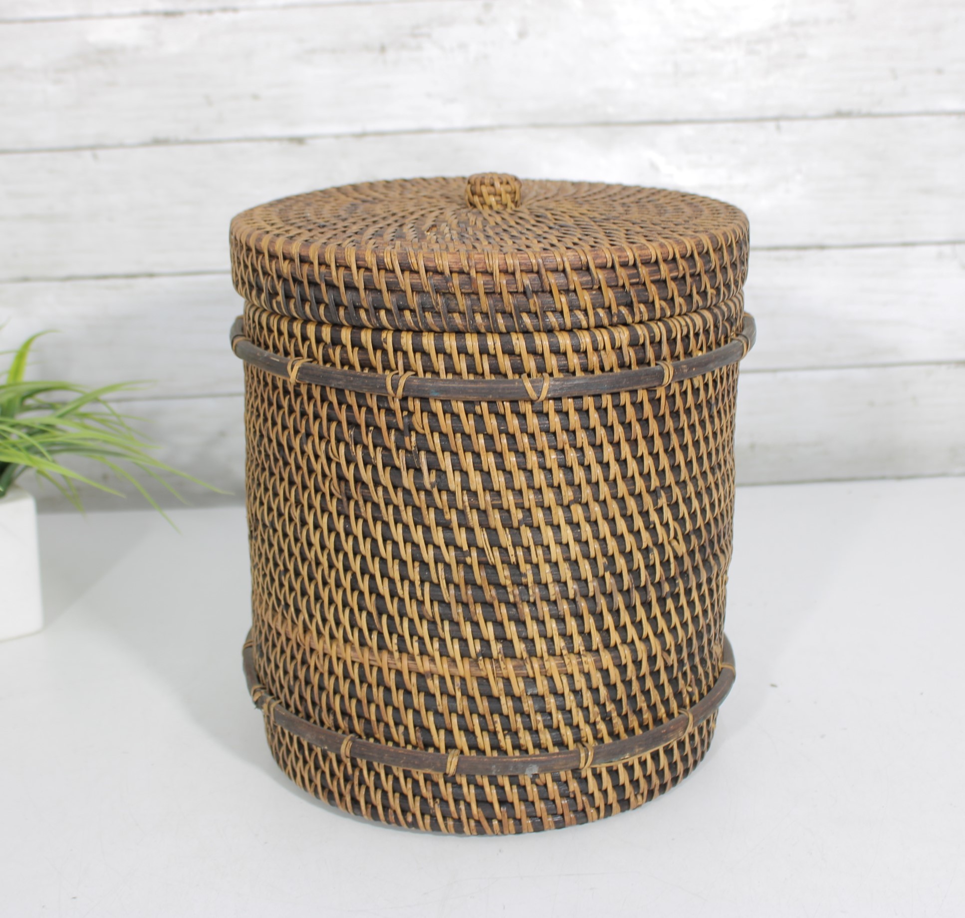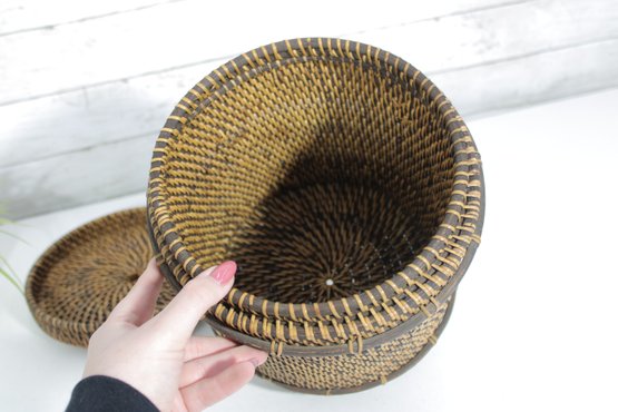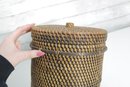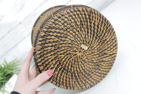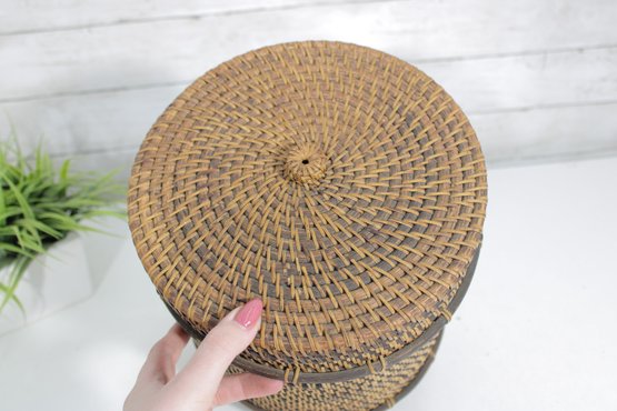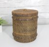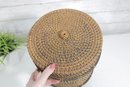 Woven Rattan Storage Basket W/ Lid Round Lidded Container Boho Decor 10.5 X 9