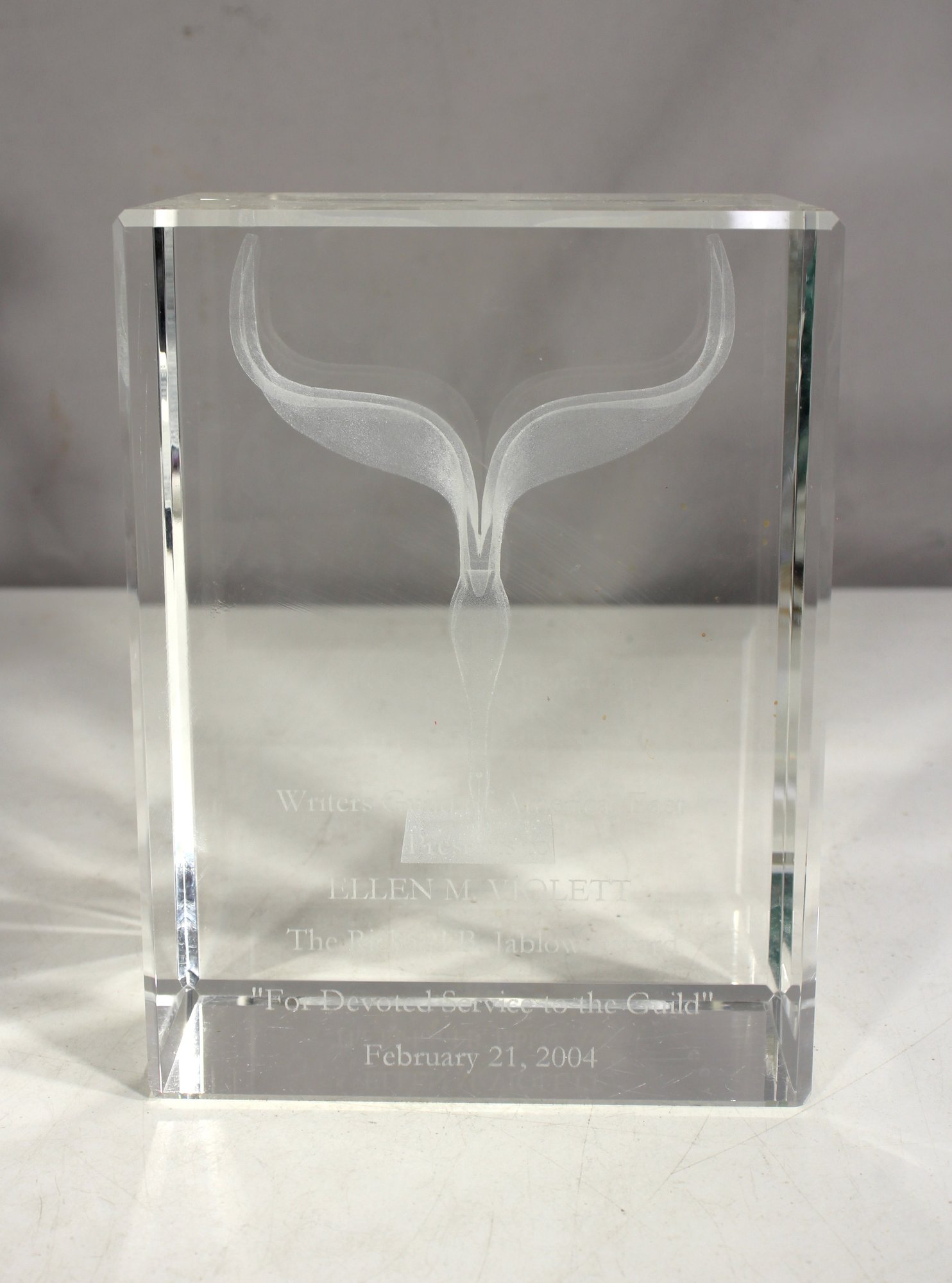 This is a prestigious crystal award trophy presented by the Writers Guild of America, East (WGAE) in 2004 to Ellen M. Violett for the Richard B. Jablow Award, which recognizes devoted service to the Guild.