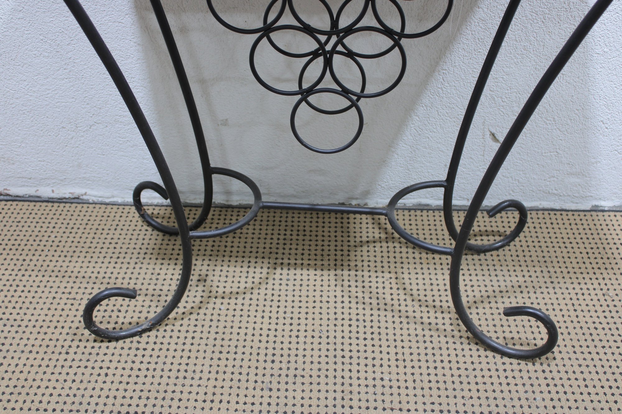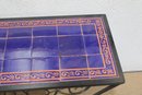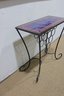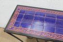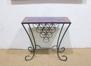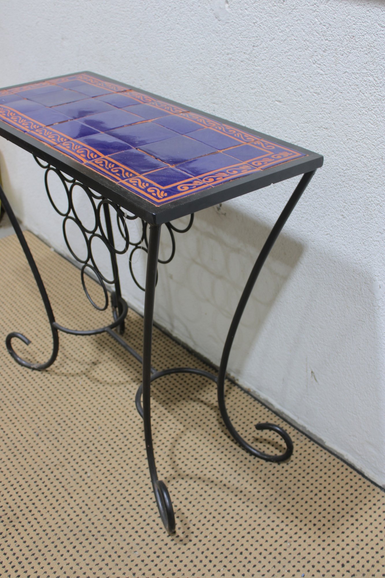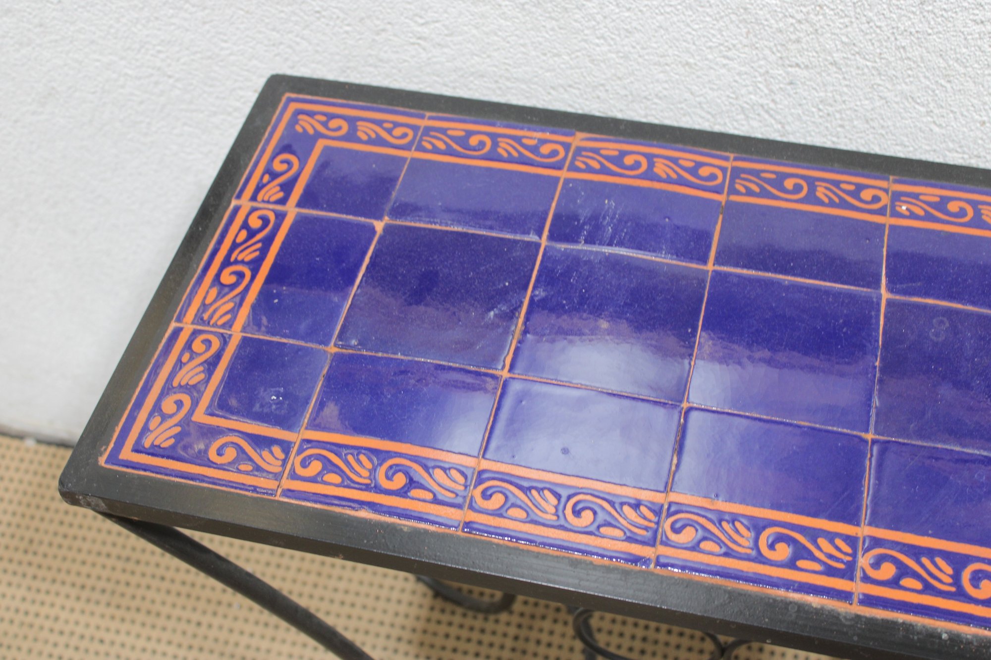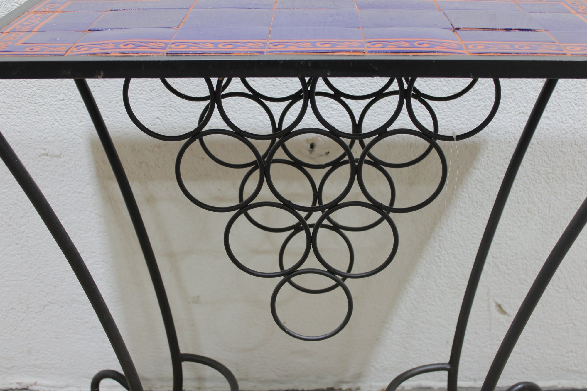a decorative wrought iron console table featuring a vibrant blue tile top and elegant scrollwork base. This eye-catching accent piece is perfect for an entryway, hallway, sunroom, or as a decorative sofa table.