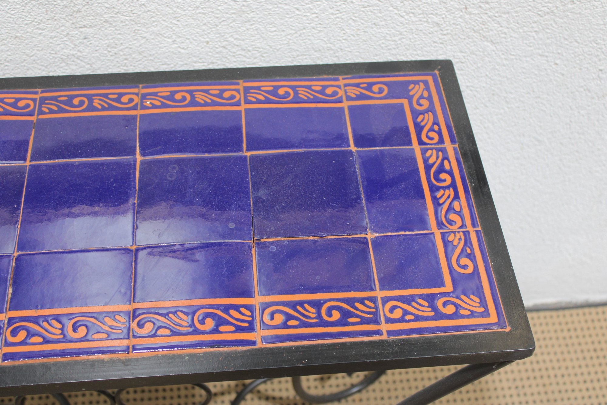 The rectangular top is finished with glossy cobalt blue tiles accented by an orange scroll border pattern. The rich color contrast gives the table a Mediterranean or Spanish-style flair. The sturdy black wrought iron base features curved legs and an attractive circular scroll design beneath the tabletop, adding both visual interest and structural support.
