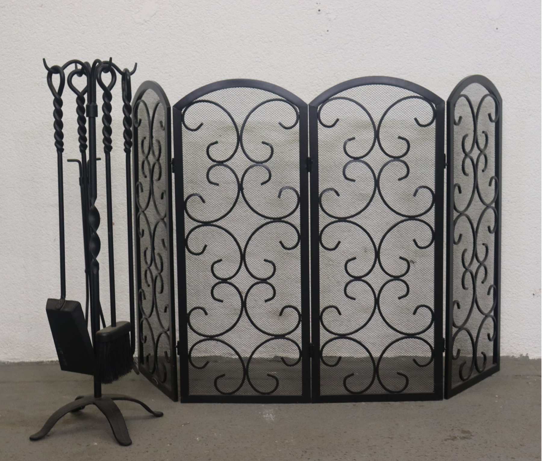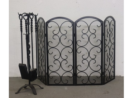 Wrought Iron Fireplace Hearth Screen And Fireplace Tools With Stand - Double Black