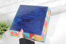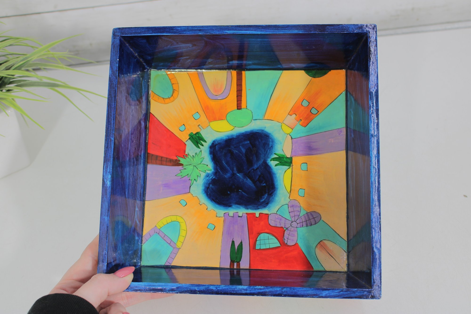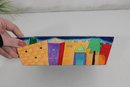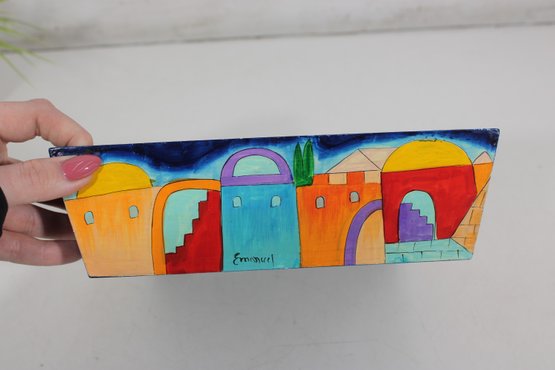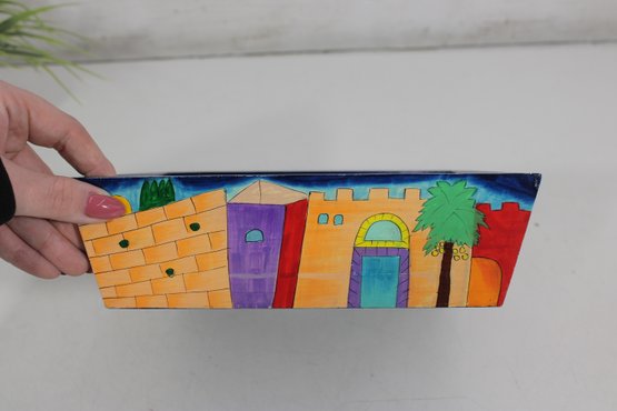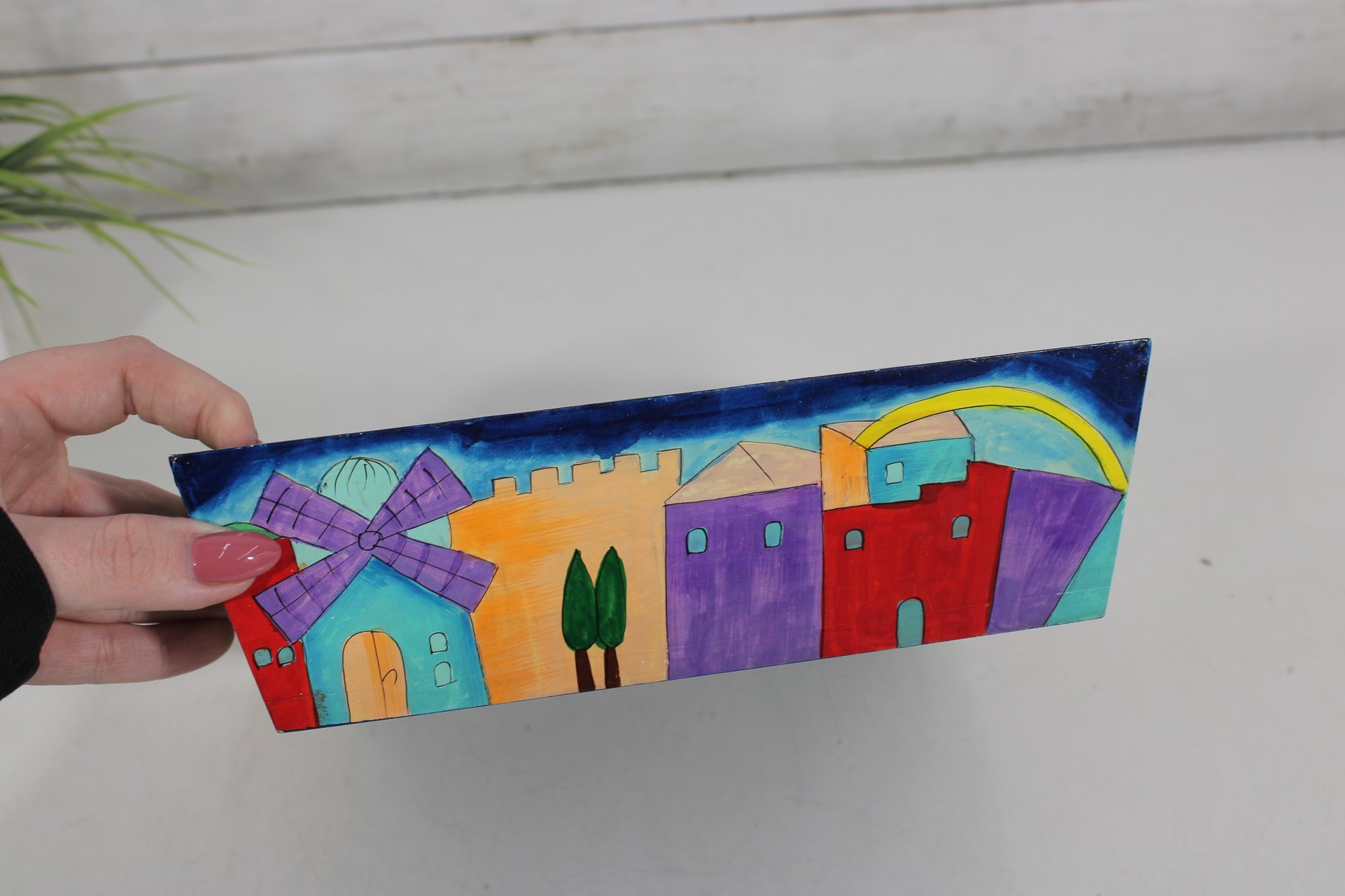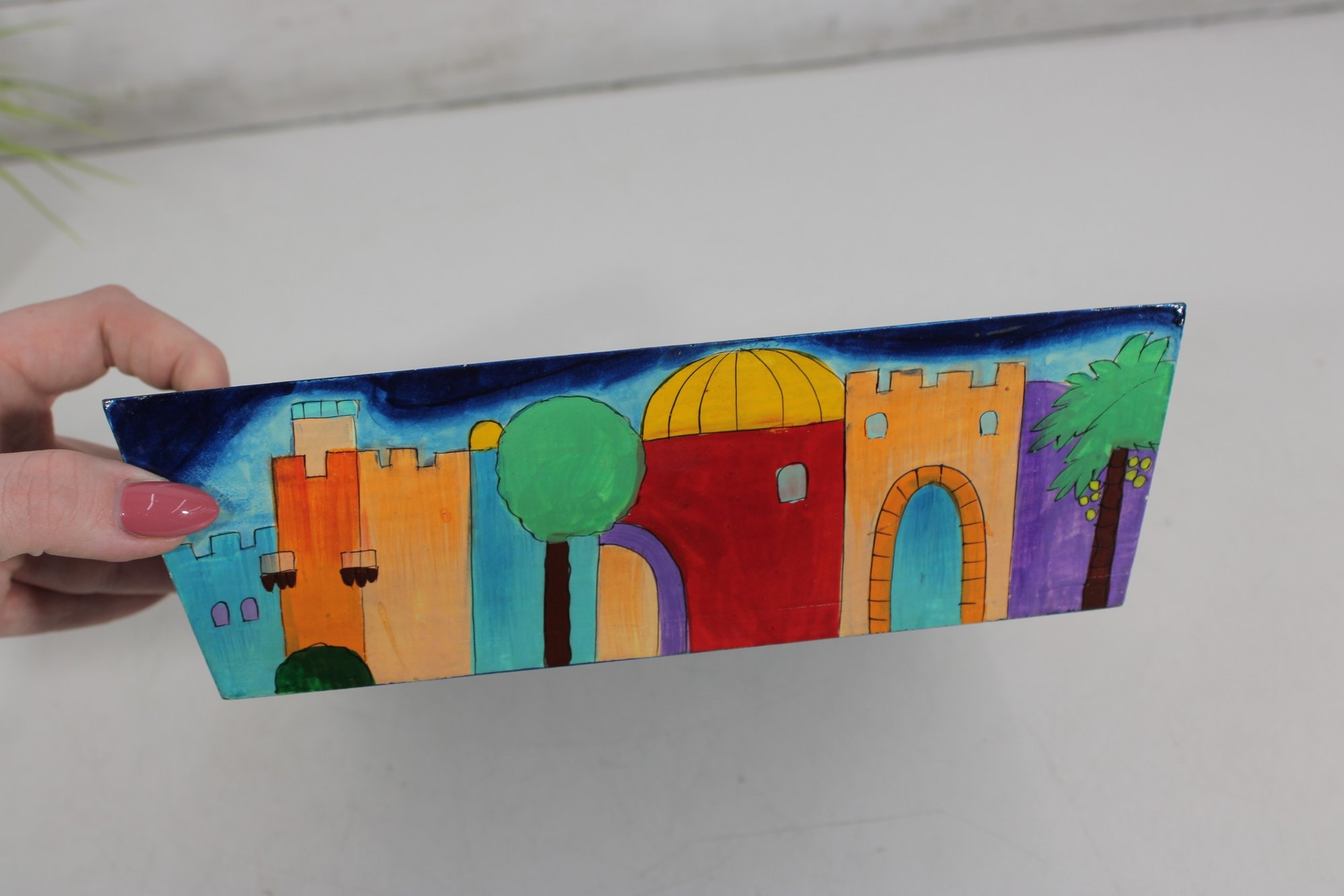 Colorful and vibrant Yair Emanuel wooden matzah tray, beautifully hand-painted with a Jerusalem cityscape design. This decorative Judaica piece features bright, bold colors and stylized architecture, typical of Emanuel’s distinctive artistic style.