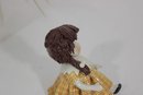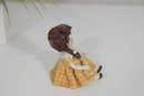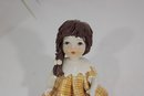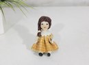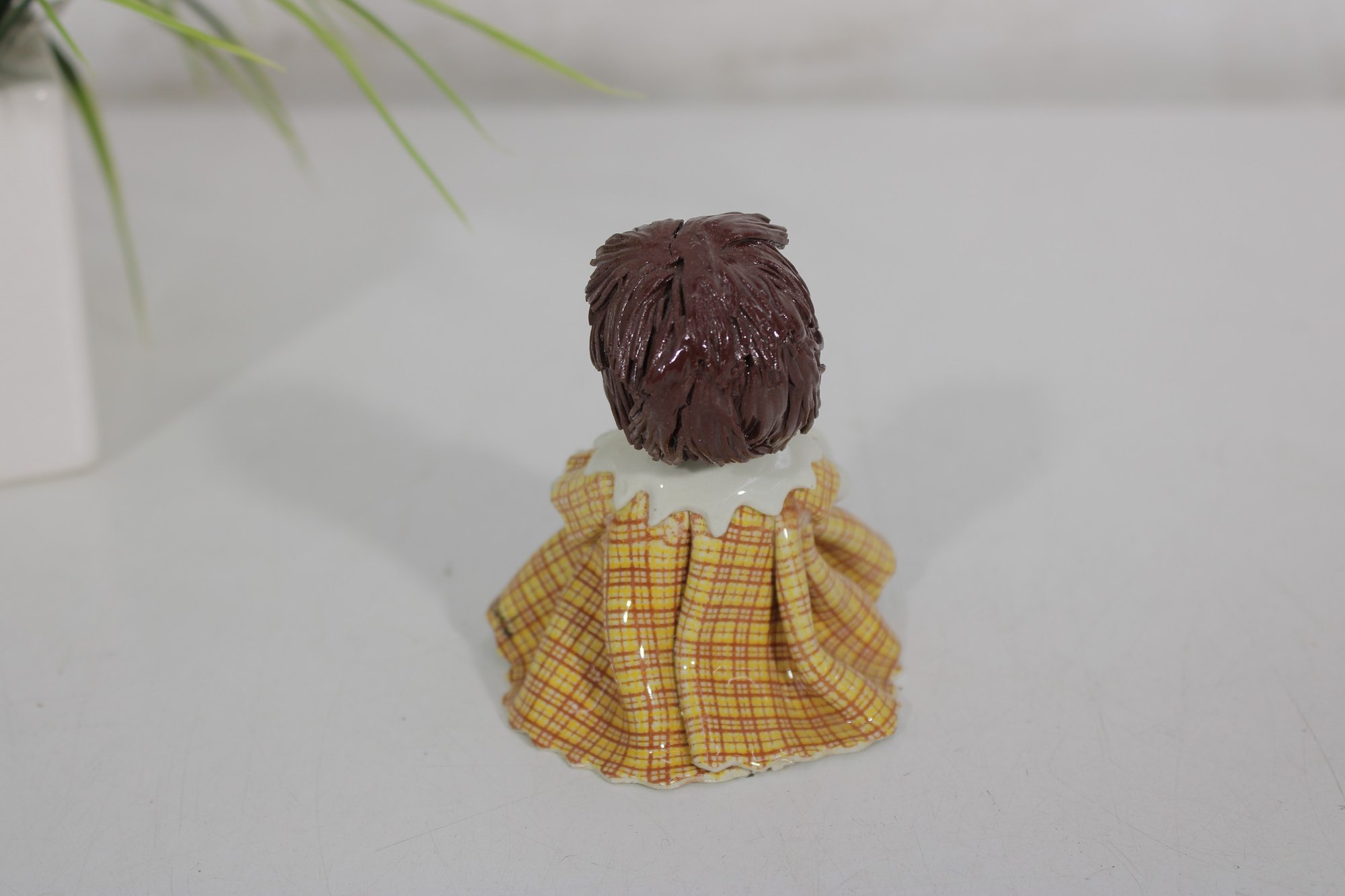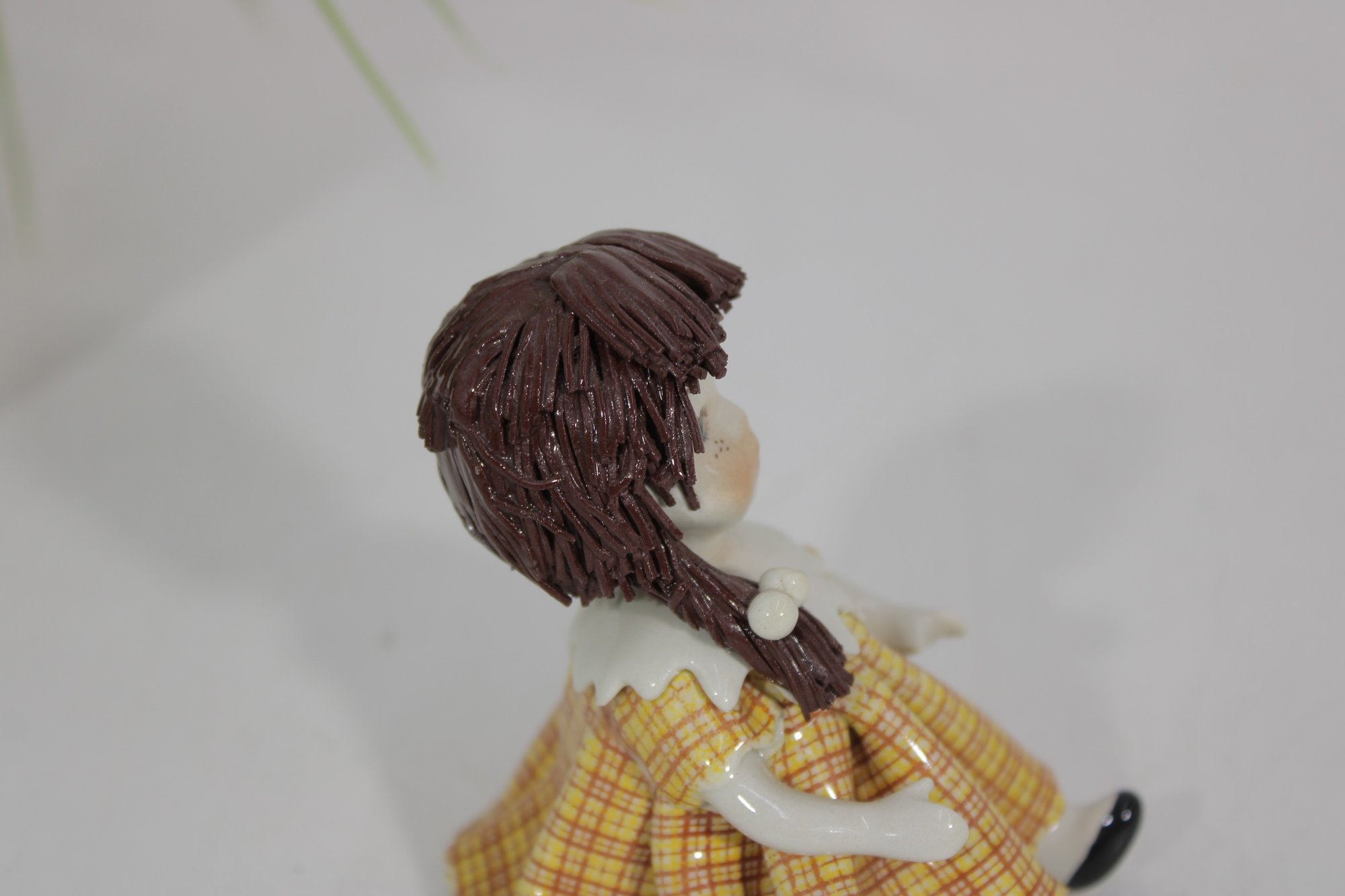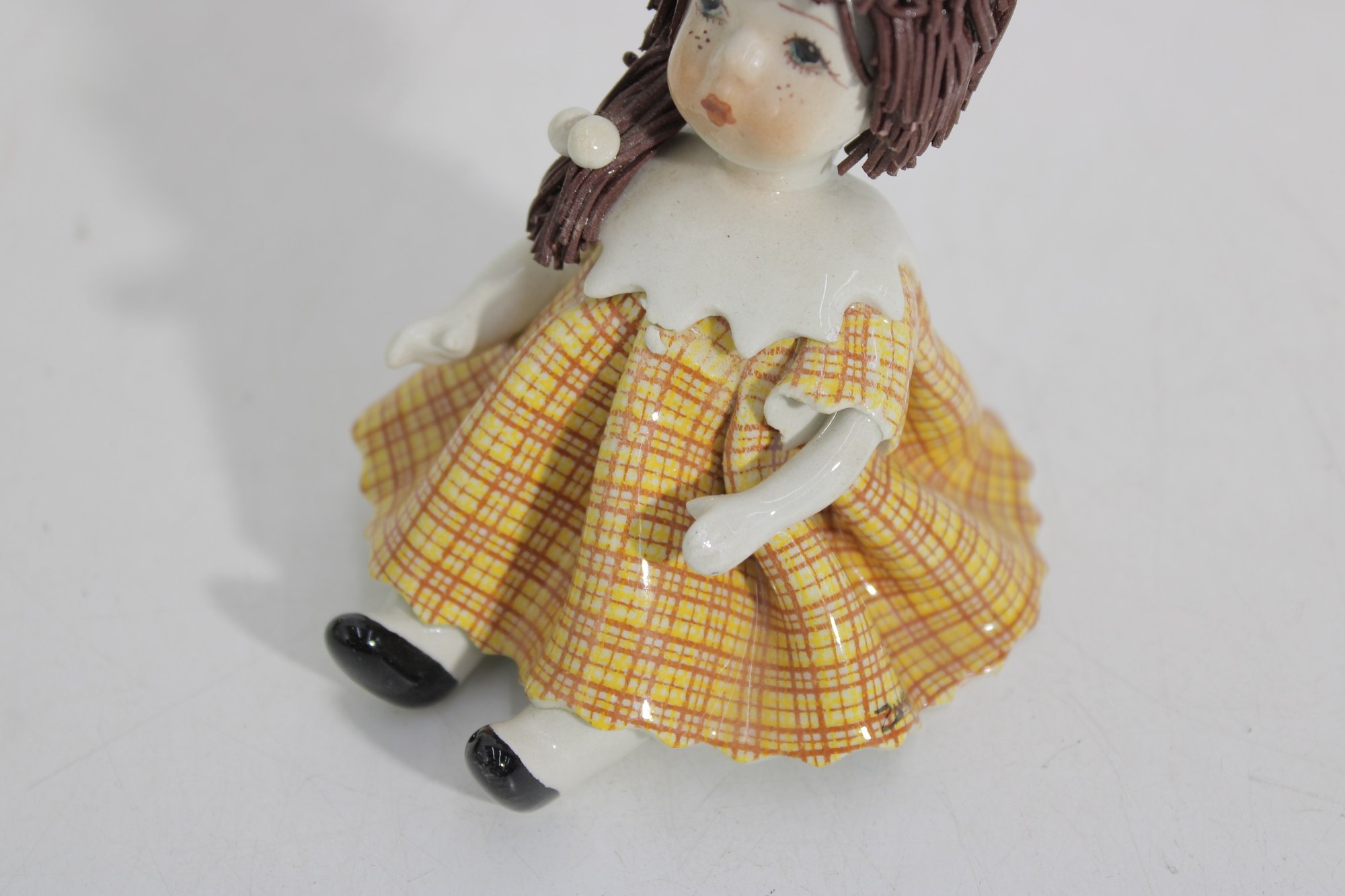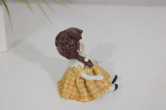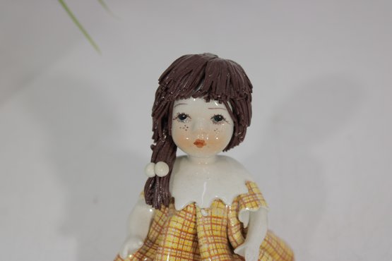 Adorable Zampiva ceramic doll figurine titled “Lisa”, handcrafted in Italy. This charming piece features a young girl with delicate hand-painted facial details, styled brown hair, and a cheerful yellow plaid dress with a flared skirt.