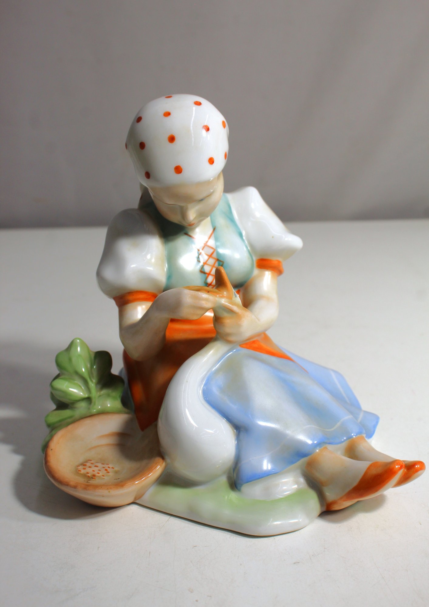 This charming Zsolnay Pécs porcelain figurine beautifully depicts a Hungarian village girl sitting while holding a bird. Hand-painted with vivid colors, the figurine showcases the delicate craftsmanship of Zsolnay, a renowned Hungarian porcelain manufacturer. The girl is dressed in traditional attire, with a lovely blue apron, a polka-dot scarf, and detailed accents. The figurine is marked on the base with the iconic Zsolnay Pécs stamp. A delightful piece for collectors of European porcelain or fans of folk art.