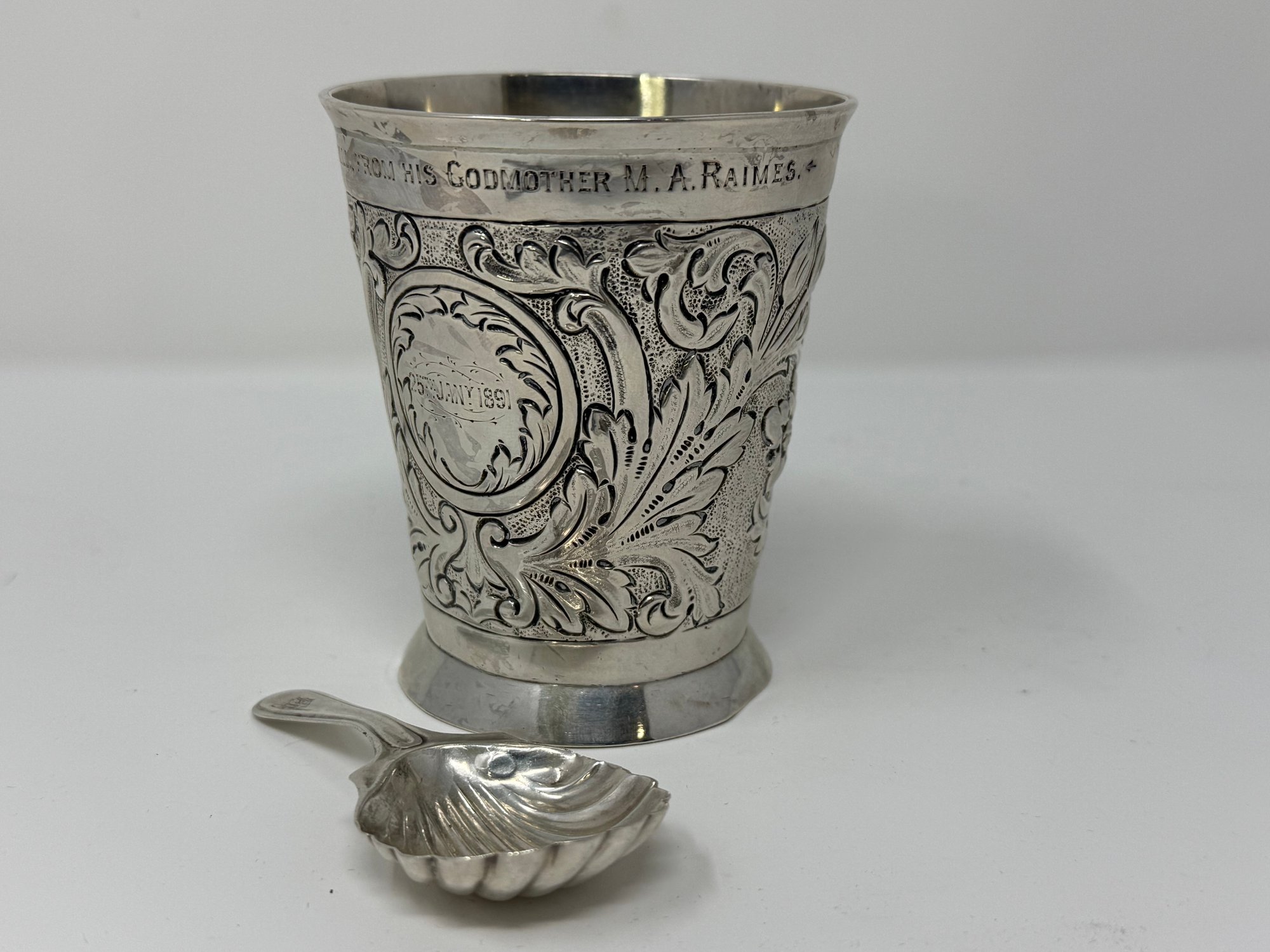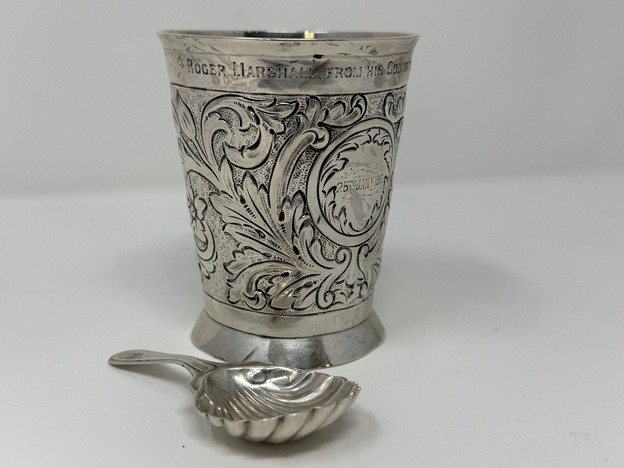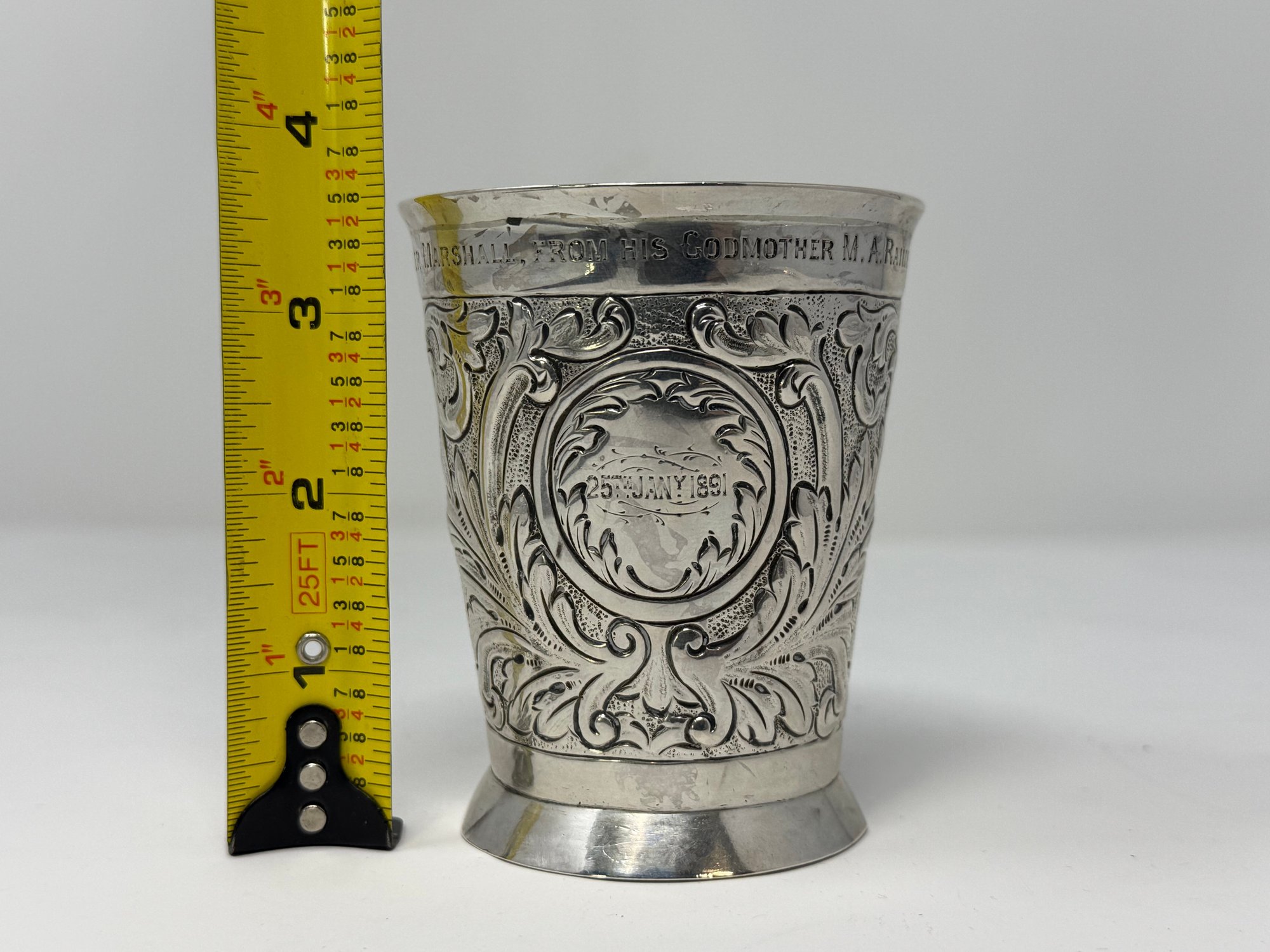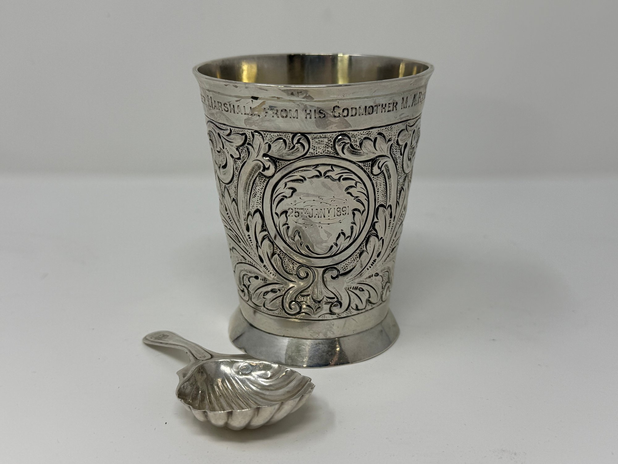 weighs a total of 134.37 grams, 4.32 Troy ounces, inscription is dated January 25th 1891, "Roger Marshall From His Godmother M.A. Raimes"