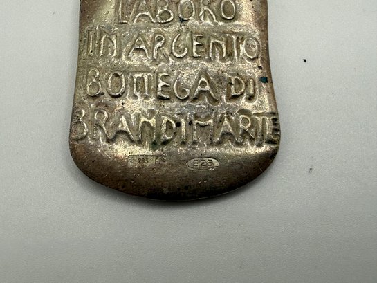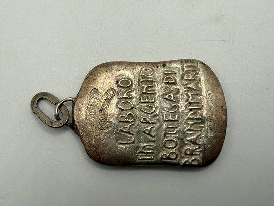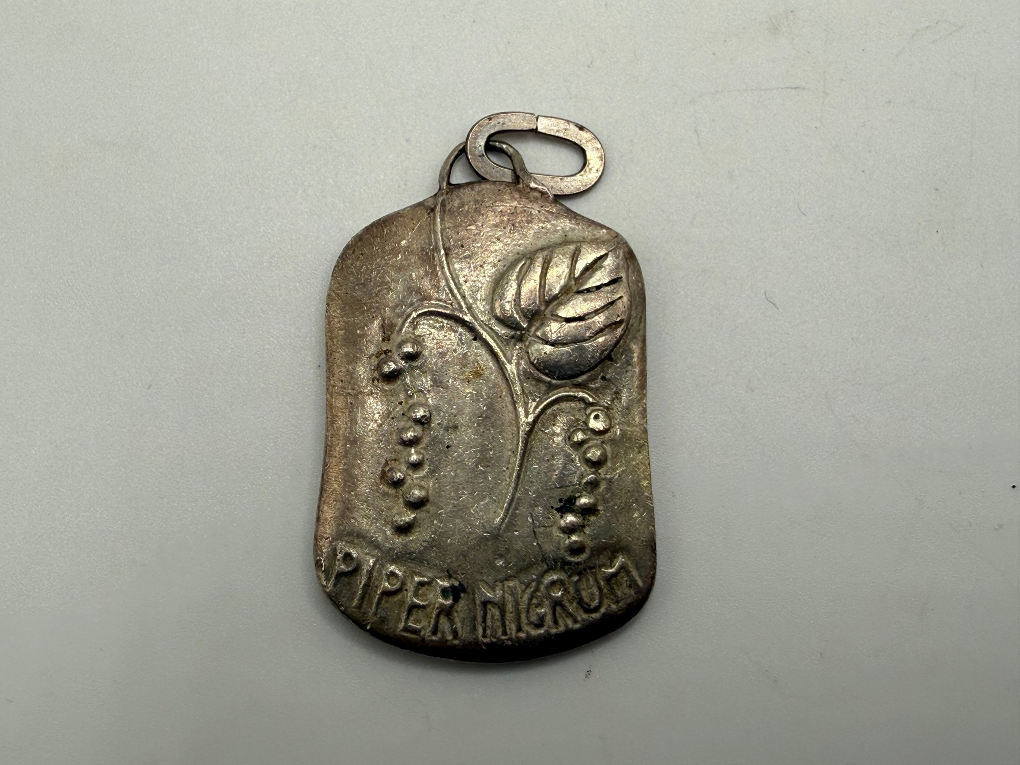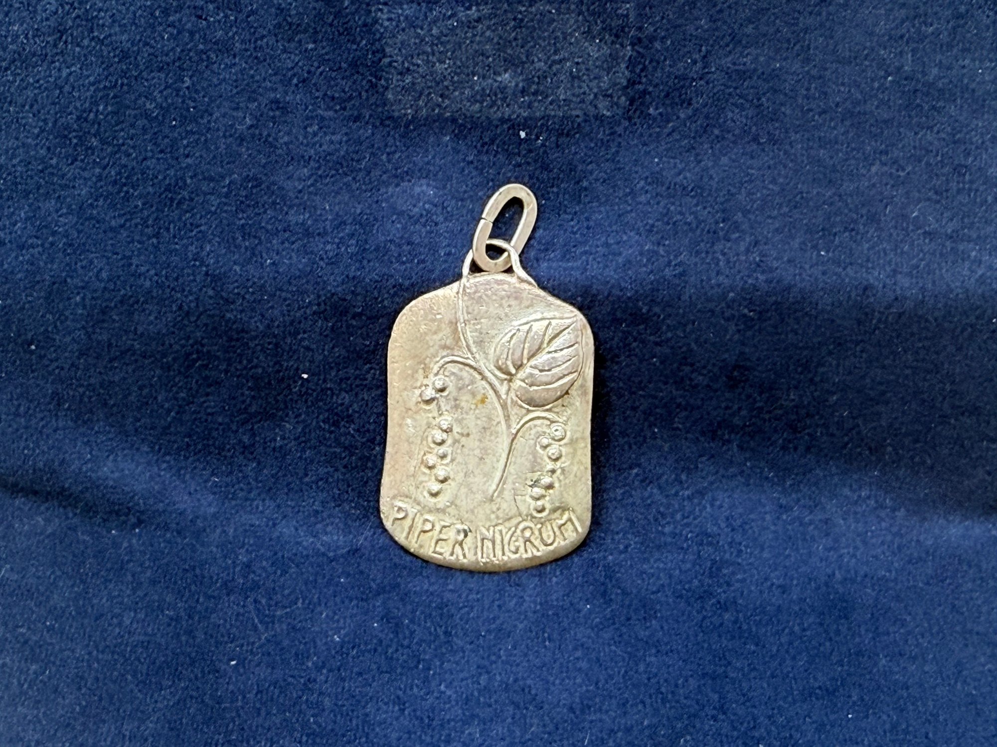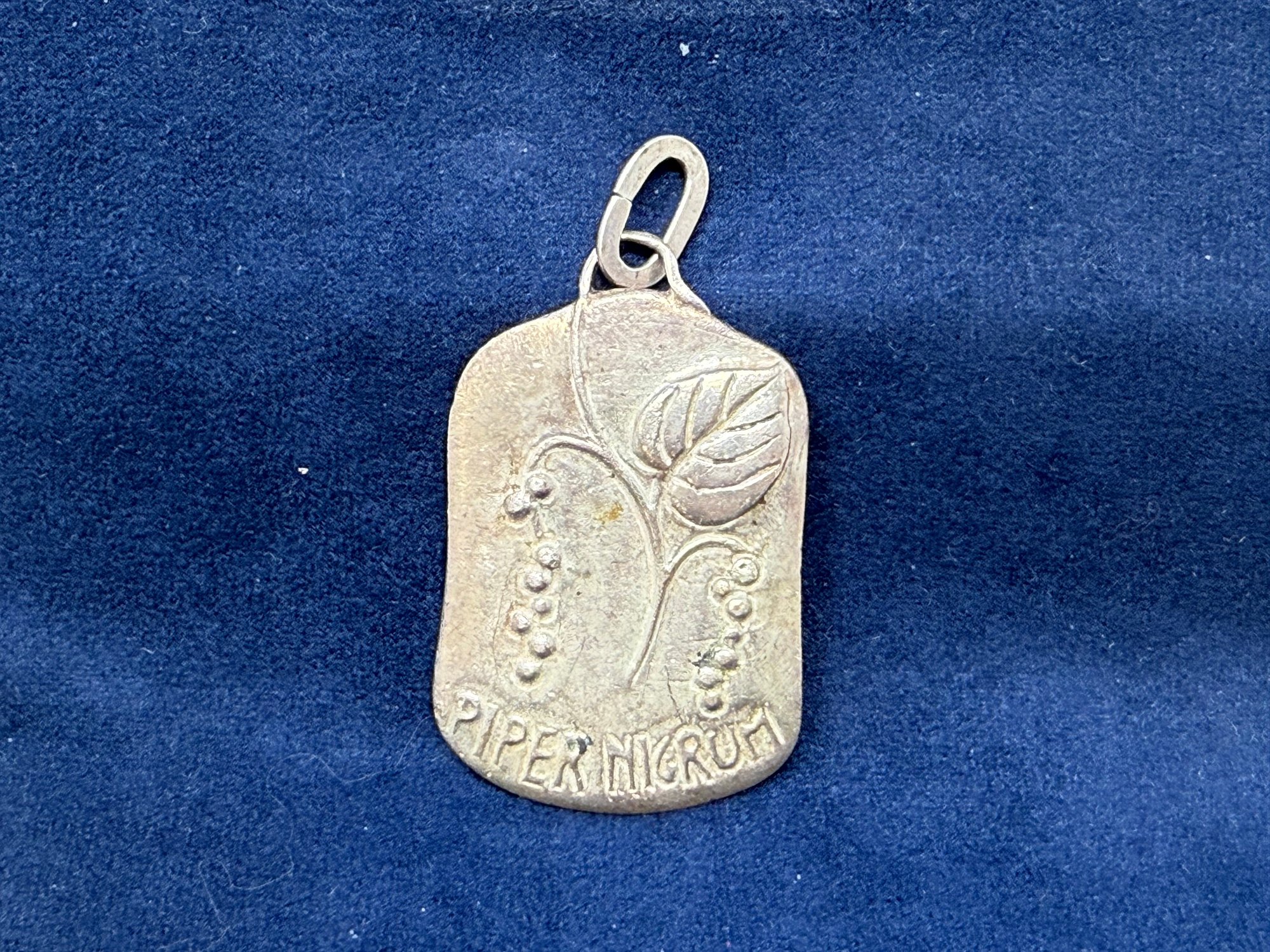 weighs over 36 grams; appears to be a tag for Black Pepper possibly by Brandimarte. The face reads "Piper Nigrum". The other side has a few marks. At the top is a mark from a drogheria, the middle reads "Laboro In Argento Bottega Di Brandimarte", with 925 at the bottom.