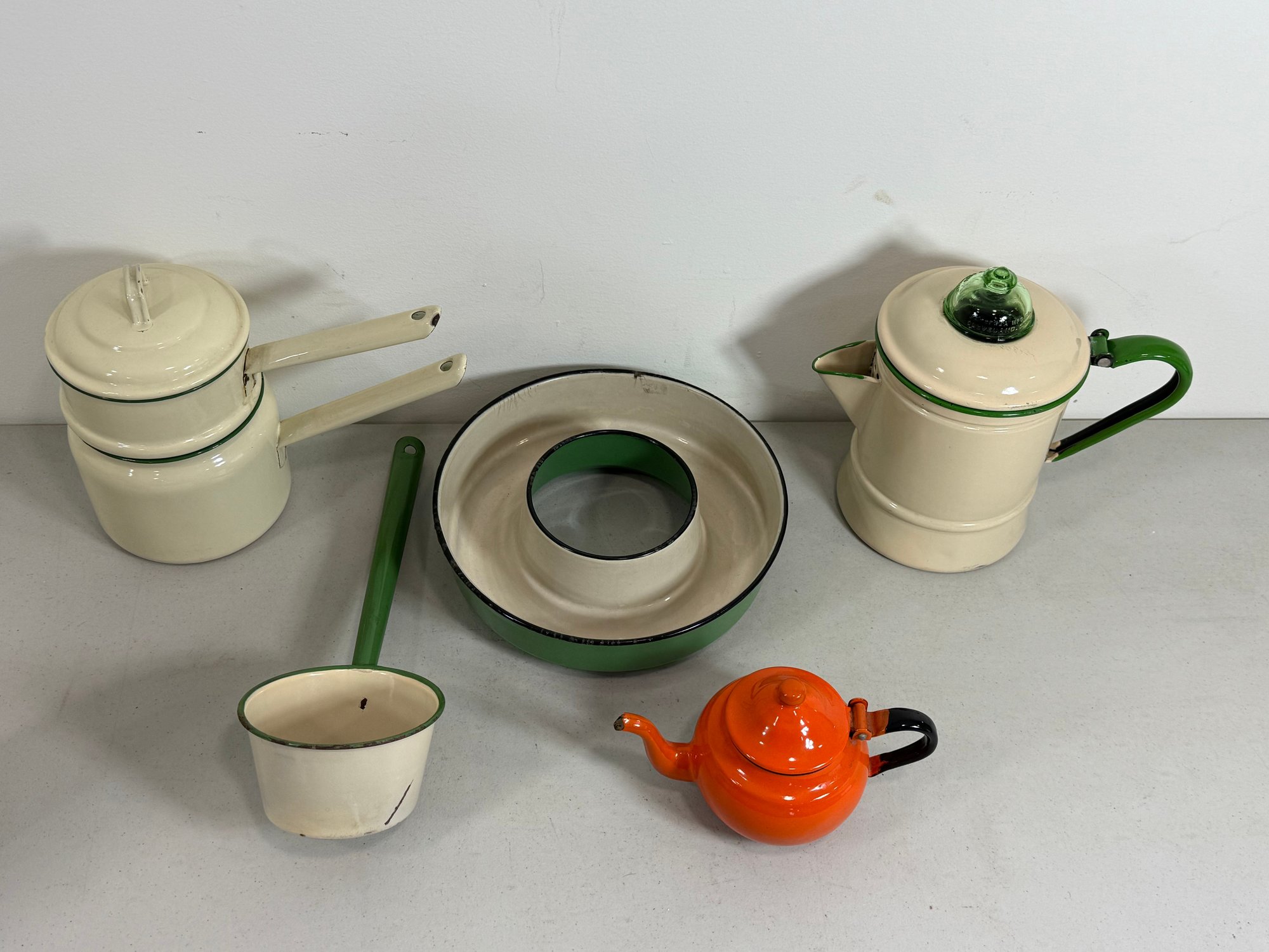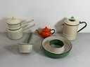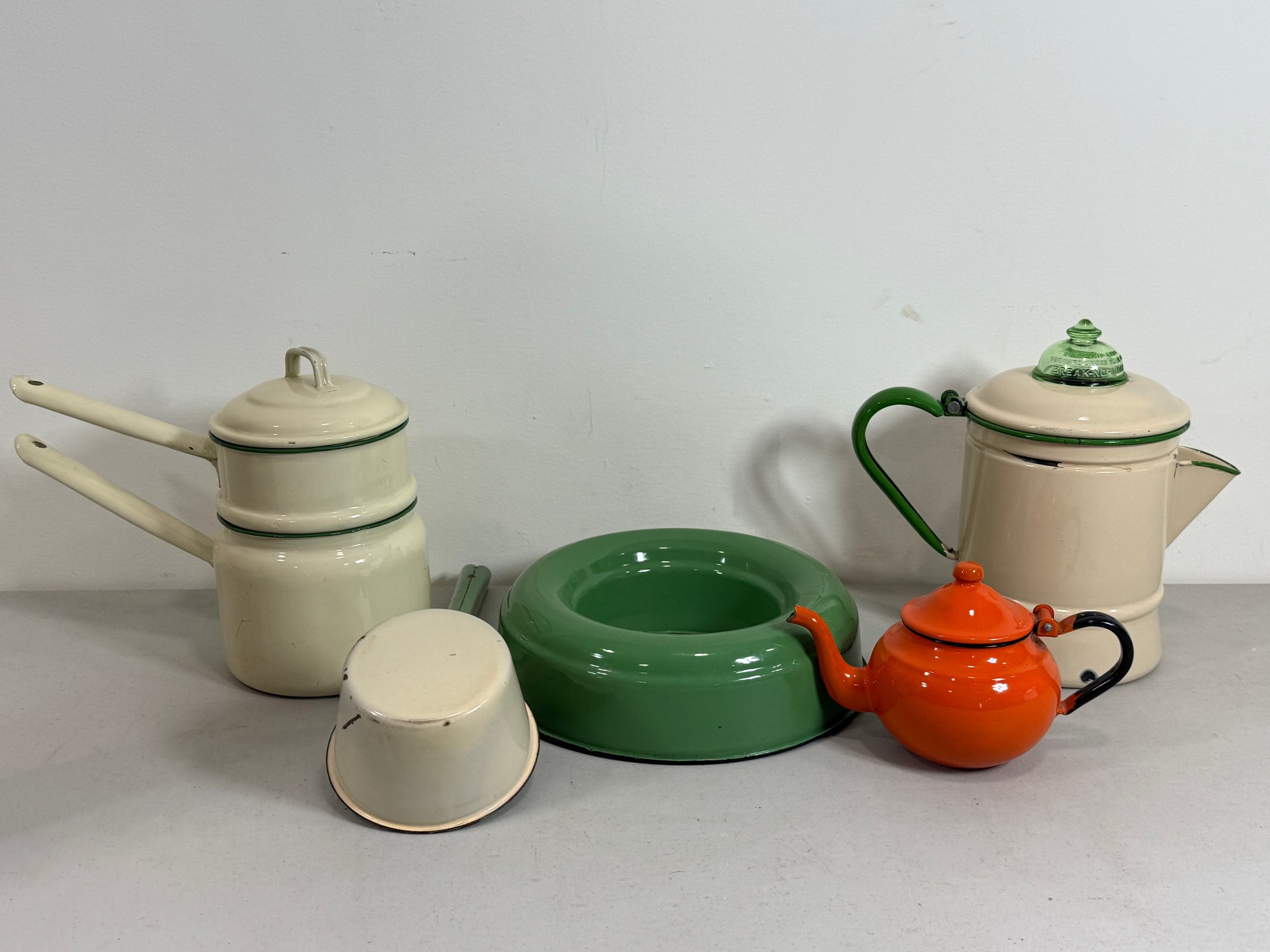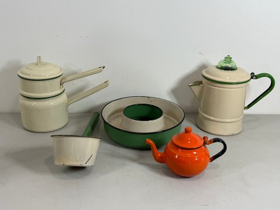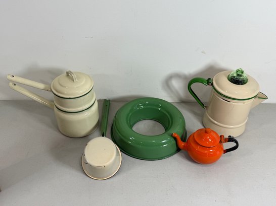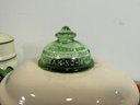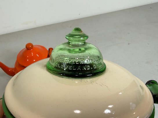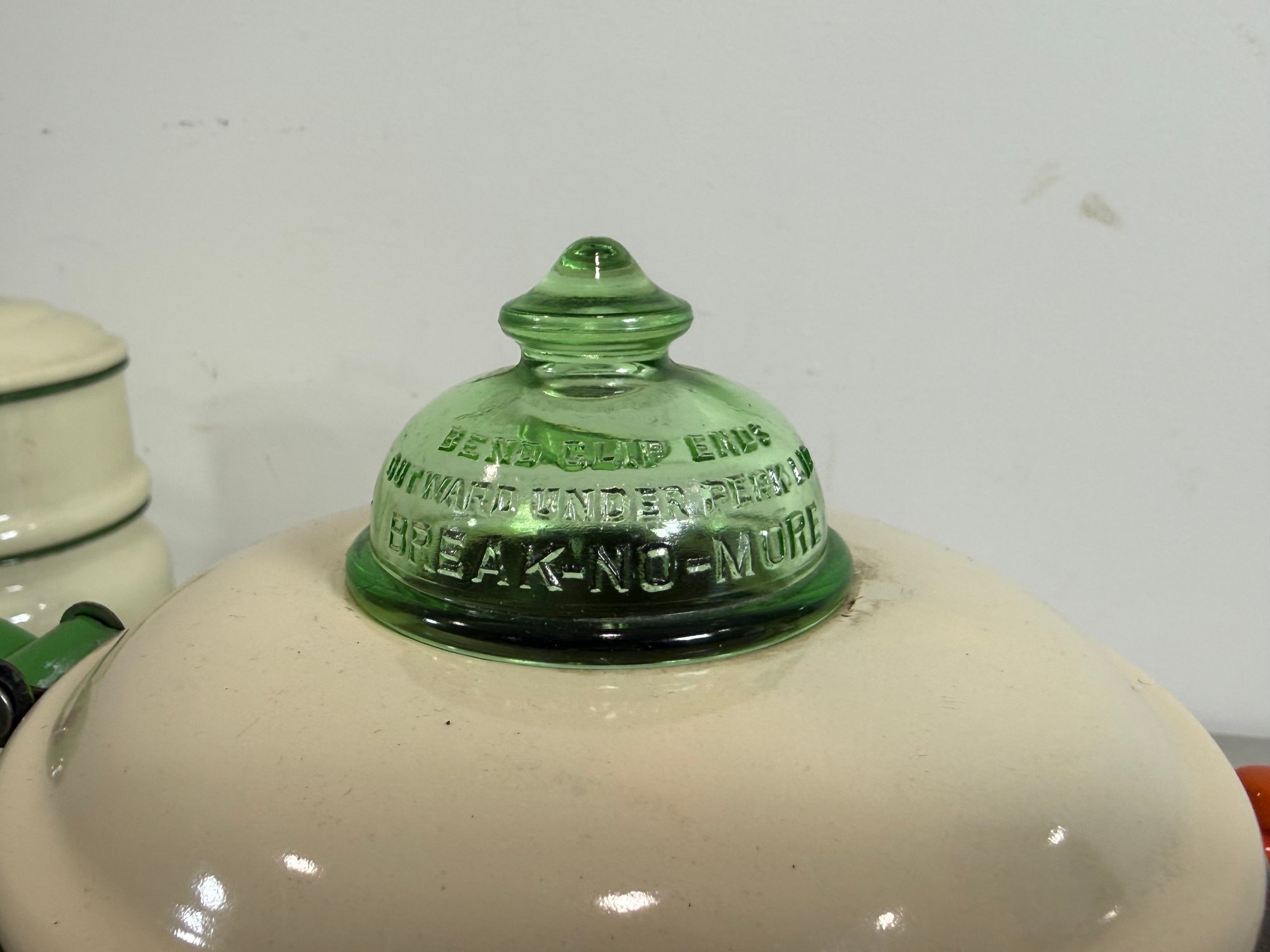9.5” Vaseline Glass Topped Coffee Pot, Pans, Double Boiler